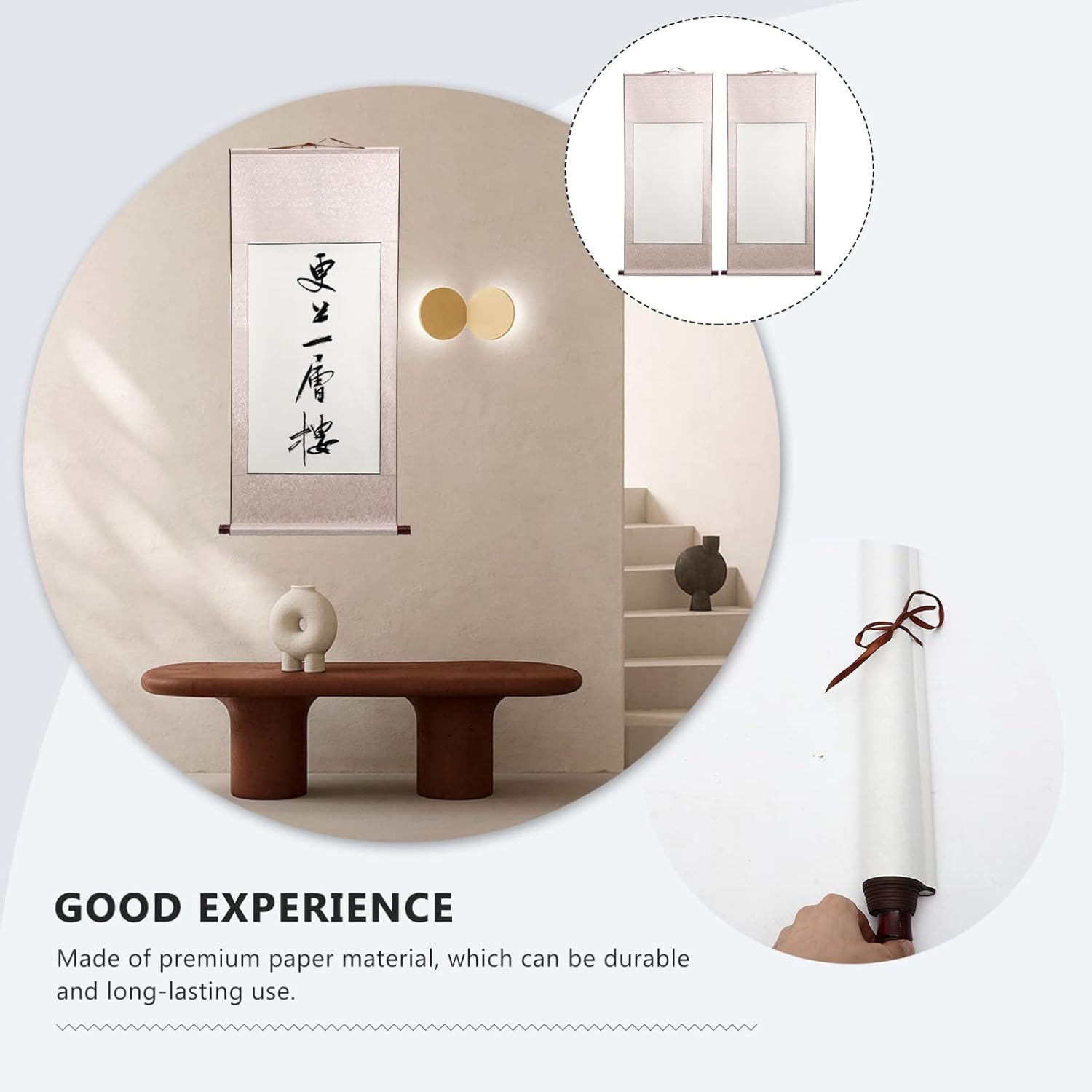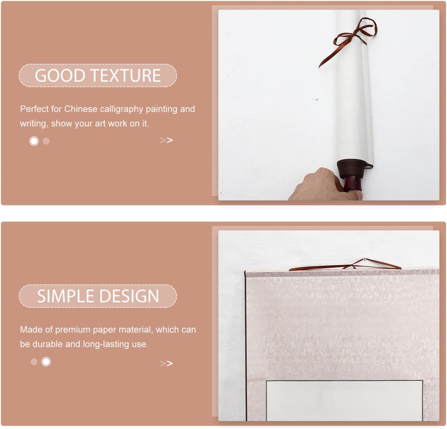 Adatto alla creazione di calligrafia, come scrivere un pennello in lettere a blocchi di piccole dimensioni e eseguire la calligrafia. Il design compatto, può essere archiviato a piacimento, non occupa spazio. Perfetto per la pittura e la scrittura cinesi di calligrafia, mostra la tua opera d'arte su di . Realizzato in materiale di carta , può essere resistente e di lunga durata. La carta per scorrimento cinese è anche ottima per appendere nel muro dopo la finitura, la carta di decorazione per la casa e l'ufficio.