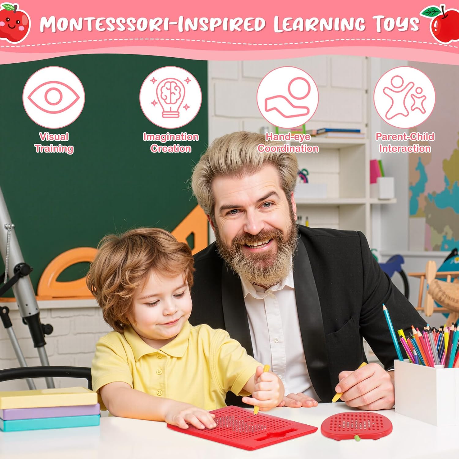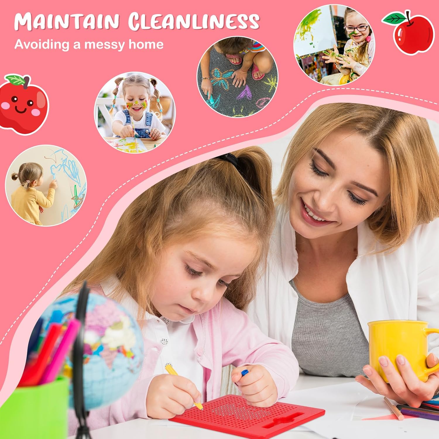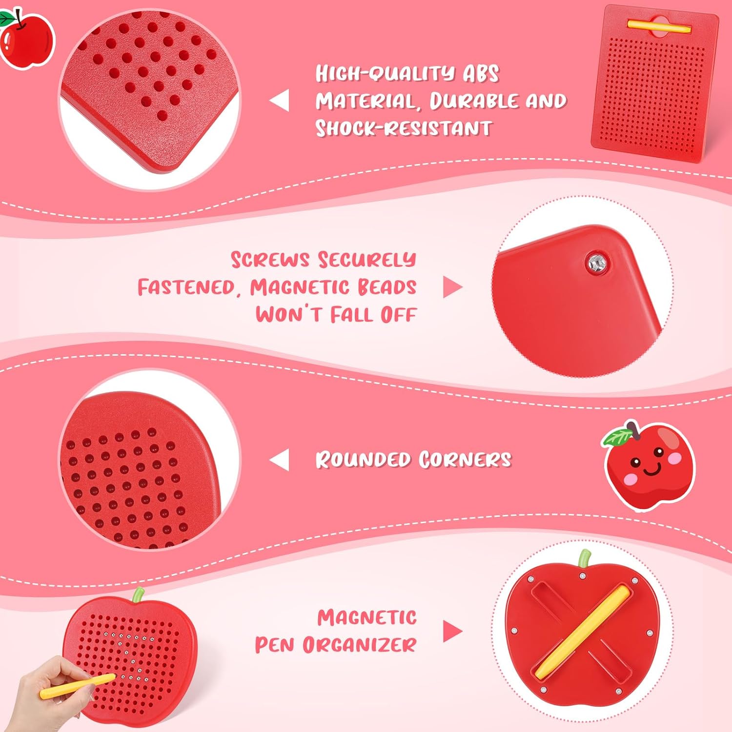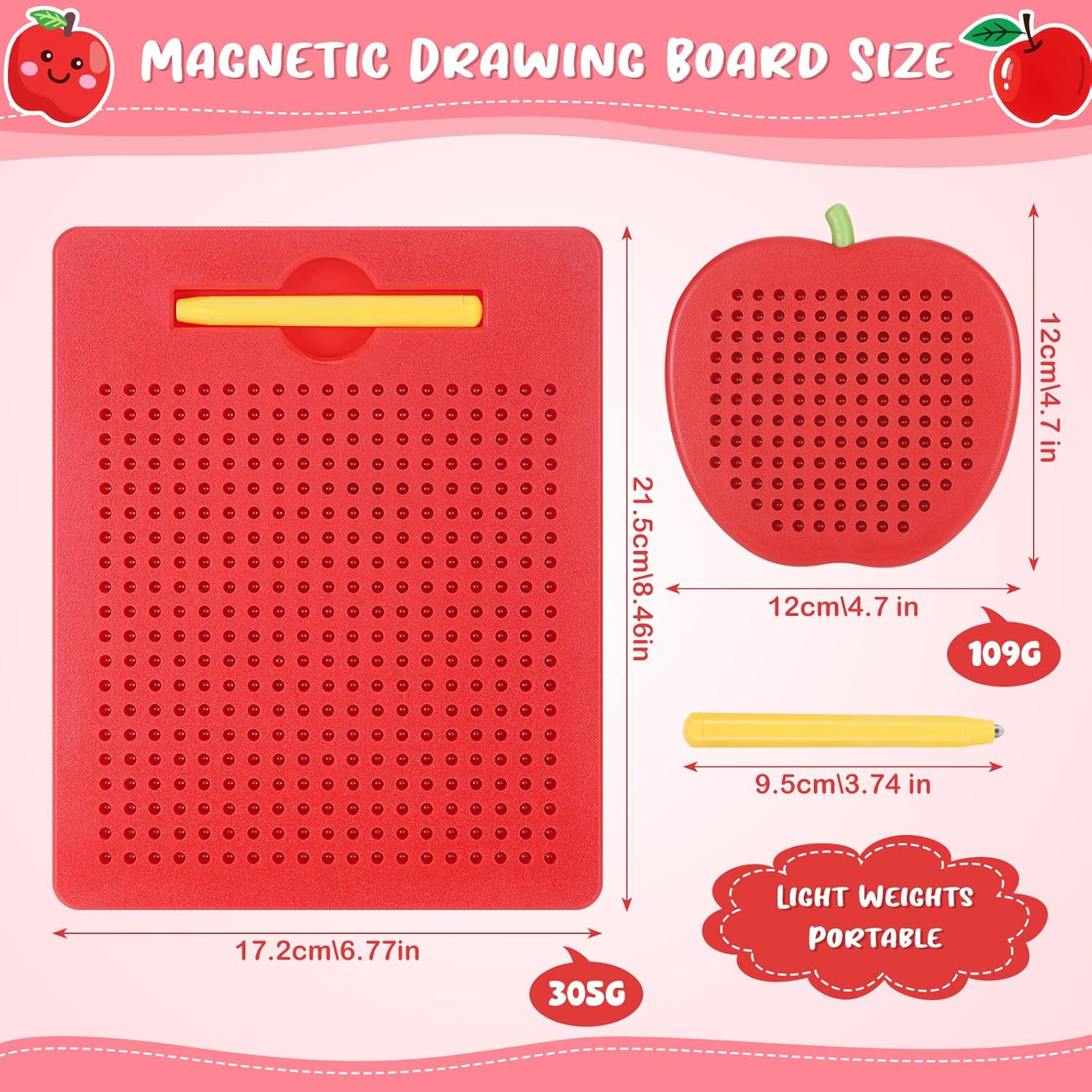 【Doppio Divertimento Magnetico per Disegnare】 Questo set include una classica lavagna magnetica rettangolare (17,5x22 cm) e un’adorabile tavoletta a forma di mela (12 cm di diametro). Entrambe utilizzano la tecnologia a sfere magnetiche per disegnare senza sporcare. Le dimensioni compatte e la penna magnetica inclusa (10 cm) le rendono perfette da portare ovunque. 【Sicurezza e Durabilità Garantite】 La sicurezza è fondamentale. La nostra lavagna magnetica per bambini è realizzata in plastica ABS atossica e di alta qualità. Le sfere magnetiche sono sigillate all’interno della tavoletta – più grandi dei fori, per evitare che si stacchino. Gli angoli arrotondati e la struttura robusta con viti offrono ulteriore tranquillità ai genitori. 【Creatività Senza Sforzo per Piccoli Artisti】 Divertimento semplice e intuitivo! I bambini sollevano le sfere magnetiche con la punta della penna per disegnare linee, numeri, lettere o immagini sulla lavagna rossa o su quella a forma di mela. La cancellazione è immediata – basta premere leggermente le palline con il lato piatto della penna o con un dito. Nessuna configurazione, nessuna batteria, solo gioco creativo all’istante. 【Supporta l’Apprendimento Precoce e lo Sviluppo delle Abilità】 Uno strumento educativo prezioso. Oltre al divertimento, questa lavagna magnetica a sfere promuove lo sviluppo essenziale. Usare la penna e le palline migliora la motricità fine, la coordinazione occhio-mano, il ragionamento spaziale e le prime abilità di scrittura/disegno. Favorisce concentrazione, pazienza e problem-solving creativo durante il gioco. 【Design Compatto per Combattere la Noia Ovunque】 La soluzione ideale per intrattenere in movimento. Con dimensioni ridotte (17,5x22 cm e 12 cm di diametro), questo set di lavagne magnetiche è estremamente portatile. Si infila facilmente in uno zaino, una borsa per pannolini o la tasca del seggiolino auto. Perfetto per viaggi lunghi, sale d’attesa o momenti di relax a casa, distogliendo i bambini dagli schermi con un gioco creativo e coinvolgente.