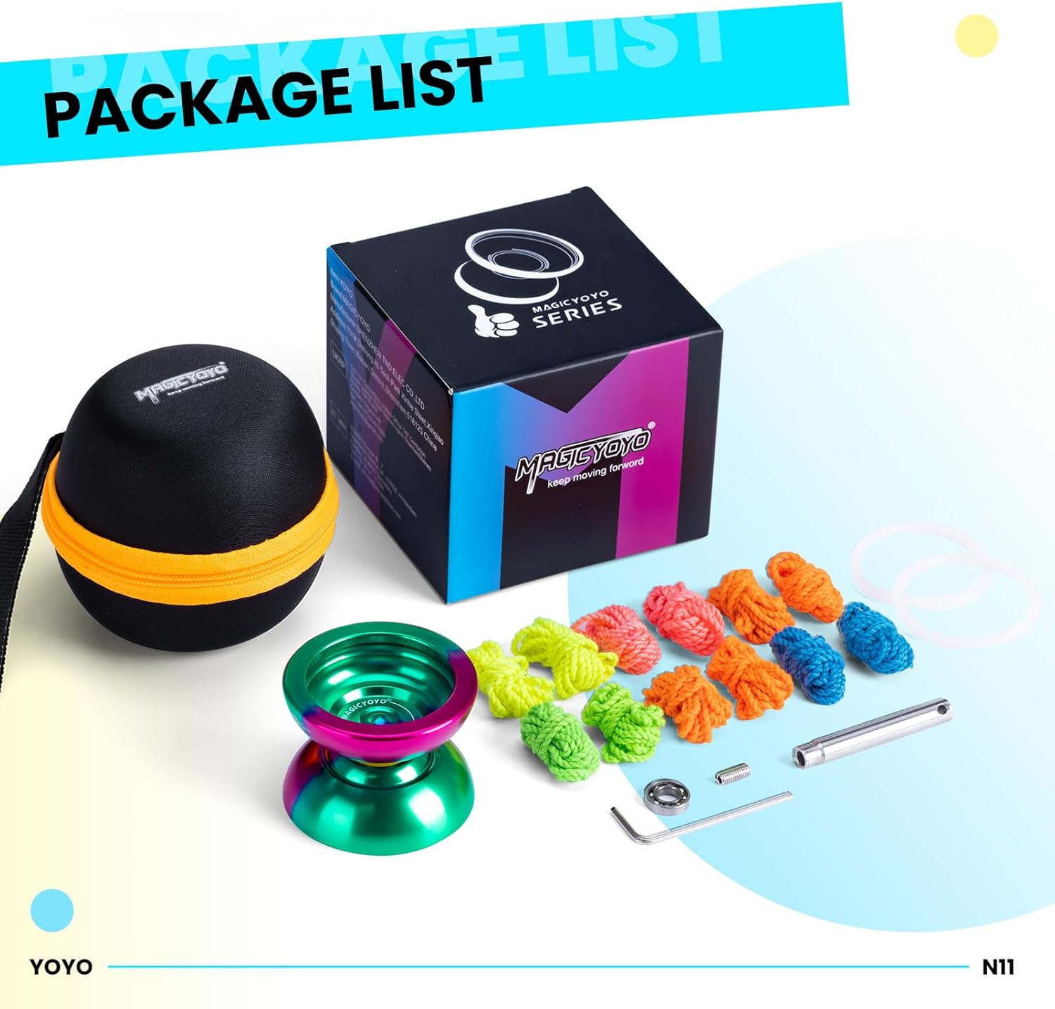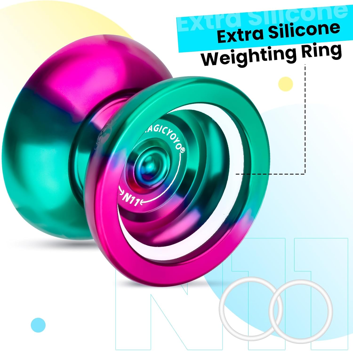 Un classico Yoyo di cui ti puoi fidare: Metal Yoyo N11 è uno dei classici più popolari di MAGICYOYOYO. Noto per le sue prestazioni eccezionali e il design innovativo, è diventato la scelta migliore per innumerevoli appassionati di Yo-Yo. Che tu sia un principiante che fa i tuoi primi passi nel mondo degli Yoyo-Yos, o un professionista esperto alla ricerca di un compagno affidabile, l'irresponsabile Yoyo N11 non ti deluderà. Anelli in gomma: ciò che rende il professionista yoyo N11 davvero speciale sono i suoi esclusivi anelli in gomma. Questi non si trovano su yo yos ordinari. Gli anelli ponderati migliorano la stabilità dello yo-yo e consentono lanci più fluidi e un controllo più preciso. Distinguiti con un design a teschio festivo: il magico yoyo N11 presenta un design unico e sorprendente del teschio che aggiunge un tocco di fascino simile a un festival. Questo look unico lo distingue da qualsiasi altro Yo Yo sul mercato. Sia che tu ti esibisca davanti a un pubblico o semplicemente pratichi nel parco, il design del pro yoyo N11 ti renderà il centro dell'attenzione. Splendida finitura anodizzata: lo strato esterno è trattato con un processo di anodizzazione che non solo resiste ai graffi e all'usura ma mantiene anche i vivaci colori rosa verde freschi e vivaci. Che tu stia allenando o sul palco, il trucco yoyo N11 sarà il tuo Yo-yo più elegante e affidabile. Design a doppia funzione per tutti i livelli di abilità: questo Yo-yo offre la flessibilità sia delle modalità reattive che non reattive. La semplice sostituzione del cuscinetto e dell'asse consente ai principianti di iniziare la modalità di risposta per padroneggiare facilmente i trucchi di base. Se vuoi progredire e sfidare te stesso con manovre basate su corde più complesse, passa alla modalità non rispondente. È come avere due yoyo in uno! Costruzione in metallo di qualità: realizzato in alluminio di alta qualità, il responsive yoyo N11 è leggero ed estremamente resistente. Può resistere alla gravità degli esercizi frequenti e ad alta intensità. La costruzione in metallo professionale garantisce un eccellente equilibrio e stabilità, in modo da poter eseguire con facilità anche i trucchi più complicati.