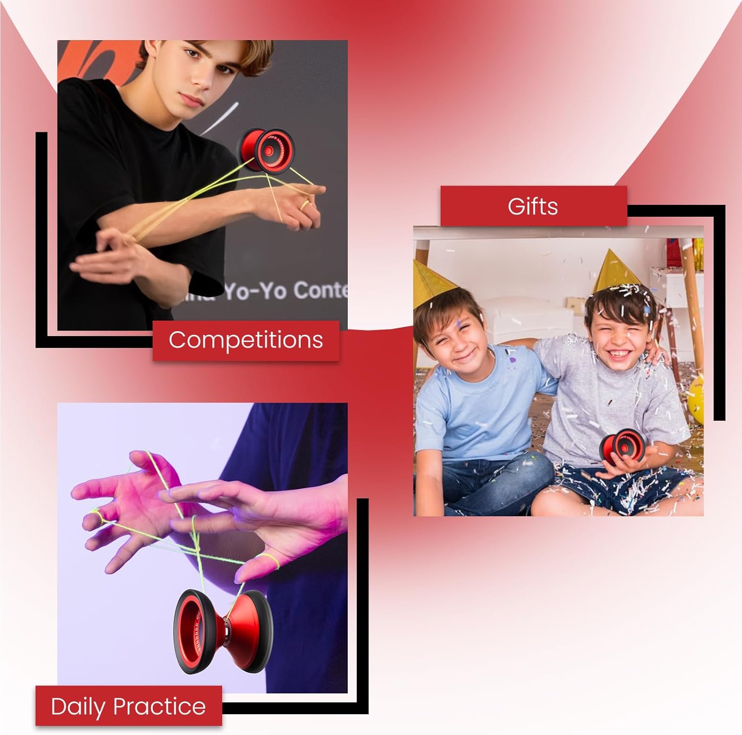 Design a punta alta per trucchi D-N-A migliorati: il MAGICYOYO V13 presenta un design unico del cappuccio delle dita cave, che rende i trucchi D-N-A-jojo più facili da imparare ed eseguire altre manovre avanzate. Migliora il controllo delle dita, consente trucchi yo avanzati e migliora la sensazione generale dello yoyo. Personalizza la tua esperienza: il MAGICYOYO V13 offre sia una modalità jojo reattiva che irresponsiva, che lo rende perfetto per i giocatori di qualsiasi livello di abilità. In modalità reattiva, Yoyo ritorna automaticamente con una semplice mossa, ideale per i principianti. In modalità irresponsiva, i giocatori devono imparare la tecnica "BIND" per recuperare lo Jo Jo, il che è una sfida per utenti di livello medio e avanzato. Design elegante: il MAGICYOYO V13 colpisce per un design accattivante, un corpo in metallo rosso combinato con un esterno nero del PC. Questa combinazione crea un effetto visivo davvero interessante, rendendo questo JoJo un assoluto eye-catcher sia durante le manovre di gioco artistiche che in mostra. Costruzione ibrida in metallo e PC durevole: il MAGICYOYO V13 è caratterizzato da un'innovativa combinazione di lega di alluminio e policarbonato (PC). Mantiene la stabilità e la distribuzione ottimale del peso del metallo, ma beneficia della resistenza agli urti e alle caratteristiche leggere del PC. Che tu stia eseguendo trucchi avanzati o semplicemente giocando, il V13 offre durata e prestazioni eccezionali. Regalo di destrezza e divertimento: regala intrattenimento e sviluppo di abilità con il MAGICYOYO V13. Dalla creazione della coordinazione occhio-mano al maestro di trucchi impressionanti, questo Yoyo offre più di un semplice divertimento: è uno strumento per imparare e migliorare, rendendolo un regalo premuroso e gratificante. Contenuto della confezione: 1 x yoyo reattivo + 1 x cuscinetto a sfera Unresponsive-Jo Yo + 12 corde yo + 1 x strumento di rimozione + 1 x asse (M4 x 10 mm) + 1 x mini chiave a brugola + 1 x custodia yoyo (per riporre tutti gli accessori yo-yo) + 1 x protezione per le dita blu (protegge le dita).