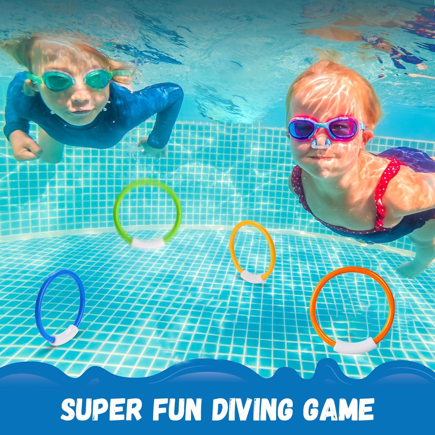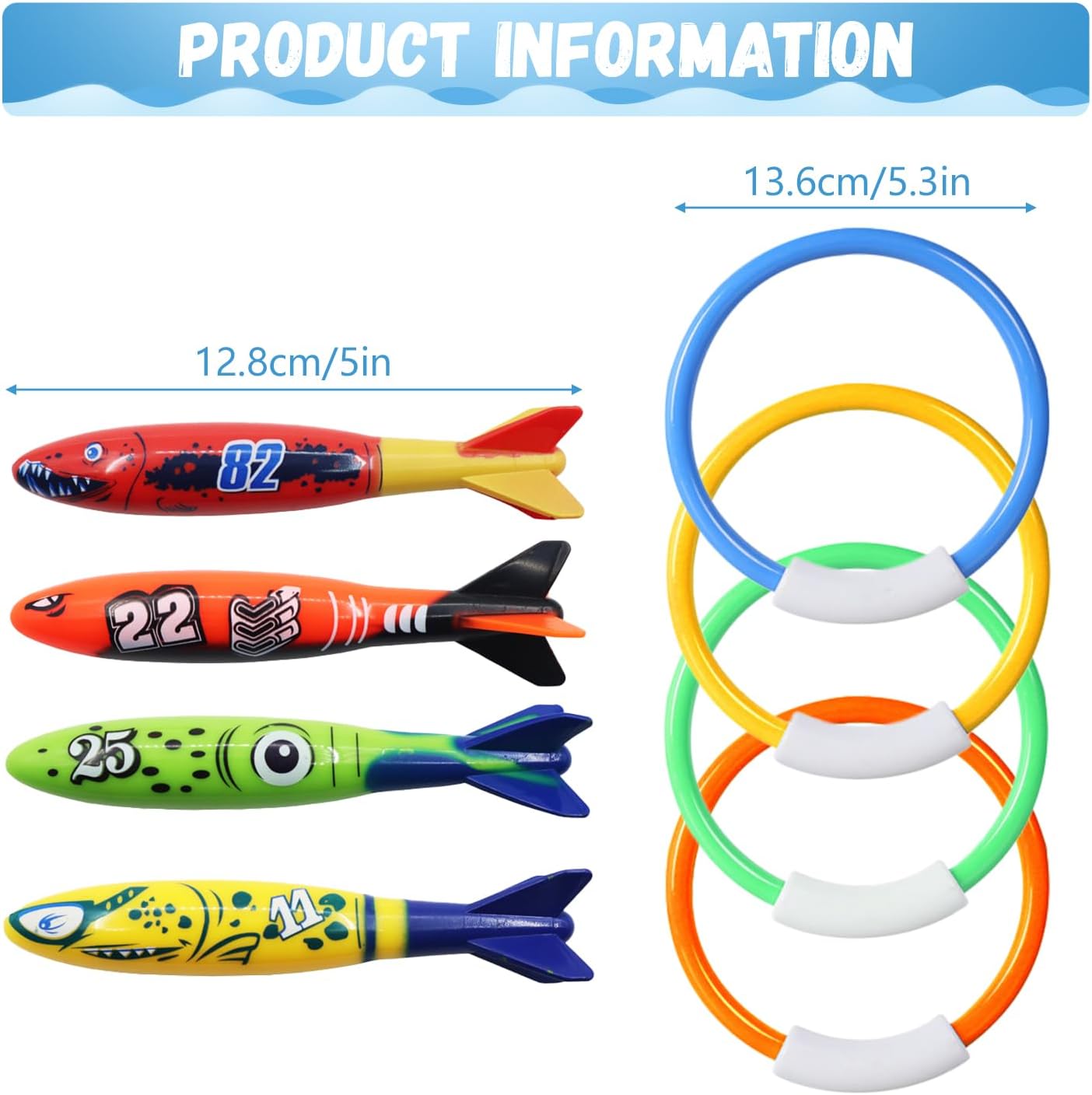 Giocattoli Subacquei Per Bambini: Il set di giocattoli da immersione è perfetto per l'addestramento subacqueo dei bambini. Include 4 anelli da sub e 4 Pesci da Immersione. Gli anelli misurano 13.6 cm di lunghezza e 2 cm di larghezza, ideali per le mani dei più piccoli Materiali Durevoli: Realizzati in plastica resistente, i giocattoli sono progettati per garantire sicurezza e durata nel tempo, offrendo un'esperienza divertente e sicura per i bambini durante l'addestramento subacqueo. I colori vivaci stimolano l'attenzione dei bambini, rendendo l'apprendimento un'esperienza coinvolgente Affonda Velocemente: Pool diving toys affonda rapidamente e sta in piedi sul fondo della piscina con una presa facile in modo che i bambini possano afferrarlo facilmente senza perdere tempo Giochi Sott'Acqua Estivo: I nostri giocattoli subacquei estivi sono lo strumento di nuoto perfetto per bambini, ragazzi e ragazze per imparare a nuotare o a tuffarsi, aggiungendo più divertimento e giochi al loro allenamento e facendogli amare il tempo trascorso in piscina Regalo Perfetto: Perfetto per feste in spiaggia, giardini, piscine, feste e altro ancora. Il regalo perfetto per bambini, nipoti, bambini, ragazzi, ragazze e studenti di nuoto nei caldi mesi estivi