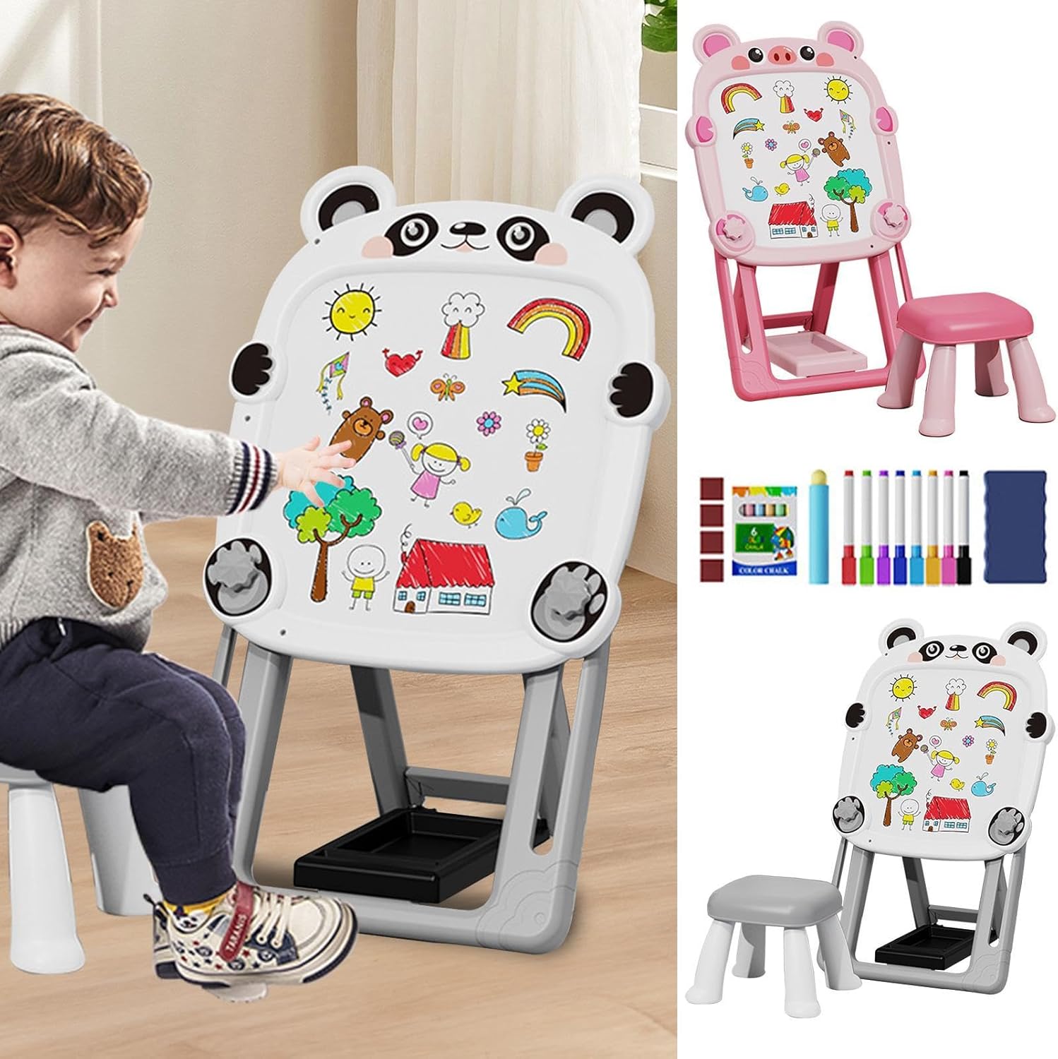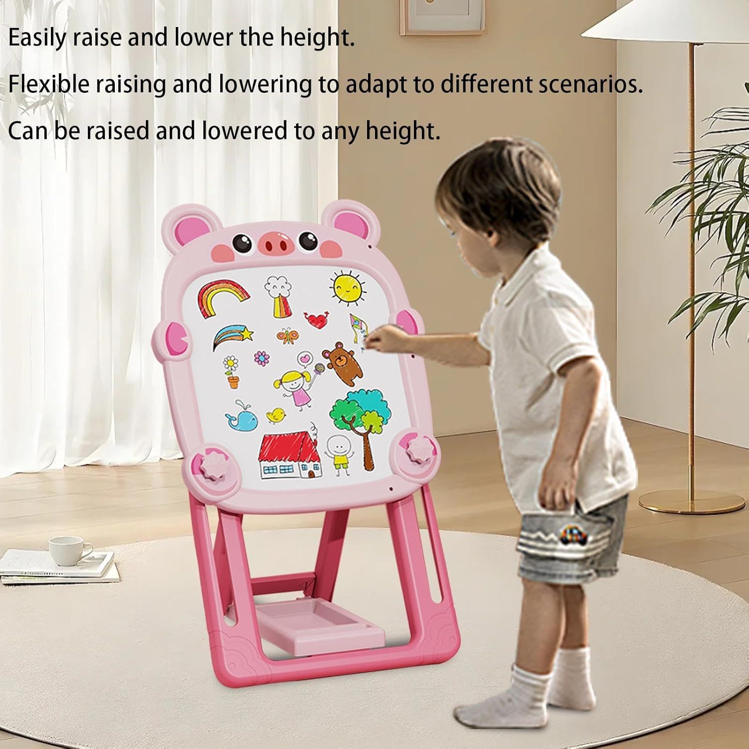 Double-Sided for Versatile Creativity: This double sided drawing board features a chalkboard side and a magnetic whiteboard the other, giving kids endless options for drawing, writing, and learning. Perfect for toddler drawing activities, educational games, and fun creative play with magnetic letters or numbers. Adjustable Height for Comfort: The adjustable magnetic whiteboard is designed to grow with your child. You can easily adjust the height of the easel to suit your child’s size, making it comfortable for and young children to use. This feature ensures the board ergonomically friendly as they grow. Portable and Foldable for Easy Storage: This foldable bracket drawing board can be quickly collapsed for easy storage when not in use, saving space in your home. It’s lightweight and portable, perfect for bringing along to the park, family trips, or simply storing in a closet when your child is finished with their artwork. Durable, Safe, and Kid-Friendly Design: Built with materials, this magnetic chalkboard and whiteboard easel is safe for and designed to withstand the rigors of daily use. It’s the perfect arts and crafts easel for kids who love to draw, doodle, and express their creativity. Stimulating Learning Tool for : More than just an art board, this kids easel encourages learning and motor skills development. Perfect for writing exercises, magnetic play, and drawing activities, it can be used to teach your toddler letters, numbers, and shapes while fostering their imagination.