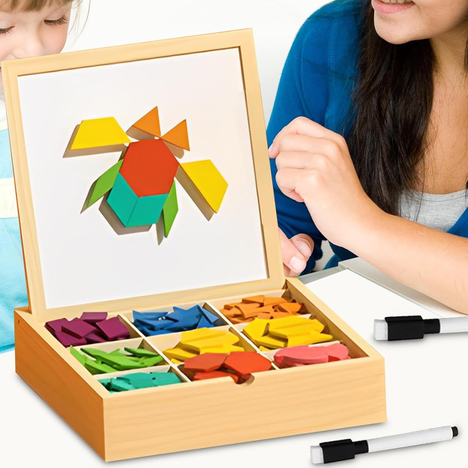 Design Interattivo: Rafforza la coordinazione occhio-mano e migliora la percezione cromatica tramite puzzle progettati per evolvere le abilità motorie fini, supportando attività educative pratiche che coinvolgono attivamente i bambini nell'apprendimento Strumento di Esplorazione Cognitiva: Con 220 componenti magnetici e carte scenografiche diversificate, promuove la consapevolezza spaziale e sostiene l'apprendimento cognitivo attraverso l'assemblaggio interattivo e la progettazione creativa di forme geometriche Sviluppo Divertente: Moduli tangram con 1000+ configurazioni alimentano interesse continuo e senso di realizzazione tramite gioco magnetico coinvolgente per bimbi 3+ Ergonomia Sicura: Forme anatomiche con bordi levigati e componenti anti distacco assicurano una presa comoda per mani piccole, mantenendo stabilità durante la costruzione e proteggendo da rischi durante l'apprendimento tattile Idea Regalo Stimolante: Kit creativo in legno che sviluppa il ragionamento logico-matematico nel gioco. La confezione curata e pronta per il lo rende adatto a compleanni o festività, promuovendo allo stesso l'apprendimento pratico e la sperimentazione tattile.