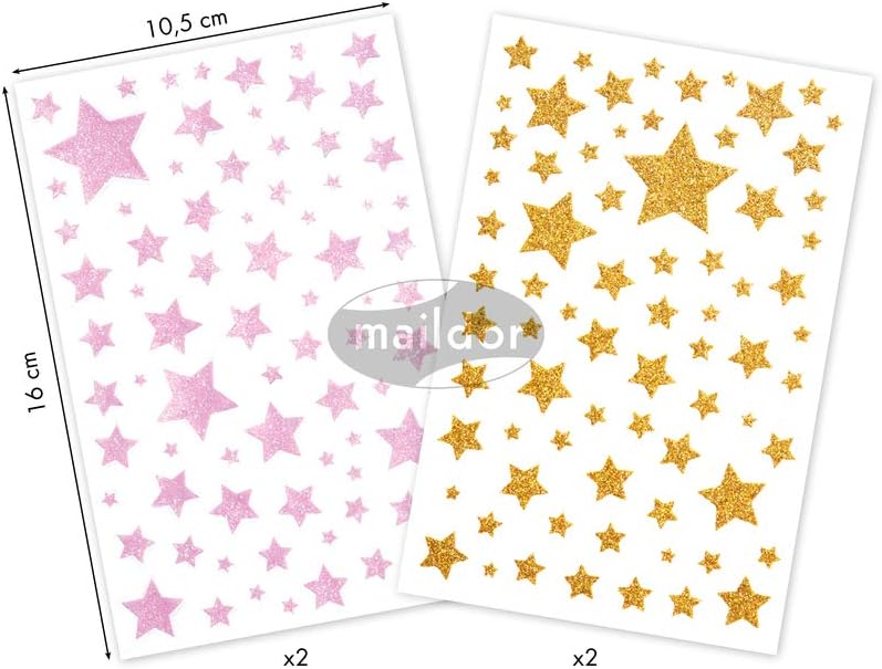 Un pacchetto di adesivi glitterati di Maildor con 151 adesivi. 2 fogli in formato DIN A6, 10,5 x 16 cm con stelle in oro e rosa. Riposizionabili, sono facili da usare e impreziosiscono foto, scrapbooking e anche piccoli oggetti di uso quotidiano! Sviluppati appositamente per le mani piccole, questi adesivi extra large sono adatti a bambini dai 2 anni in su. Con i loro motivi infantili e i colori vivaci, sono perfetti per scoprire gli adesivi Forme Coloring! Anche se il bambino non sa ancora disegnare, sarà in grado di creare fantastiche opere d'arte!