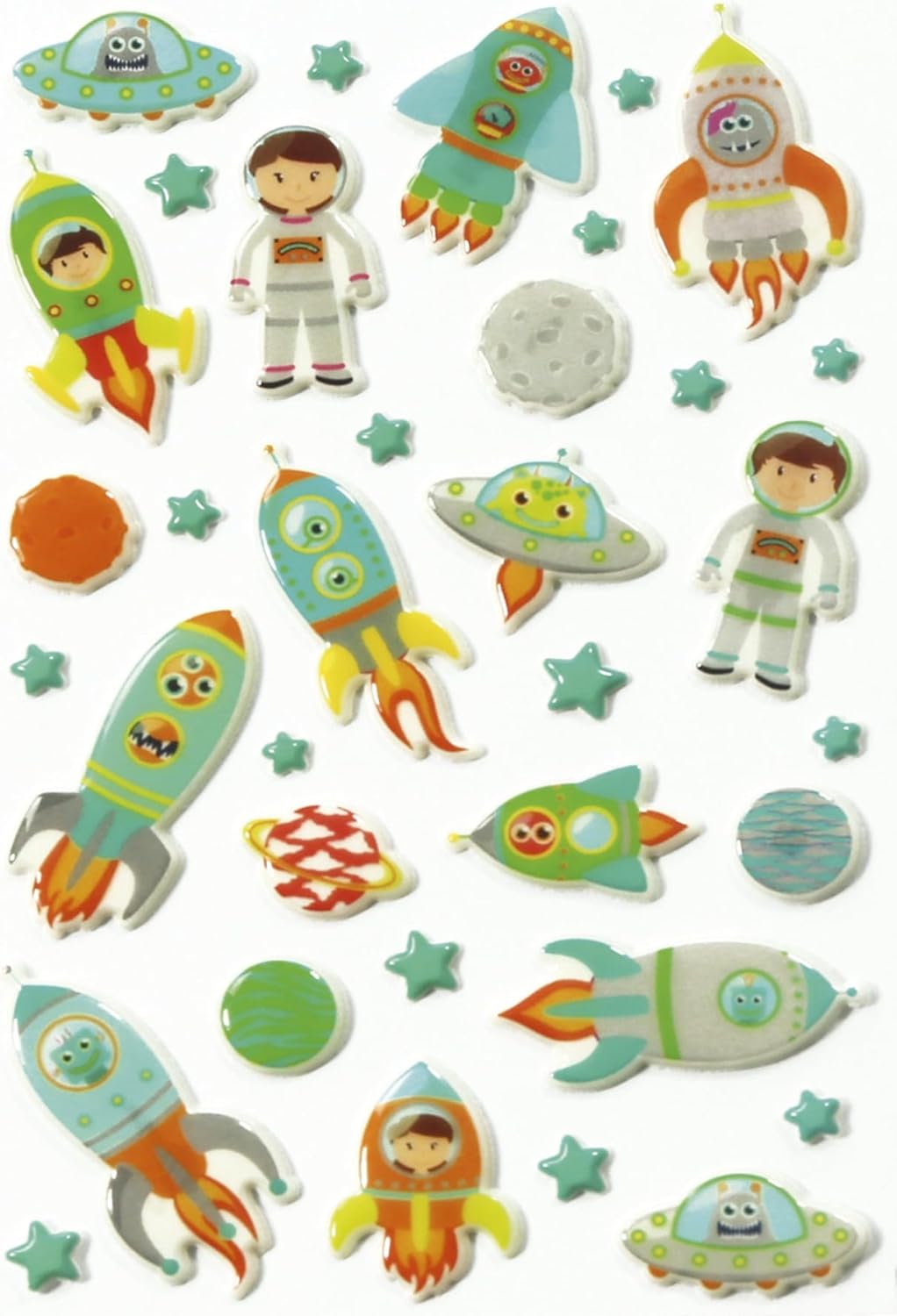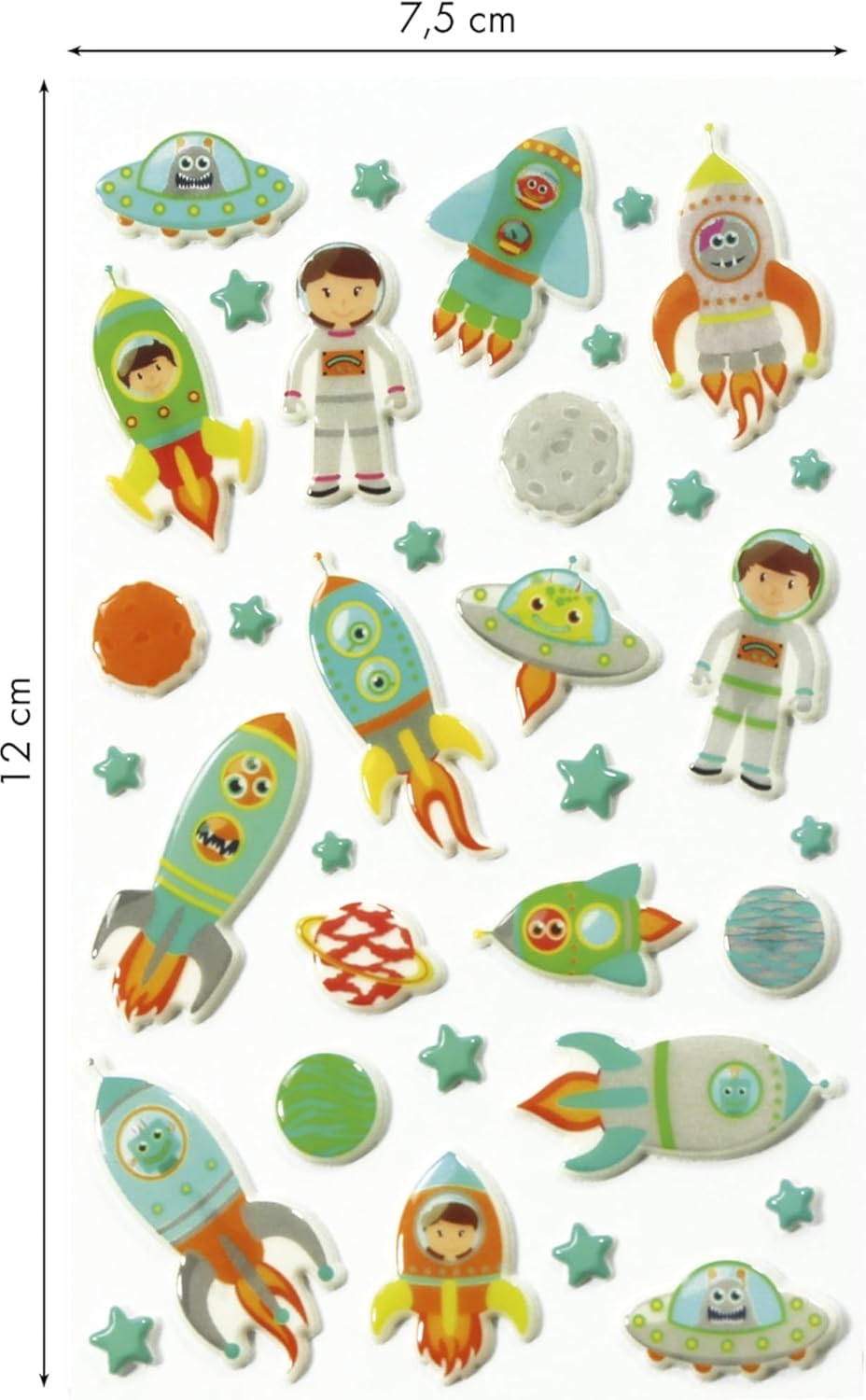 Un pacchetto di adesivi Cooky 3D di Maildor. Ogni confezione contiene 1 foglio 7,5 x 12 cm. Da decorare, collezionare o regalare! Borsa con 1 foglio. Adesivi 3D Scopri i biscotti! Divertenti e facili da usare, questi piccoli adesivi aggiungeranno colore e volume ai tuoi progetti creativi Una vasta gamma di adesivi 3D per le tue decorazioni! Facile da usare Contenuto: 1 confezione Tema: Astronave