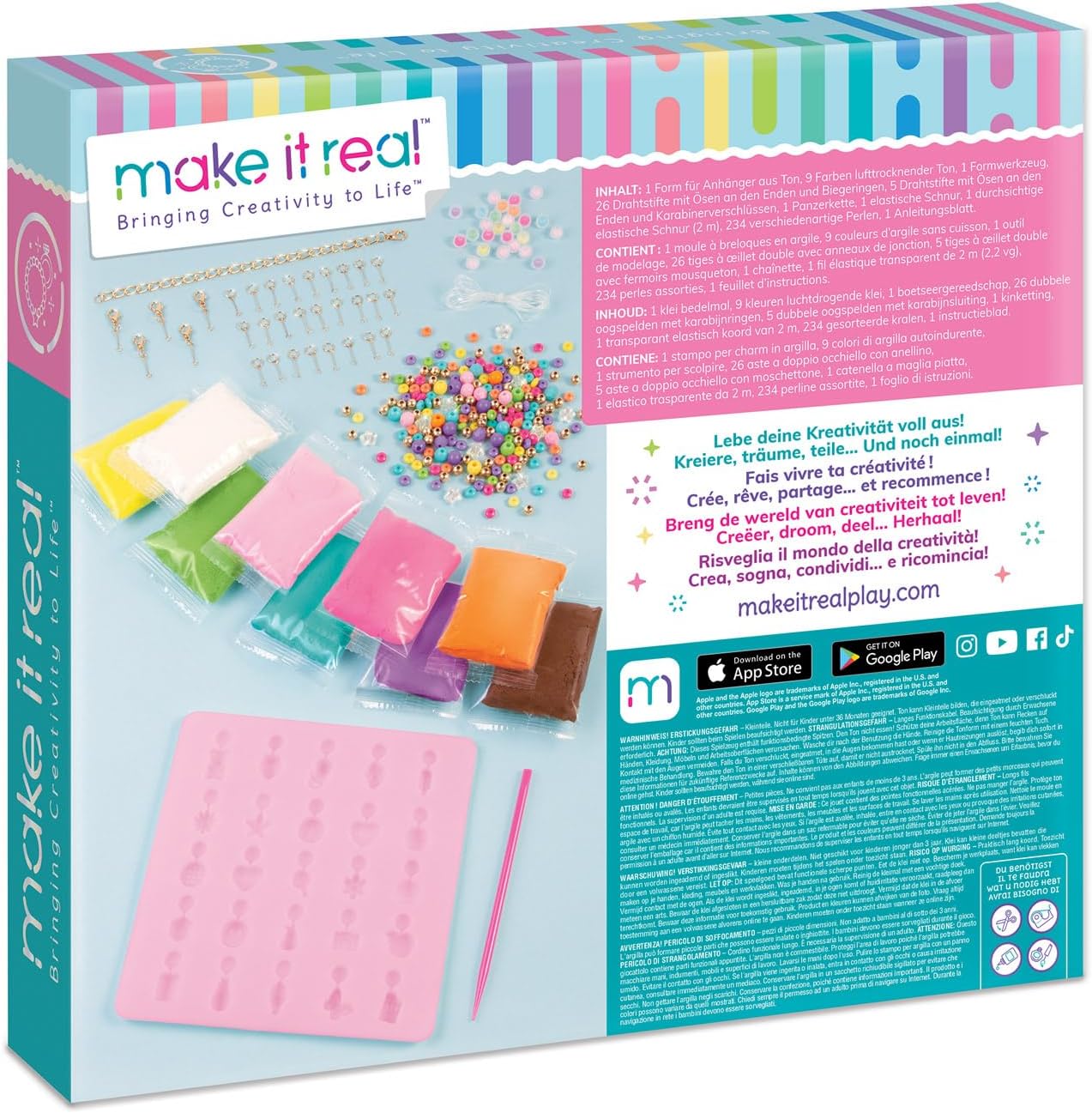 Ciondoli alla moda: crea più di 30 fantastici ciondoli in tono colorato e progetta i tuoi gioielli personalizzati. Senza bruciare, la pasta modellante si asciuga all'aria. Indossa i tuoi gioielli personalizzati o regalali alle tue amiche Diventa creativo! Creare i propri gioielli con l'aiuto del set di gioielli promuove la creatività, le capacità motorie e le capacità visive e cognitive dei bambini. Set completo per il fai da te: questo kit include tutto il necessario per creare gioielli unici. Contenuto della confezione: 1 stampo per ciondoli in plastilina modellante, 9 colori di plastilina modellante ad asciugatura all'aria, 1 strumento di formatura, 26 perni con occhielli alle estremità e anelli di piegatura, 5 perni con occhielli alle estremità e chiusure a moschettone, 1 catena, 1 corda elastica, 1 corda elastica trasparente (2 m), 234 perline diverse, 1 manuale di istruzioni. Ottima idea regalo: "Make It Real" è sinonimo di giocattolo creativo che supporta lo sviluppo dei bambini, concentrandosi sulle ragazze di età compresa tra 8 e 12 anni. Il regalo ideale per le ragazze per scoprire i loro talenti e ambizioni RACCOMANDATO PER BAMBINI DA 8 ANNI