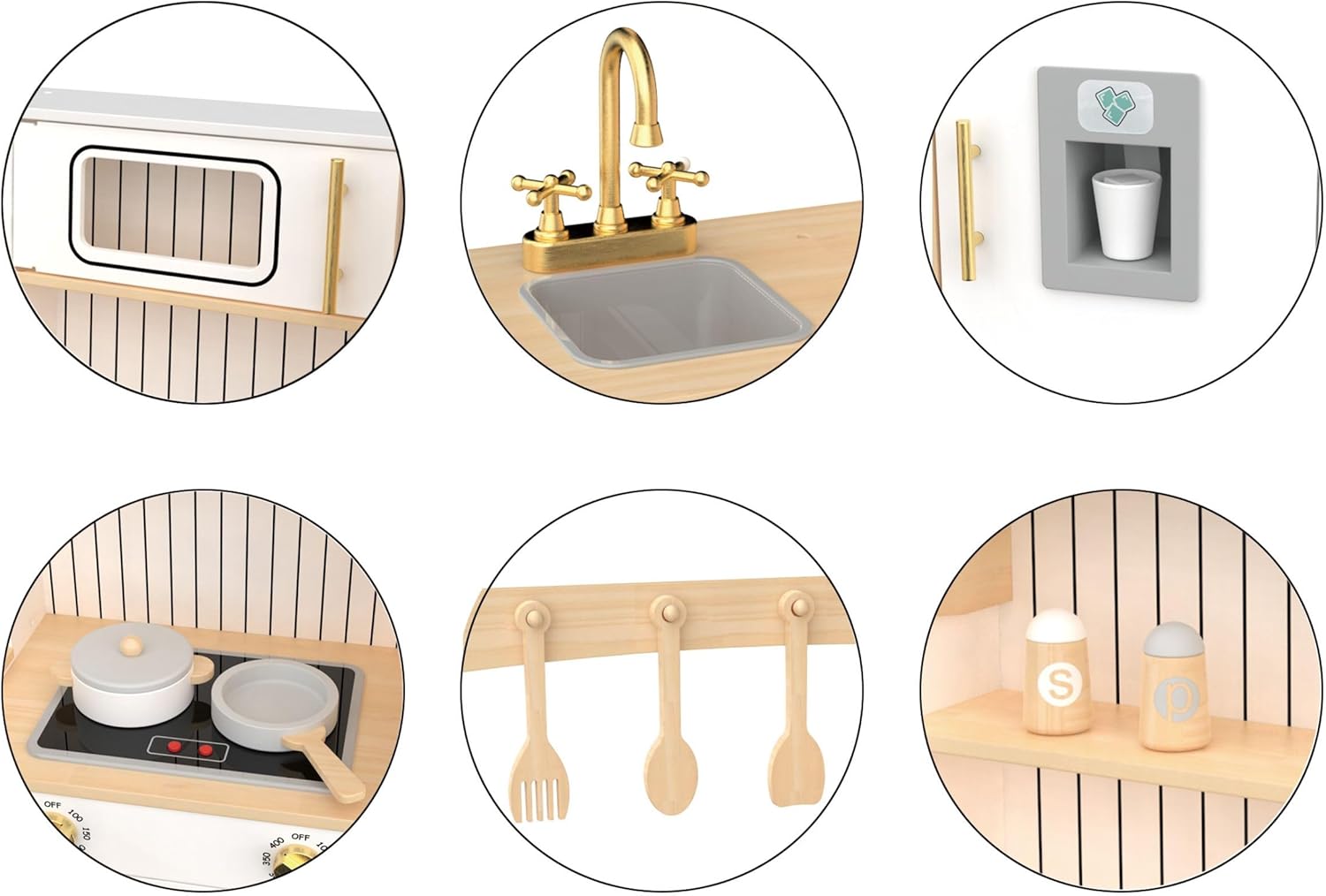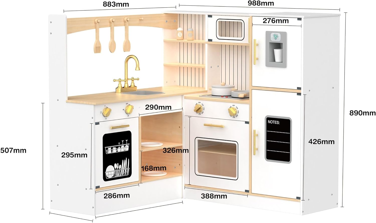 Funzioni interattive: Microonde con luci e suoni; piano cottura illuminato; dispenser ghiaccio; lavastoviglie, lavello e forno apribile Set completo incluso: Pentola, padella, posate, piatti, bicchiere, cubetti di ghiaccio, saliera e pepiera Stile & praticità: Design neutro adatto a ogni cameretta; ampi vani portaoggetti Sicura & resistente: MDF, pino, vernici atossiche, angoli smussati; conforme alle norme di sicurezza Giocattolo educativo: Stimola creatività, motricità e socialità attraverso il gioco di ruolo