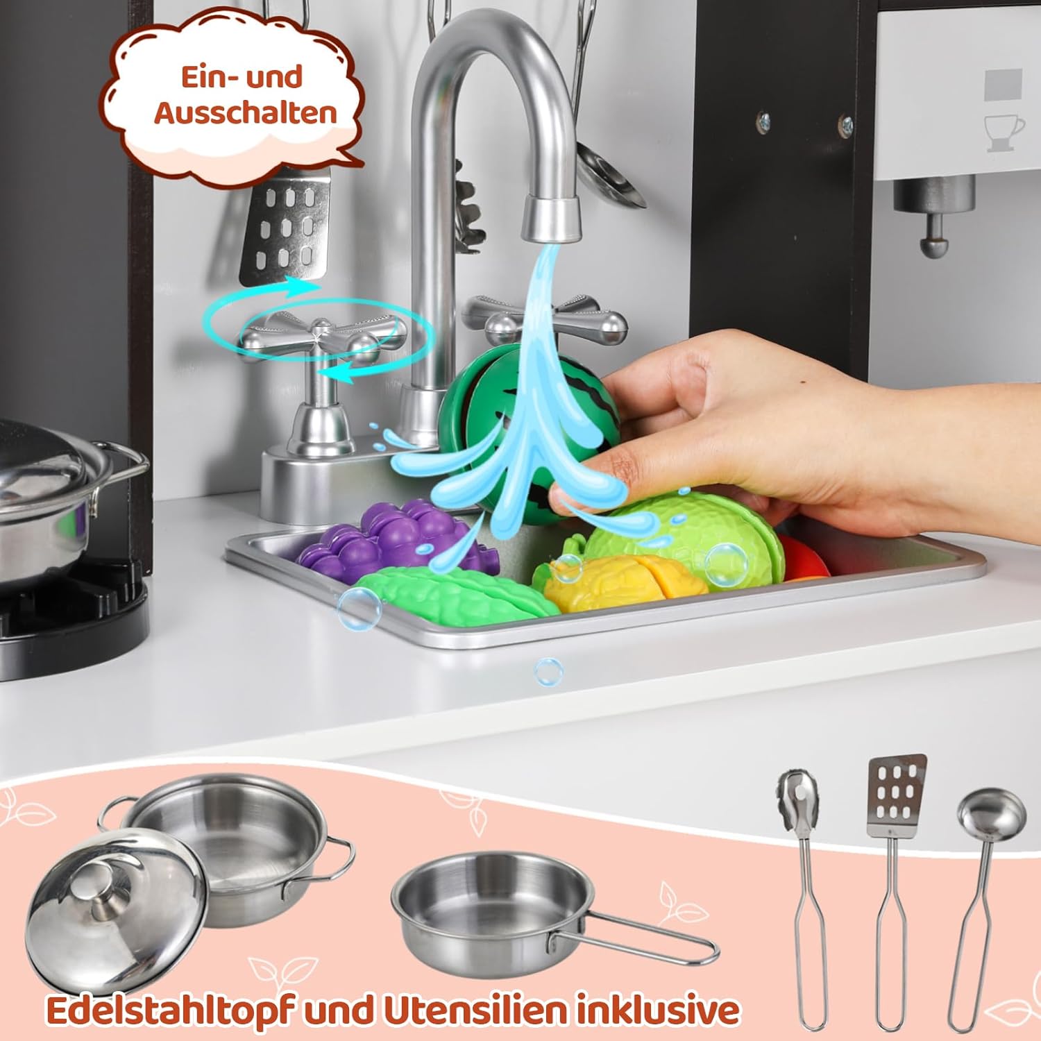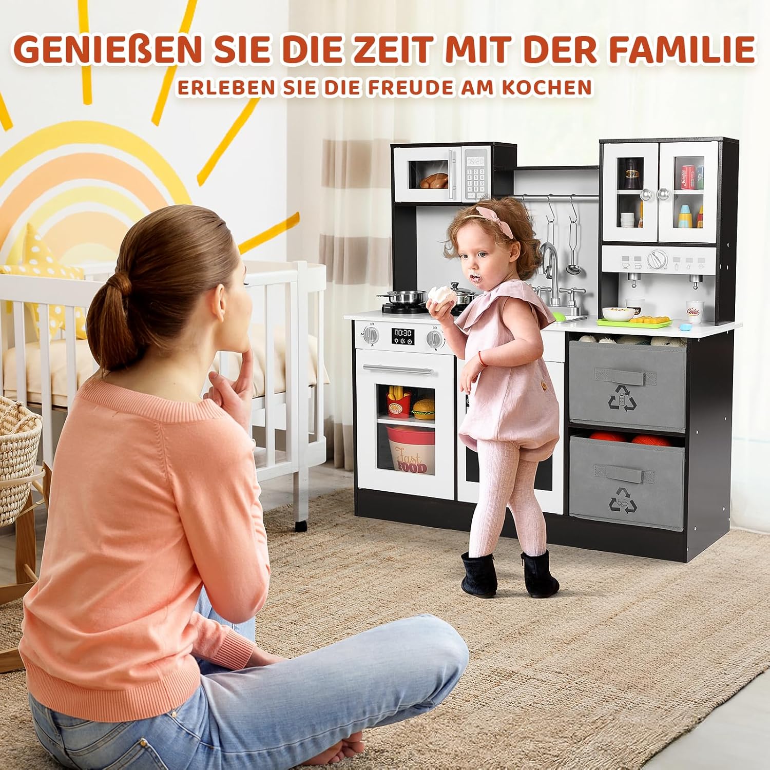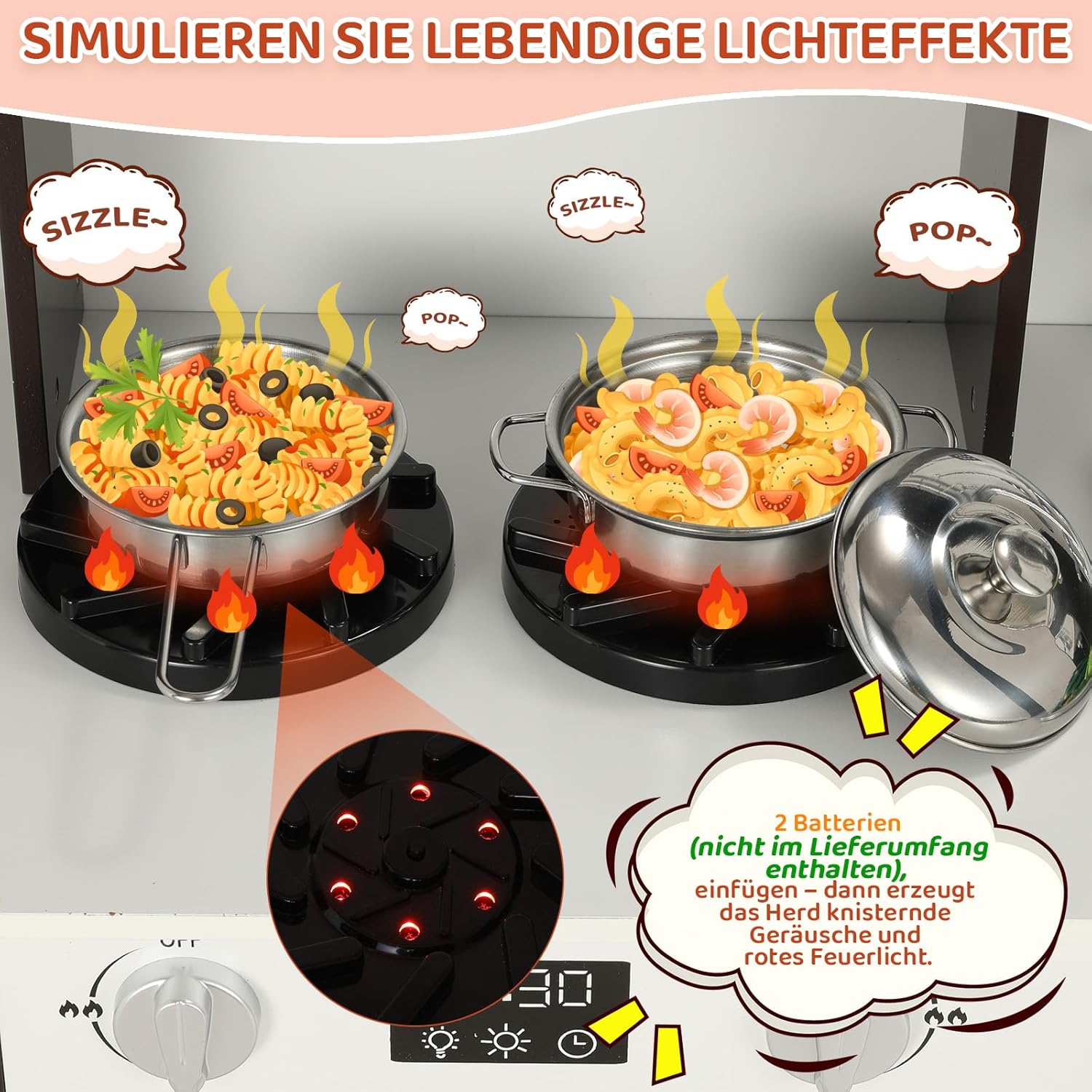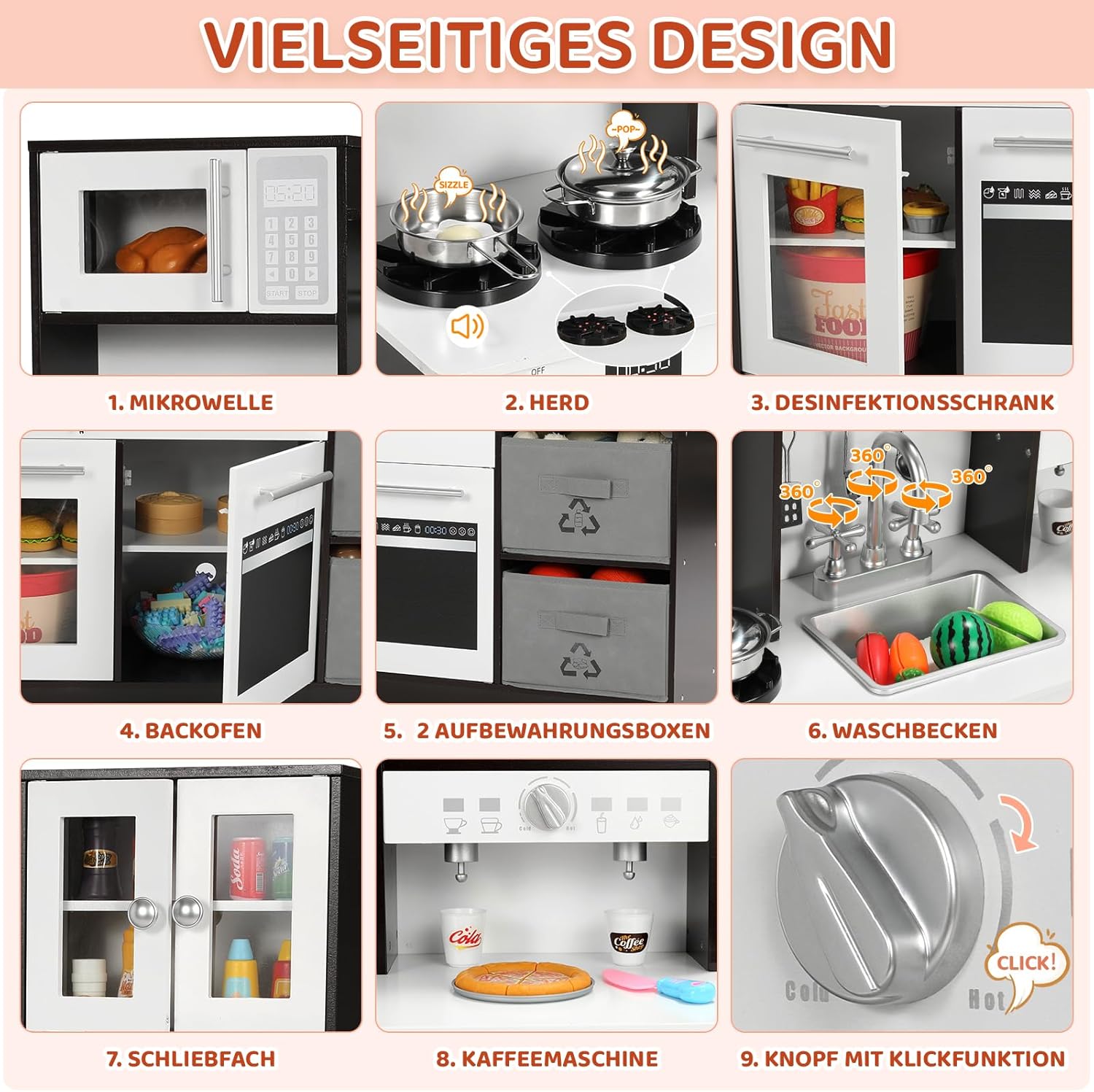 🎁Gioco di simulazione dello chef: Il set di cucina legno per bambini è completo di accessori, tra cui piano cottura, lavello, forno, macchina per il caffè, cabina di disinfezione, forno a microonde, utensili da cucina e ganci, ecc., che possono ottenere un'esperienza di gioco coinvolgente e sviluppare le capacità pratiche e di coordinazione dei bambini. I giochi di ruolo possono anche aumentare il tempo di interazione genitore-figlio e offrire ai bambini un'infanzia amorevole e calorosa. 🎁Spazio di archiviazione extra large: i cucina in legno per bambini hanno due grandi scatole di archiviazione, nonché più ripiani e armadi aperti, che possono contenere vari giocattoli, mantenendo la scrivania e la stanza in ordine e pulite in ogni momento. Non solo può esercitare le capacità di organizzazione e classificazione dei bambini, ma anche coltivare la consapevolezza e le abitudini dei bambini di archiviazione indipendente. 🎁Realistisches Design: Il fornello di questo cucina giocattolo legno ha effetti sonori e luminosi. Le manopole del fornello e della macchina per il caffè non solo girano senza problemi, ma producono anche un piacevole suono "clic". Il rubinetto può essere ruotato a piacimento. La piccola lavagna può essere attaccata con ricette o adesivi carini, offrendo ai bambini un'esperienza di utilizzo realistica. Tieni presente che la confezione non include le batterie, acquista 2 batterie AAA da solo. 🎁Materiali di alta qualità: i cucina bambini legno sono realizzati con pannelli MDF di alta qualità. I materiali sono ecologici e sani e hanno superato test di sicurezza. La superficie è liscia e piatta e il processo di lucidatura dei bordi arrotondati sugli angoli garantisce anche sicurezza utilizzo da parte dei bambini. Il giocattolo da cucina viene fornito anche con istruzioni e strumenti illustrati dettagliati e può essere assemblato da due persone in 30 minuti. 🎁Regalo perfetto: questa cucina multifunzionale per bambini misura 90x30x90 cm e può essere giocata da più persone. Ciò può incoraggiare i bambini a organizzare tea party pomeridiani per l'interazione sociale e la condivisione dei giocattoli. Può stimolare la creatività e l'immaginazione dei bambini. Questo giocattolo è un regalo ideale per i bambini dai 3 anni in su.