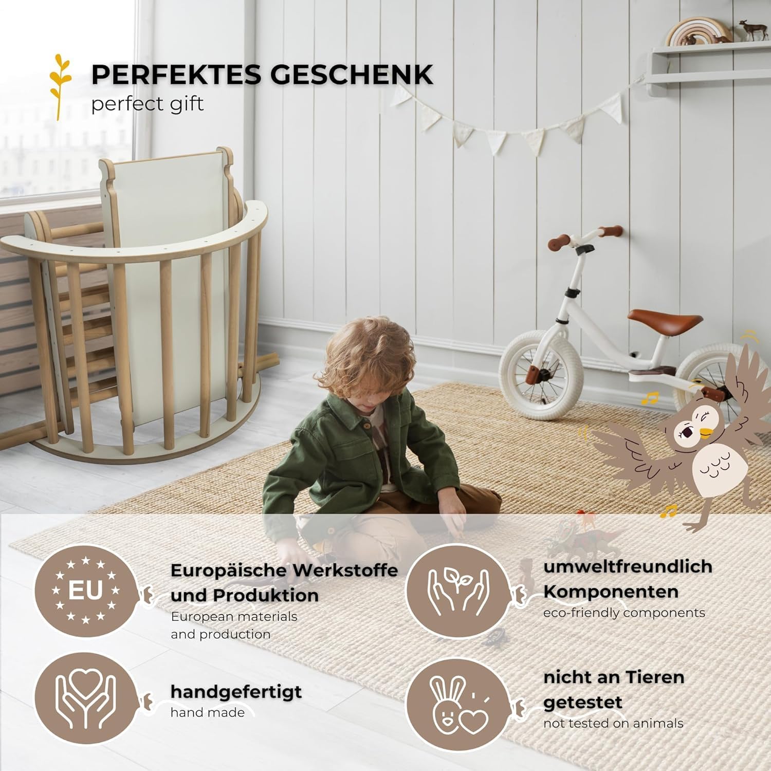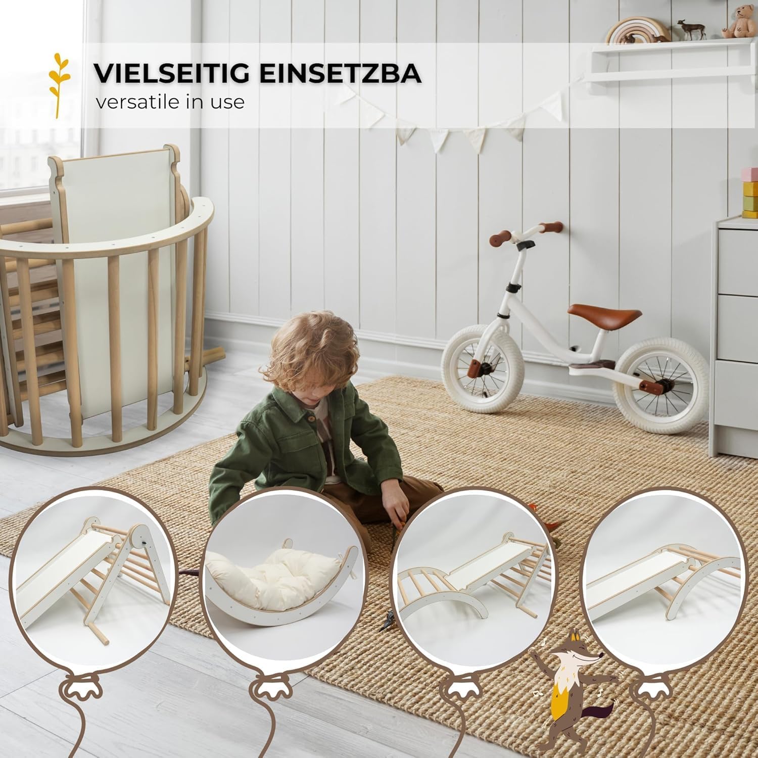 Struttura da arrampicata 4 in 1 per un divertimento senza limiti in ambienti interni: il set di impalcature da arrampicata MAMOI combina triangolo da arrampicata, arco da arrampicata con morbido cuscino e scivolo in uno. Progettato appositamente per bambini da 1 a 3 anni, questo versatile set offre un ambiente sicuro e protetto per ore di esplorazione. Non solo promuove lo sviluppo motorio, ma stimola anche la creatività e la fiducia in se stessi dei più piccoli. Questo set per parco giochi crea le condizioni ideali per divertirsi e imparare. Materiali di alta qualità per la massima sicurezza e longevità: MAMOI set di impalcature per la massima qualità e sostenibilità. Le superfici infrangibili sono levigate lisce e sicure per i bambini. Ciò garantisce non solo un'esperienza di gioco durevole, ma anche sicura. Questo set soddisfa tutti i rigorosi standard di sicurezza europei per i giocattoli per bambini. Design innovativo per promuovere lo sviluppo motorio e cognitivo: il triangolo da arrampicata, l'arco da arrampicata e lo scivolo sono appositamente progettati per promuovere la coordinazione fisica, l'equilibrio e la creatività del bambino. Grazie al suo design flessibile, l'arco da arrampicata può essere utilizzato anche come dondolo o come luogo di riposo con il cuscino. Questo set multifunzionale ispira nuove avventure e allo stesso tempo supporta importanti processi di apprendimento motorio. Montaggio semplice e struttura robusta per anni di divertimento: la struttura ben studiata del set di strutture da arrampicata consente un montaggio rapido e senza problemi con il minimo sforzo di utensili. La struttura stabile garantisce sicurezza, in modo che il bambino possa arrampicarsi, scivolare e giocare senza problemi. L'elevata capacità di carico e i collegamenti fissi garantiscono un utilizzo duraturo per numerose ore di gioco. Il regalo ideale per piccoli avventurieri e genitori felici: la struttura da arrampicata MAMOI 4 in 1 con triangolo da arrampicata è il regalo perfetto per compleanni, vacanze o altre occasioni speciali. Combina vantaggi educativi con divertimento infinito e offre un ambiente sicuro per lo sviluppo di piccoli avventurieri. Un regalo che entusiasmerà sia i bambini che i genitori, durevole, di alta qualità e con grande attenzione ai dettagli.