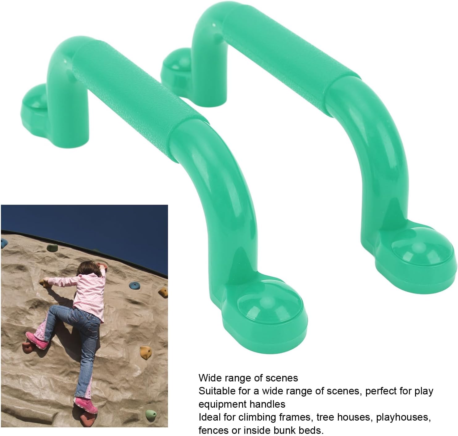 MATERIALE PREMIUM: Le maniglie per parco giochi sono realizzate in PE e ferro di alta qualità e durevoli con elevata capacità di carico e forniscono una presa sicura. Adatto per gli sport all'aria aperta. GRANDE DESIGN: le maniglie del parco giochi sono progettate di grandi dimensioni, adatte a utenti di tutte le età, aumentando il divertimento nel parco giochi. Il design antiscivolo offre una presa sicura per le mani dei più piccoli. FACILE DA INSTALLARE E MANTENERE: le maniglie di sicurezza per parco giochi sono facili da installare e possono essere rapidamente installate su parchi giochi o stadi per una facile gestione e manutenzione. Ampia gamma di scene: adatta a una varietà di scene, maniglia perfetta per attrezzature da gioco per strutture da arrampicata, case sugli alberi, casette, recinzioni o letti a castello. CONFORMITÀ AGLI STANDARD: Conforme agli standard delle attrezzature sportive per garantire agli utenti un'esperienza sicura e confortevole. Può essere utilizzato in diversi scenari come tavole da arrampicata, corrimano, ecc. per soddisfare esigenze diverse.