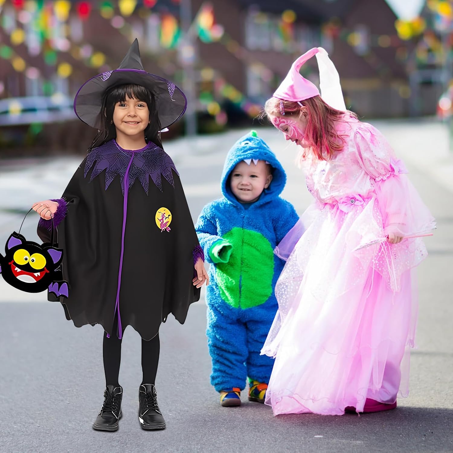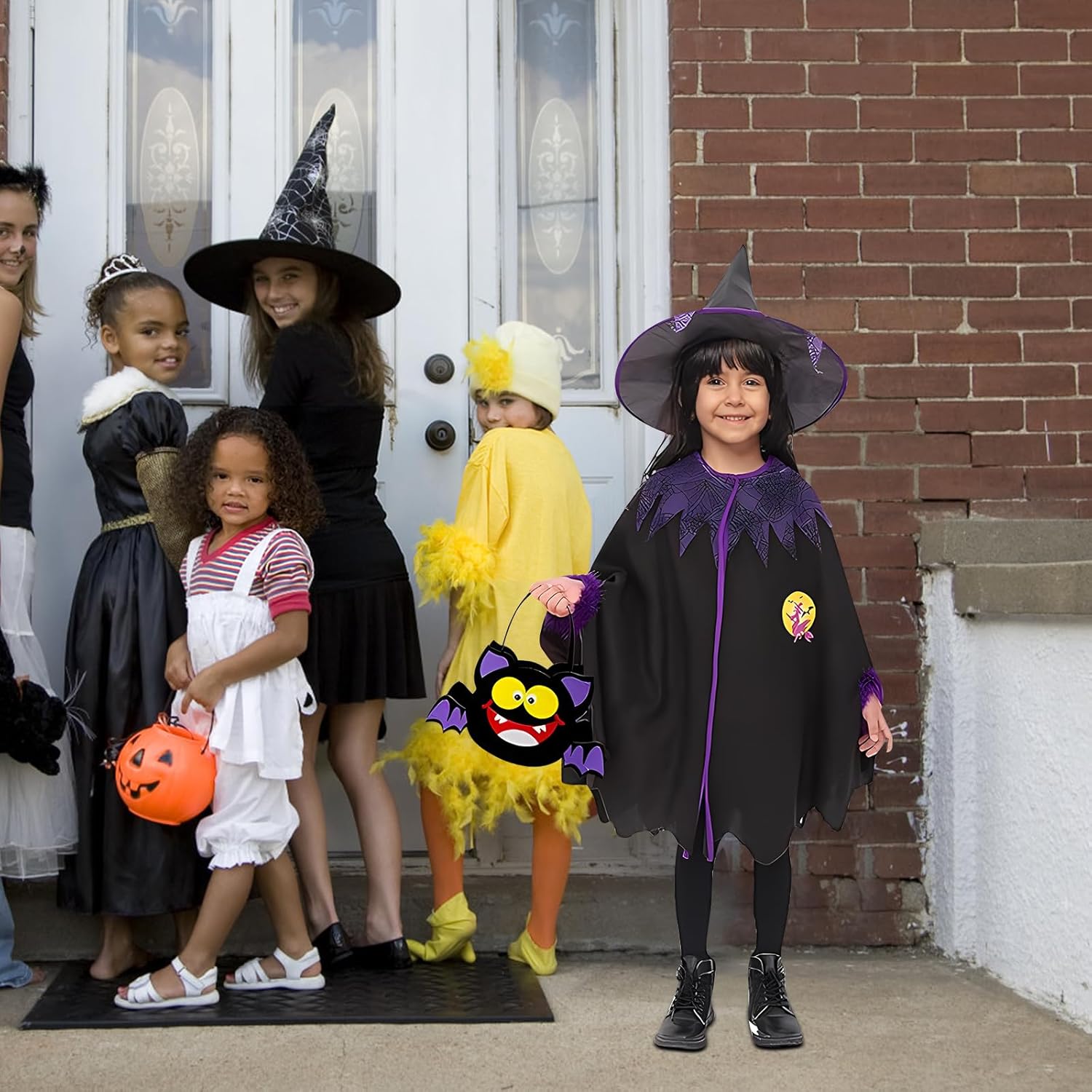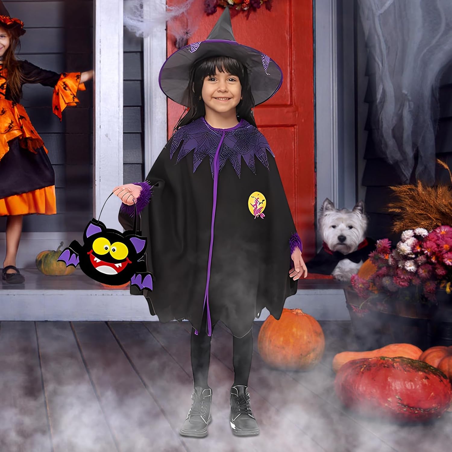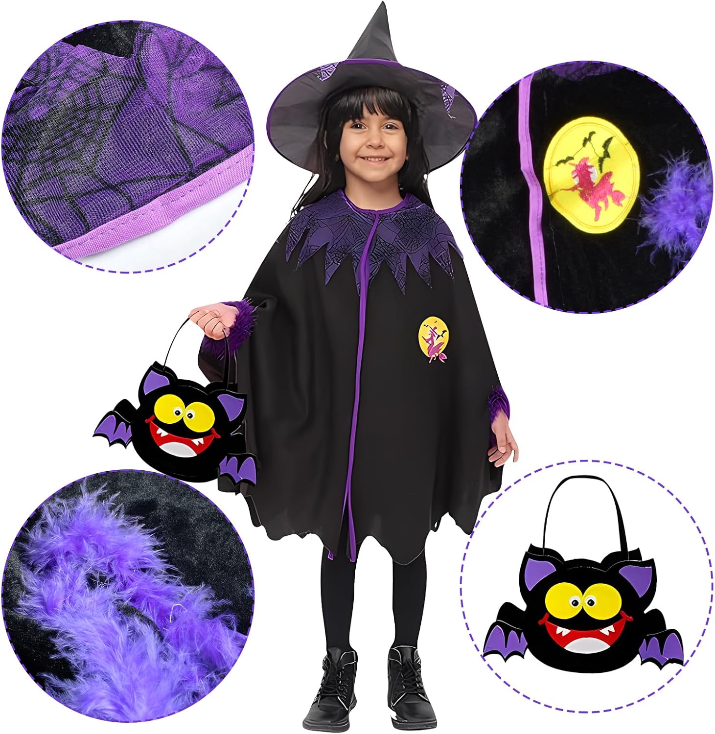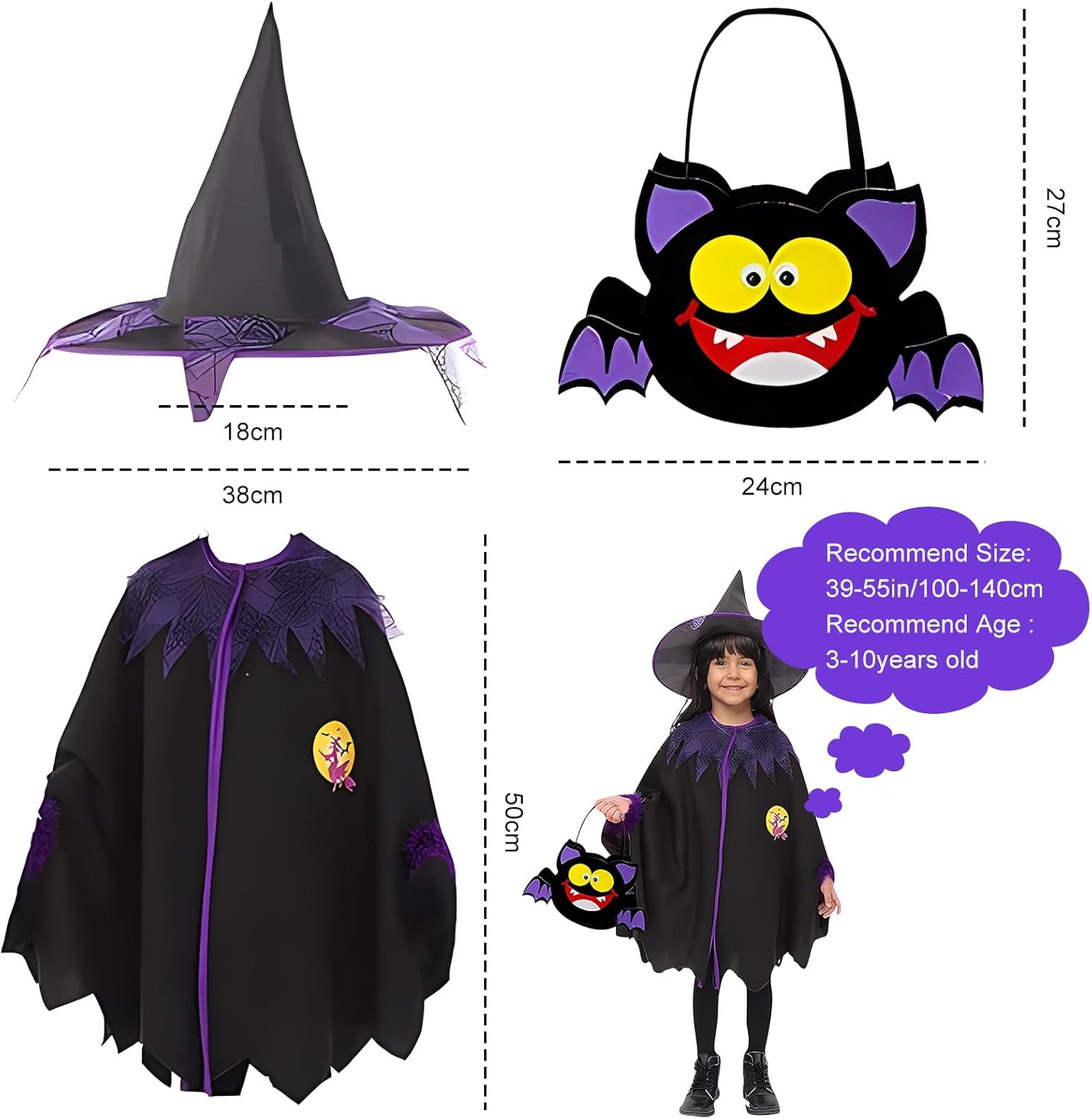 Déguisement halloween pour enfant. Il comprend: - 1 cape - 1 chapeau - 1 Sac à assembler (avec autocollants). J'apprécie le fait que le sac est à assembler, je l'ai fait avec ma fille de 3 ans et demie, cela permet une petite activité ! Le rapport qualité-prix me paraît élevé mais Le déguisement a bien plu à ma fille, elle est toute contente de le porter sur la photo. Vivement Halloween pour le porter.