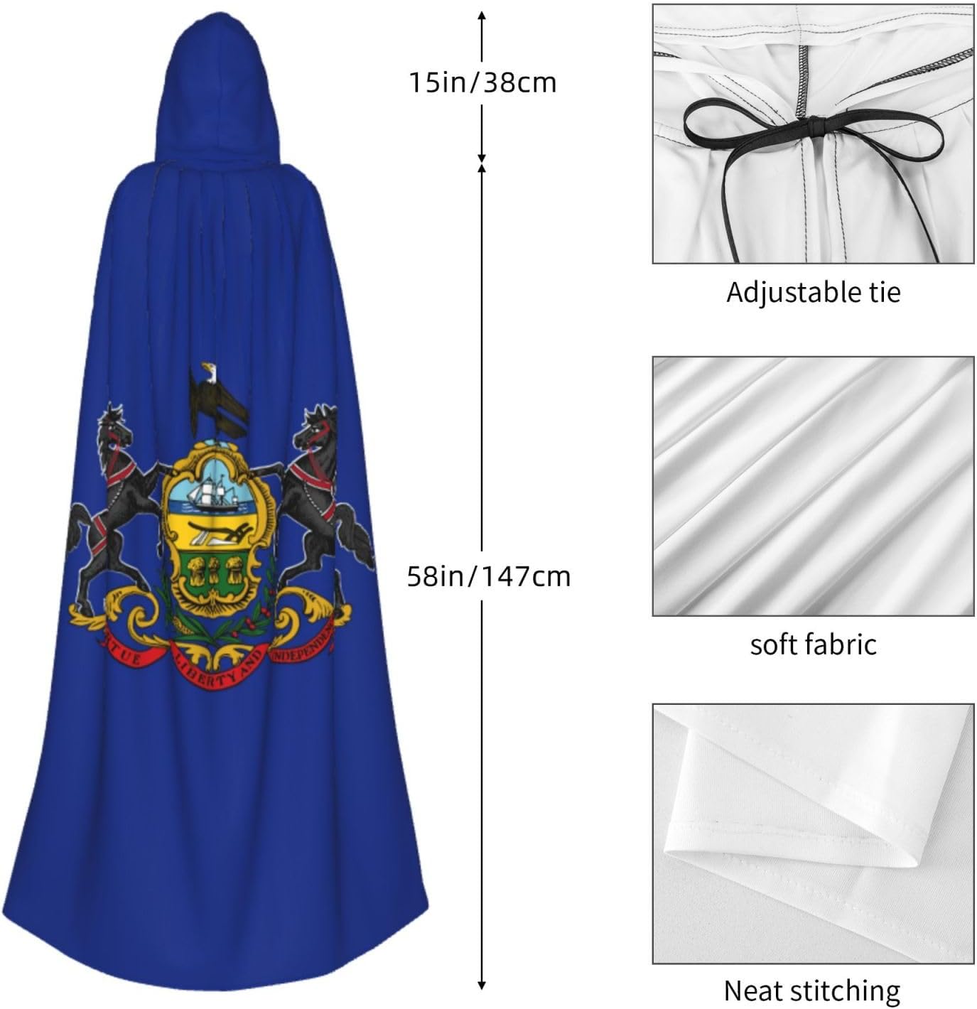 Ruba lo spettacolo a qualsiasi evento di Halloween o a tema con il nostro mantello con cappuccio. Realizzato con un tessuto confortevole, non pruriginoso, questo mantello con stampa bandiera della Pennsylvania è progettato per assicurarti di distinguerti tra la folla. Il mantello è facile da indossare e togliere, grazie alla cravatta e all'assenza di una cerniera. Con un design facile da pulire, può essere lavato in lavatrice o a mano per garantire che sia sempre pronto per il tuo prossimo evento. Prova la perfetta miscela di comfort, stile e versatilità con il nostro mantello con cappuccio.