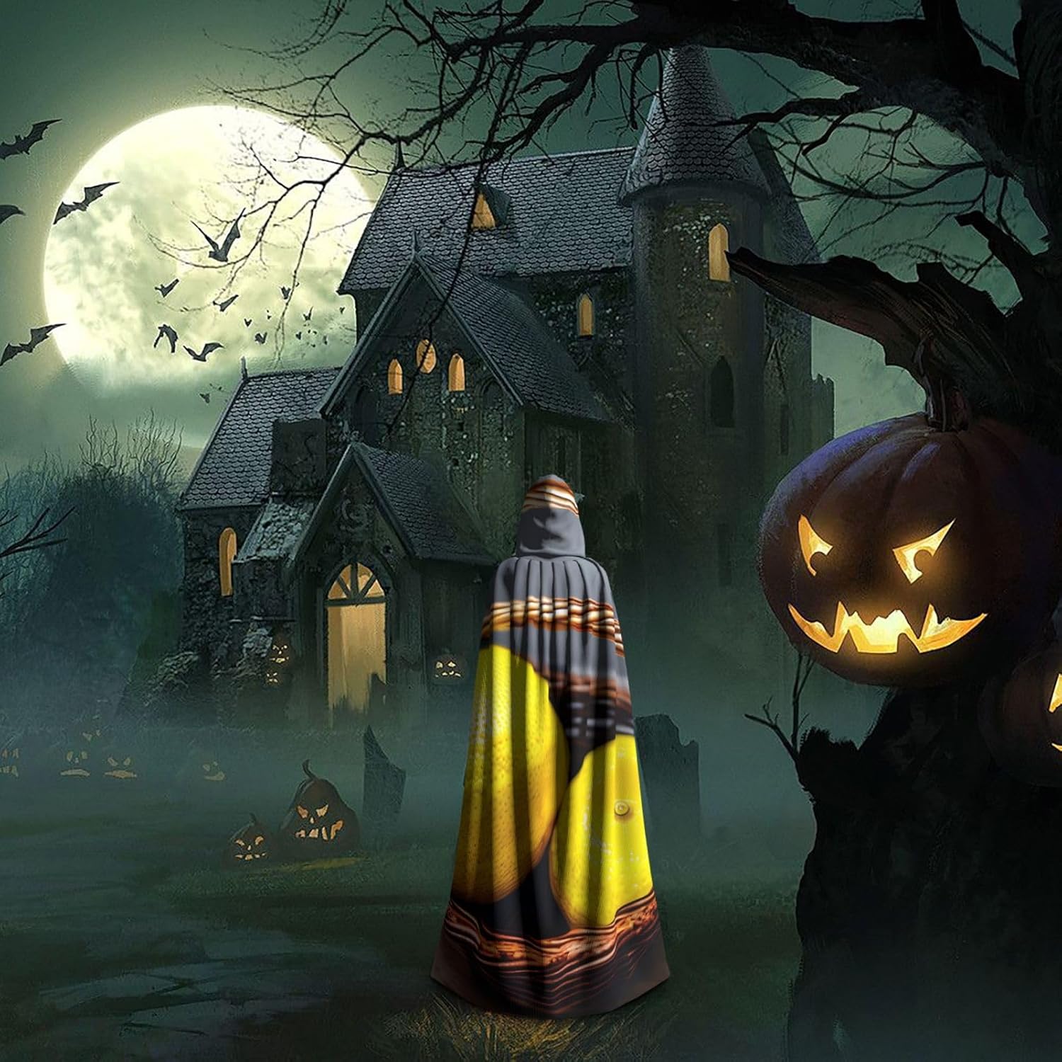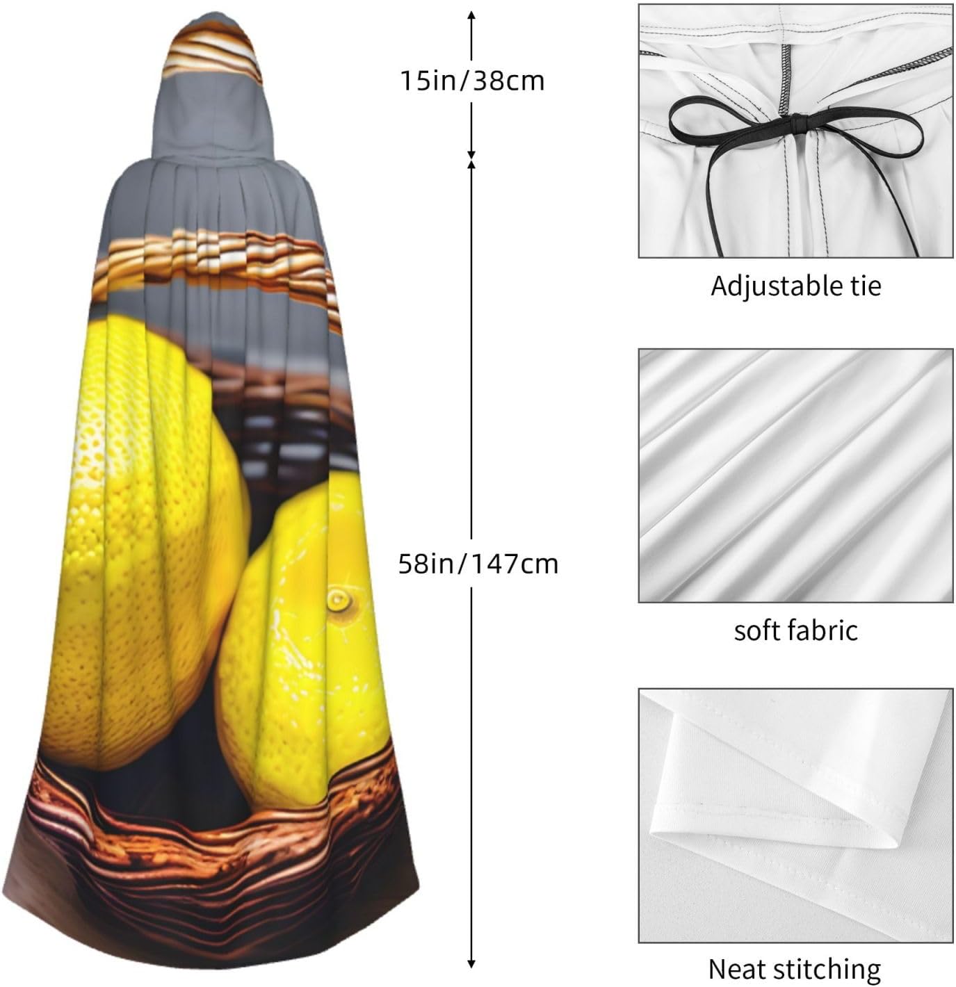 Ruba lo spettacolo a qualsiasi evento di Halloween o a tema con il nostro mantello con cappuccio. Realizzato con un tessuto confortevole, non pruriginoso, questo mantello con stampa limone è progettato per assicurarti di distinguerti tra la folla. Il mantello è facile da indossare e togliere, grazie alla cravatta e all'assenza di una cerniera. Con un design facile da pulire, può essere lavato in lavatrice o a mano per garantire che sia sempre pronto per il tuo prossimo evento. Prova la perfetta miscela di comfort, stile e versatilità con il nostro mantello con cappuccio.