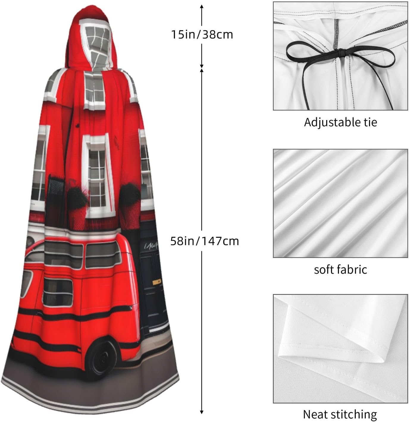 Ruba lo spettacolo a qualsiasi evento di Halloween o a tema con il nostro mantello con cappuccio. Realizzato con un tessuto confortevole, non pruriginoso, questo mantello con stampa di Londra Street è progettato per assicurarti di distinguerti tra la folla. Il mantello è facile da indossare e togliere, grazie alla cravatta e all'assenza di una cerniera. Con un design facile da pulire, può essere lavato in lavatrice o a mano per garantire che sia sempre pronto per il tuo prossimo evento. Prova la perfetta miscela di comfort, stile e versatilità con il nostro mantello con cappuccio.