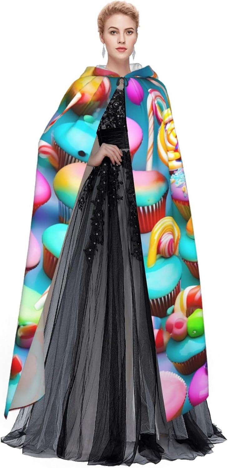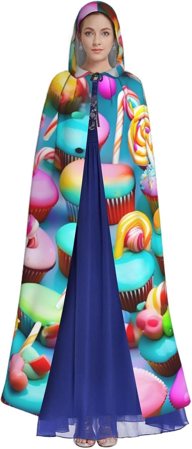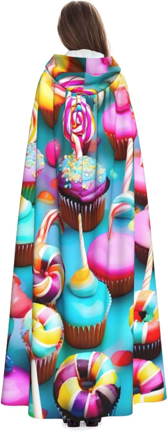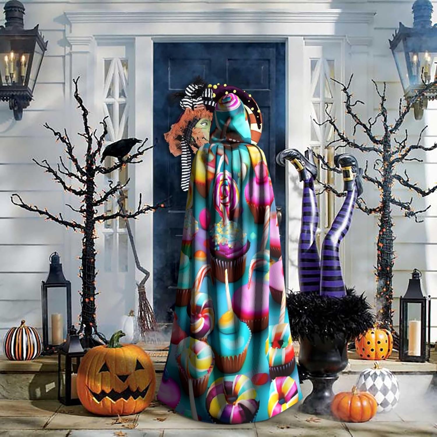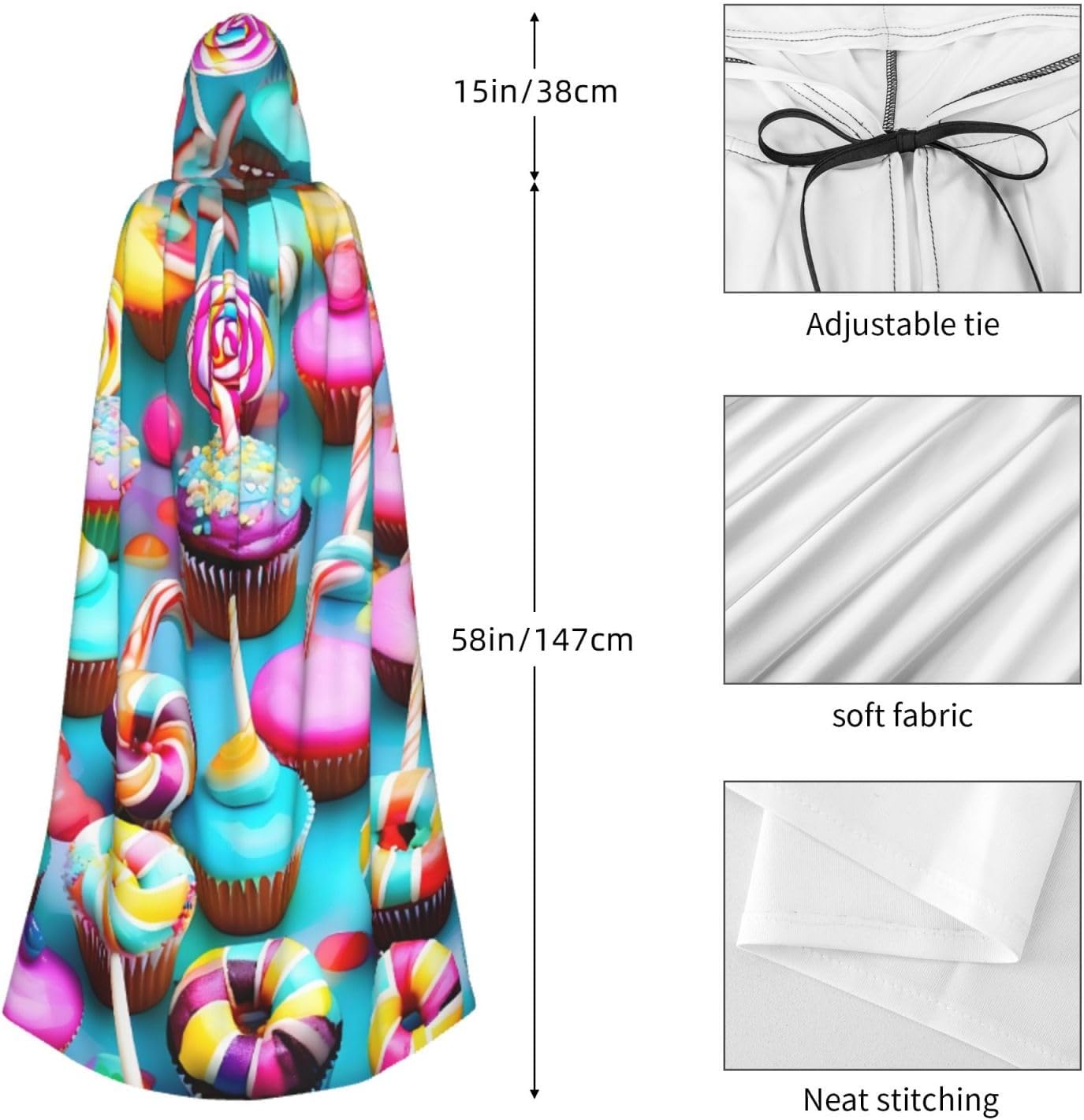 Il mantello con cappuccio per Halloween è realizzato con tessuto in poliestere morbido anche sulla pelle, prevenendo qualsiasi irritazione. Il mantello presenta un ampio cappuccio e uno stile annodato senza cerniere per un design sofisticato ed elegante. Con la sua dimensione universale, offre una copertura completa, adatta a tutti, assicurandoti di distinguerti tra la folla. Questo mantello colorato con stampa a ciambella dolce lecca-lecca non è solo per Halloween; è abbastanza versatile per cosplay, spettacoli teatrali, balli in maschera, feste a tema e molto altro ancora.