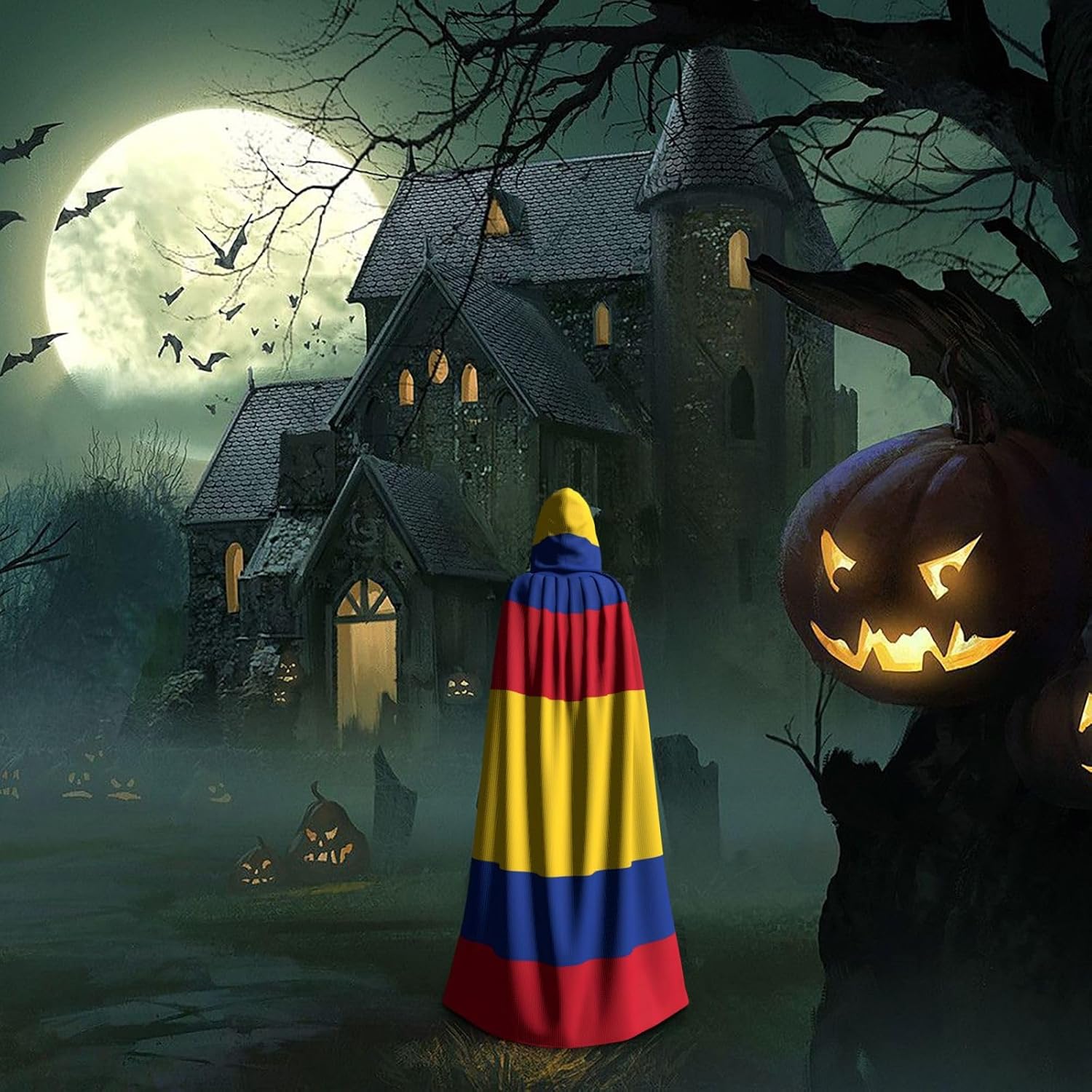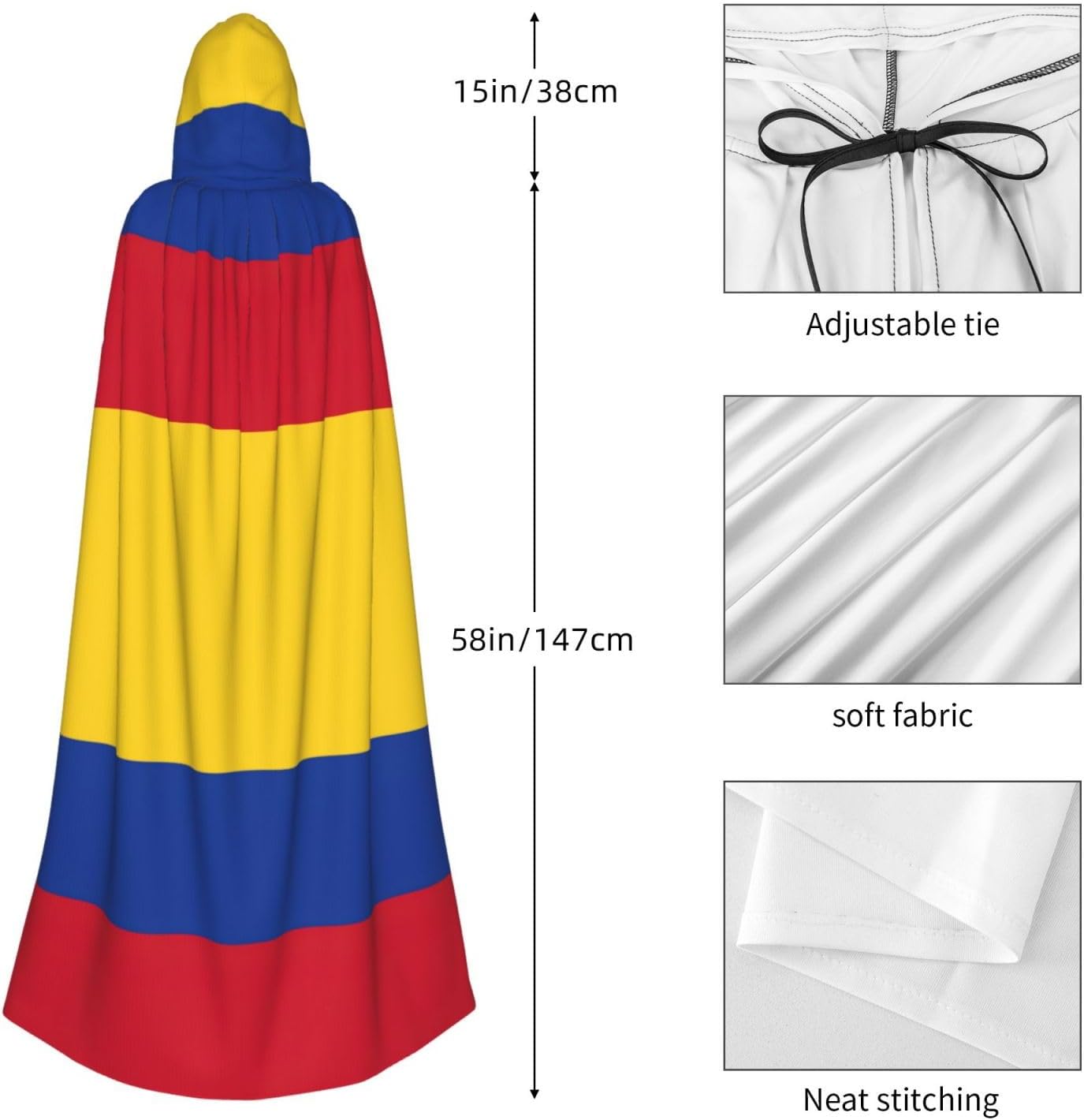 Migliora il tuo gioco di costumi con il mantello con cappuccio per adulti con stampa bandiera della Colombia: un'aggiunta versatile ed elegante al tuo guardaroba. Realizzato al 100% in poliestere, questo mantello offre una consistenza morbida e liscia che garantisce comfort durante tutto l'evento. La generosa lunghezza di 147 cm e l'altezza del cappuccio di 38 cm lo rendono adatto alla maggior parte degli adulti, offrendo una vestibilità perfetta sia per gli uomini che per le donne. Il mantello da uomo con cappuccio e chiusura a laccio lo rende facile da indossare e regolare, garantendo una vestibilità sicura e confortevole. Che tu stia partecipando a una fiera rinascimentale, a una festa di Halloween, a un raduno di Natale o a un evento a tema medievale, questo mantello aggiungerà un tocco di eleganza e autenticità al tuo outfit. Ideale per una vasta gamma di occasioni, tra cui cosplay, balli in maschera e feste a tema, questo mantello da ballo in maschera è anche una scelta fantastica per costumi gotici, da vampiro, da strega e da mago. Abbraccia lo spirito del Medioevo o aggiungi un tocco di mistero al tuo prossimo evento con il mantello con cappuccio per Halloween per adulti. Ordina il tuo oggi ed entra nel mondo dello stile e dell'incanto senza tempo