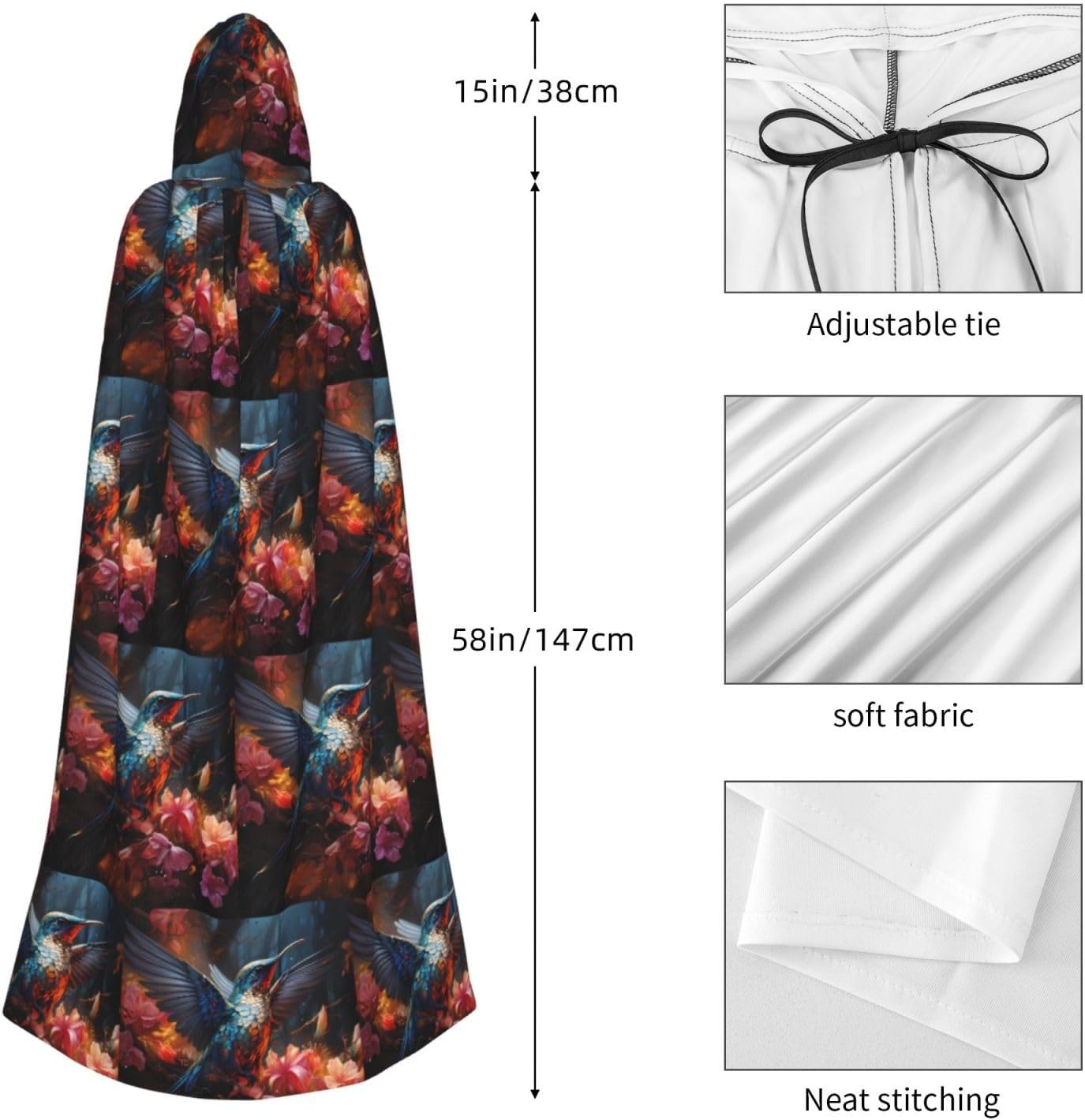 Materiale e design colibrì: il tessuto è realizzato in 100% fibra di poliestere (poliestere) tessuto di alta qualità, morbido e confortevole. Il design con cappuccio non è solo elegante e bello, ma fornisce anche calore extra alla testa e al collo. \r Caratteristiche del prodotto: il poncho oversize con cappuccio è un poncho con cappuccio senza lacci, senza cerniera, comodo realizzato in tessuto lungo, resistente e non prurito. \r Dimensioni del prodotto: il cappello misura 38,1 cm di altezza, 147,3 cm di lunghezza, 154 cm di larghezza. \r Adatto per occasioni: feste di Natale, feste di Halloween, feste in costume, celebrazioni pagane. Ideale per travestimenti, cosplay, costumi da scena, streghe, vampiri, royalty, scelta regalo perfetta per amici o familiari. \r Persone applicabili: adulti, unisex.