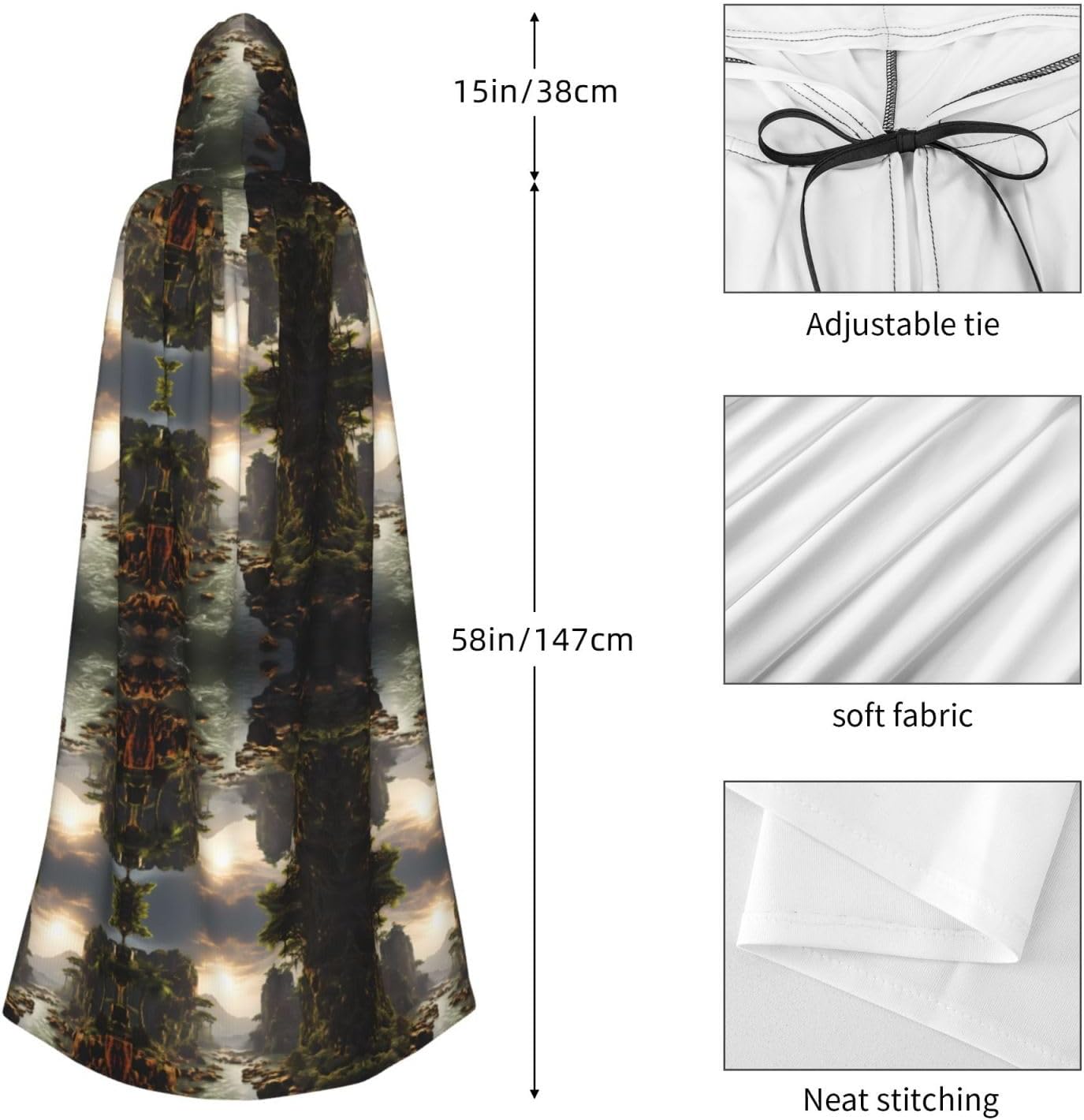 Materiale e design di montagne e fiumi: il tessuto è realizzato in 100% fibra di poliestere (poliestere) tessuto di alta qualità, morbido e confortevole. Il design con cappuccio non è solo elegante e bello, ma fornisce anche calore extra alla testa e al collo. \r Caratteristiche del prodotto: il poncho oversize con cappuccio è un poncho con cappuccio senza lacci, senza cerniera, comodo realizzato in tessuto lungo, resistente e non prurito. \r Dimensioni del prodotto: il cappello misura 38,1 cm di altezza, 147,3 cm di lunghezza, 154 cm di larghezza. \r Adatto per occasioni: feste di Natale, feste di Halloween, feste in costume, celebrazioni pagane. Ideale per travestimenti, cosplay, costumi da scena, streghe, vampiri, royalty, scelta regalo perfetta per amici o familiari. \r Persone applicabili: adulti, unisex.