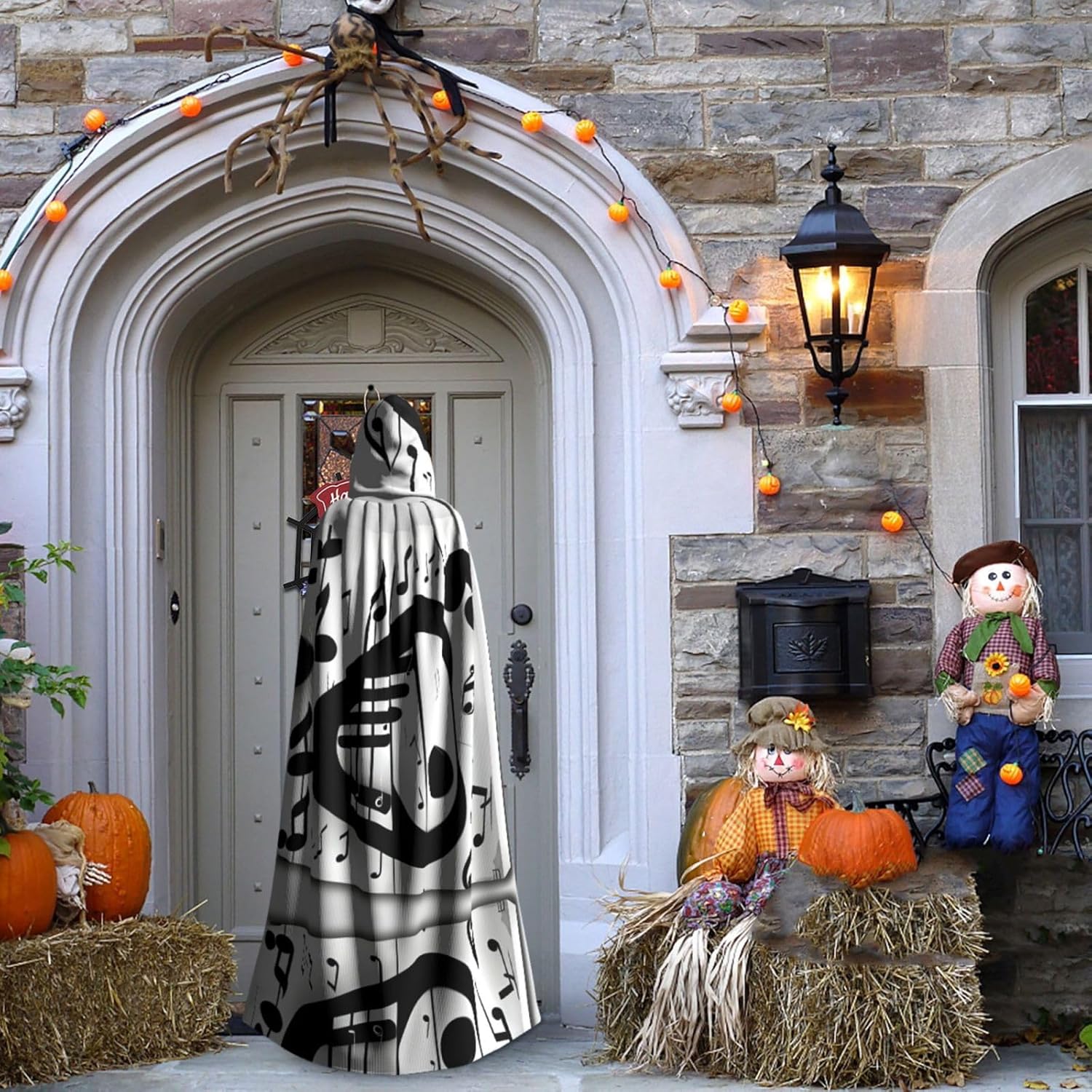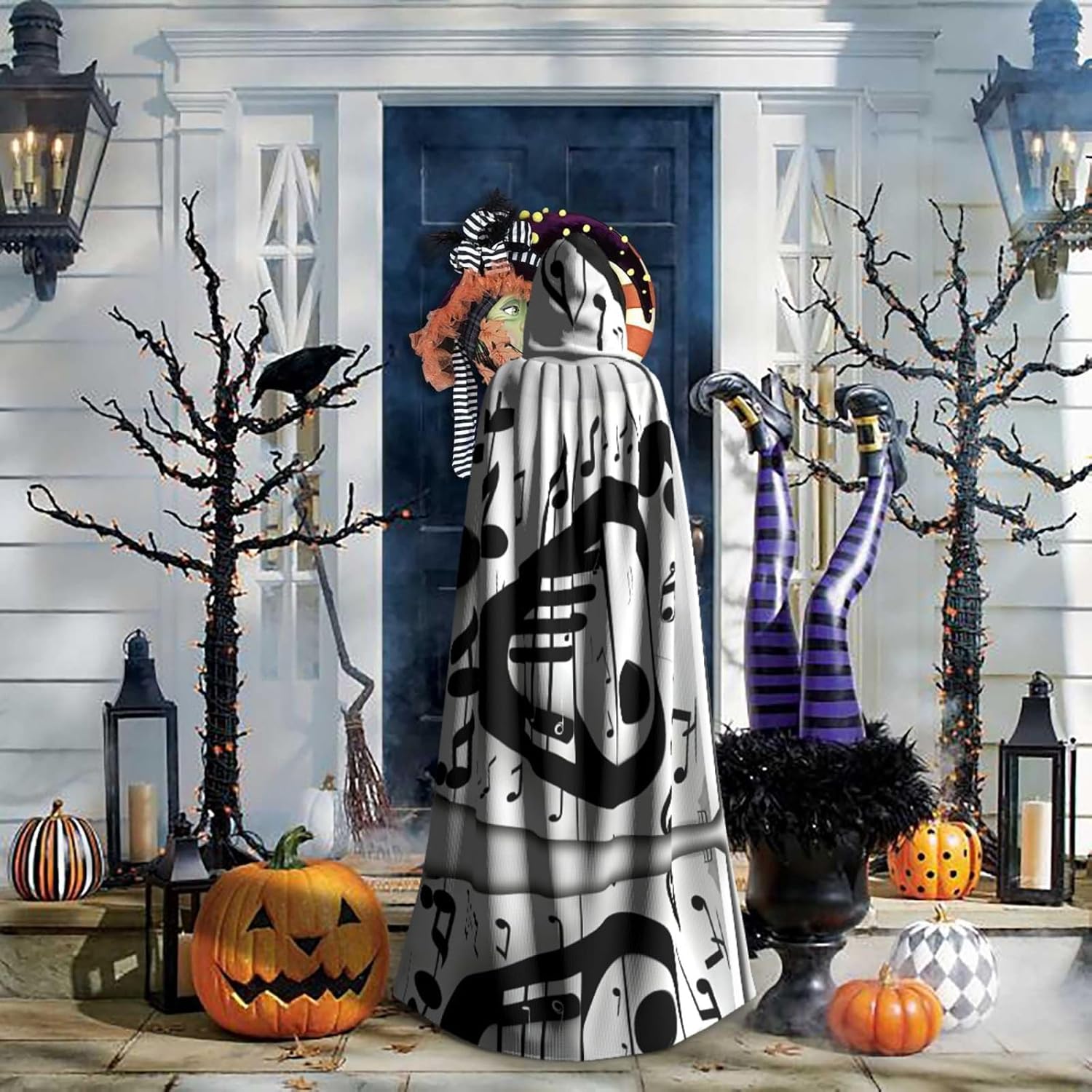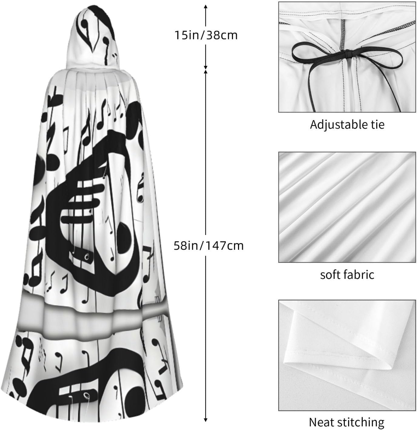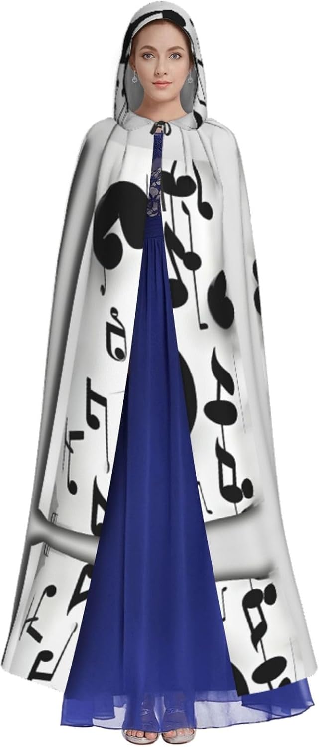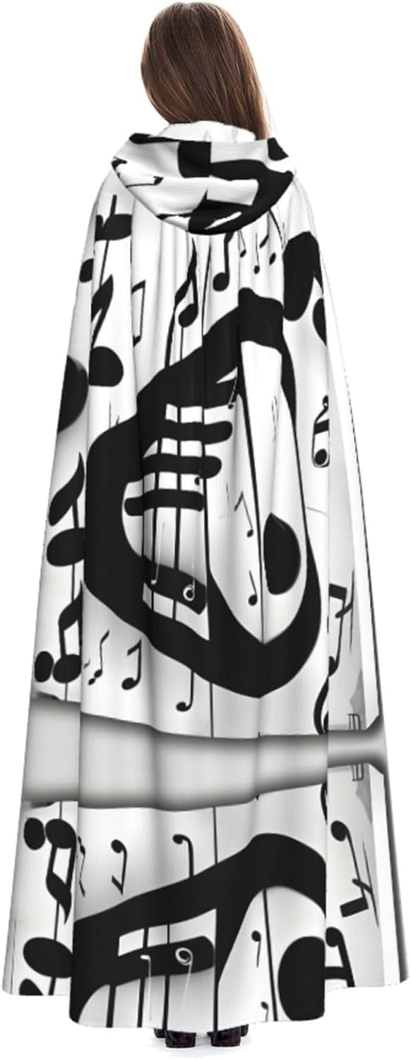 Mantello con cappuccio con note musicali bianche e nere unisex per Halloween, Natale, vampiro, stregone, costume cosplay