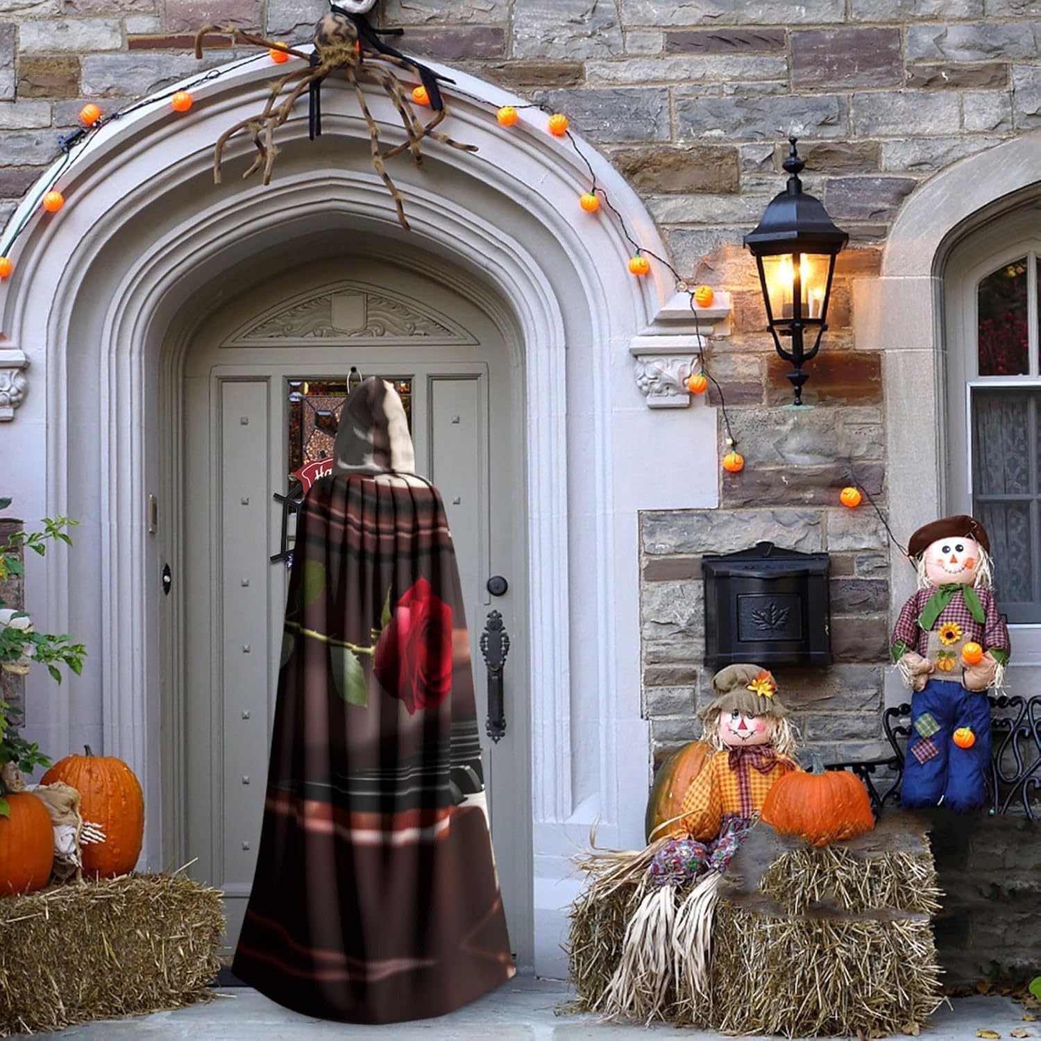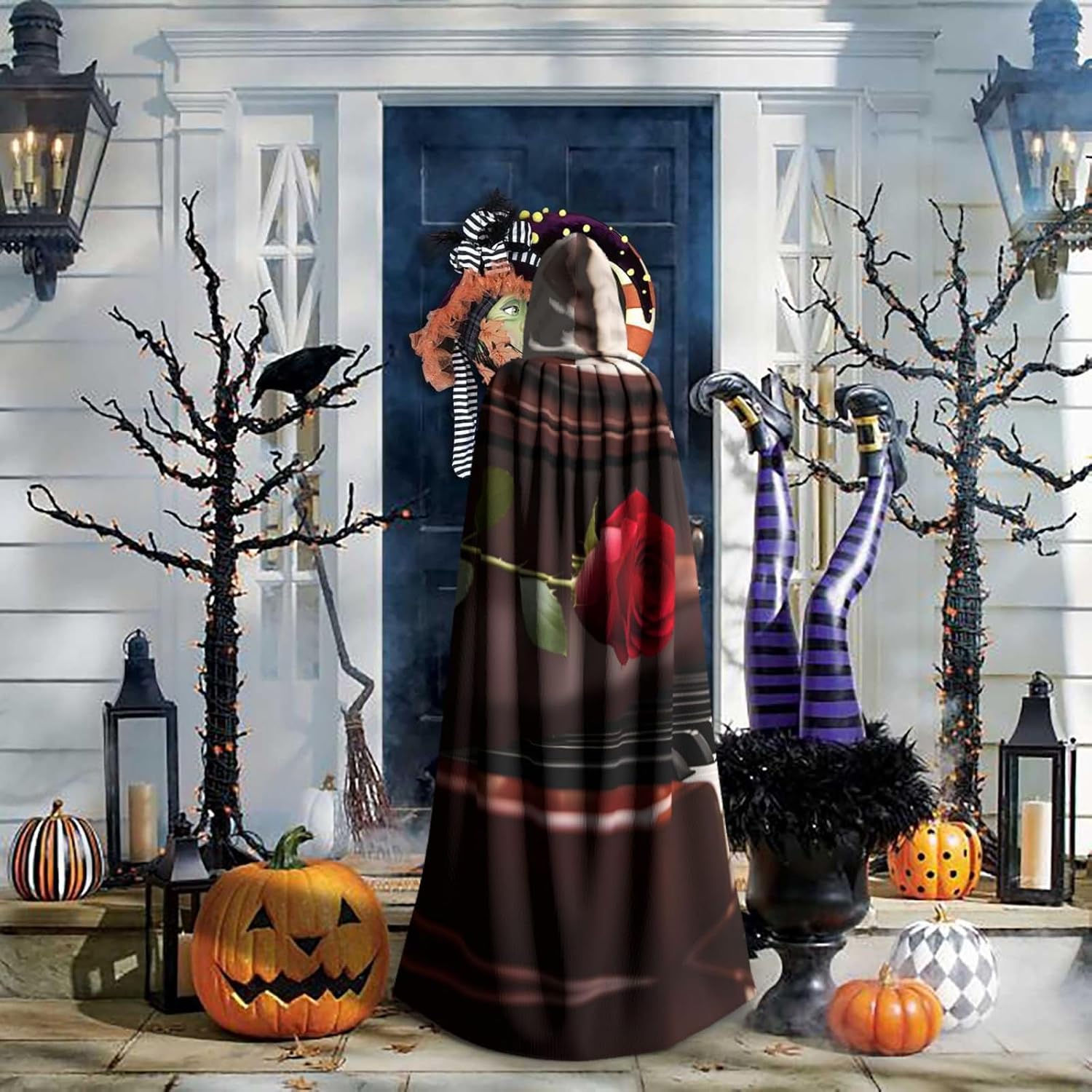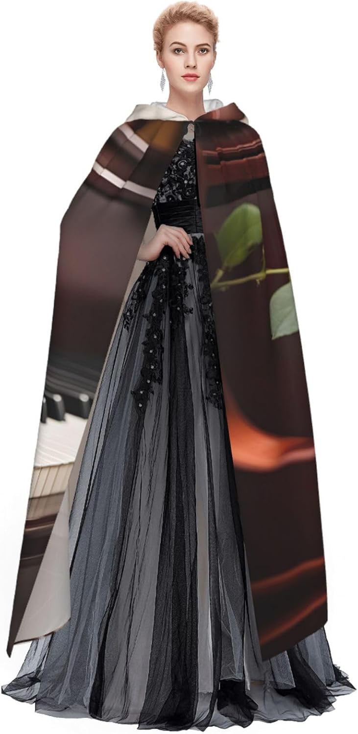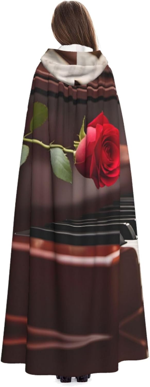 Mantello con cappuccio con rosa rossa su pianoforte, unisex, per Halloween, Natale, vampiro, stregone, costume cosplay