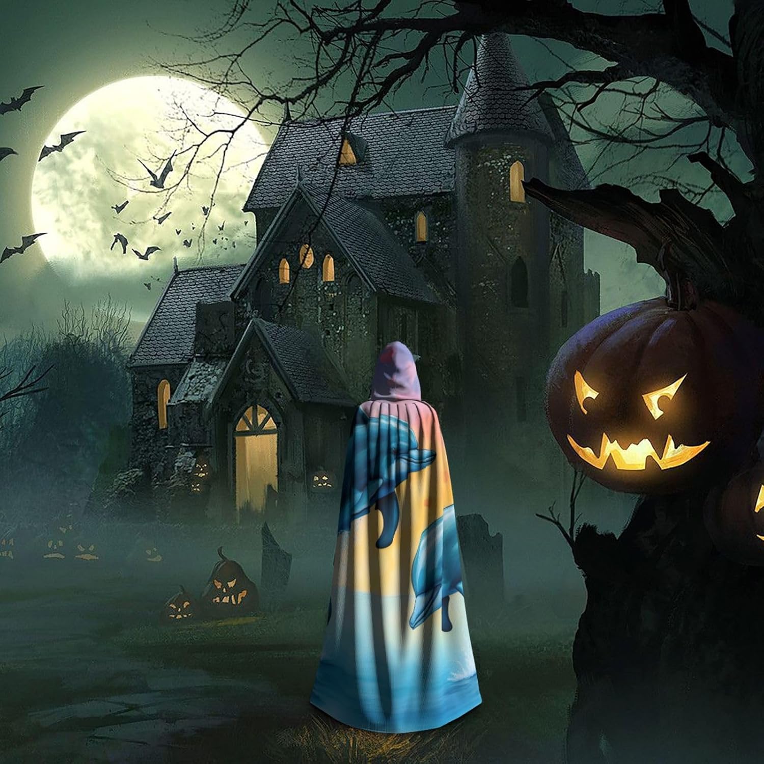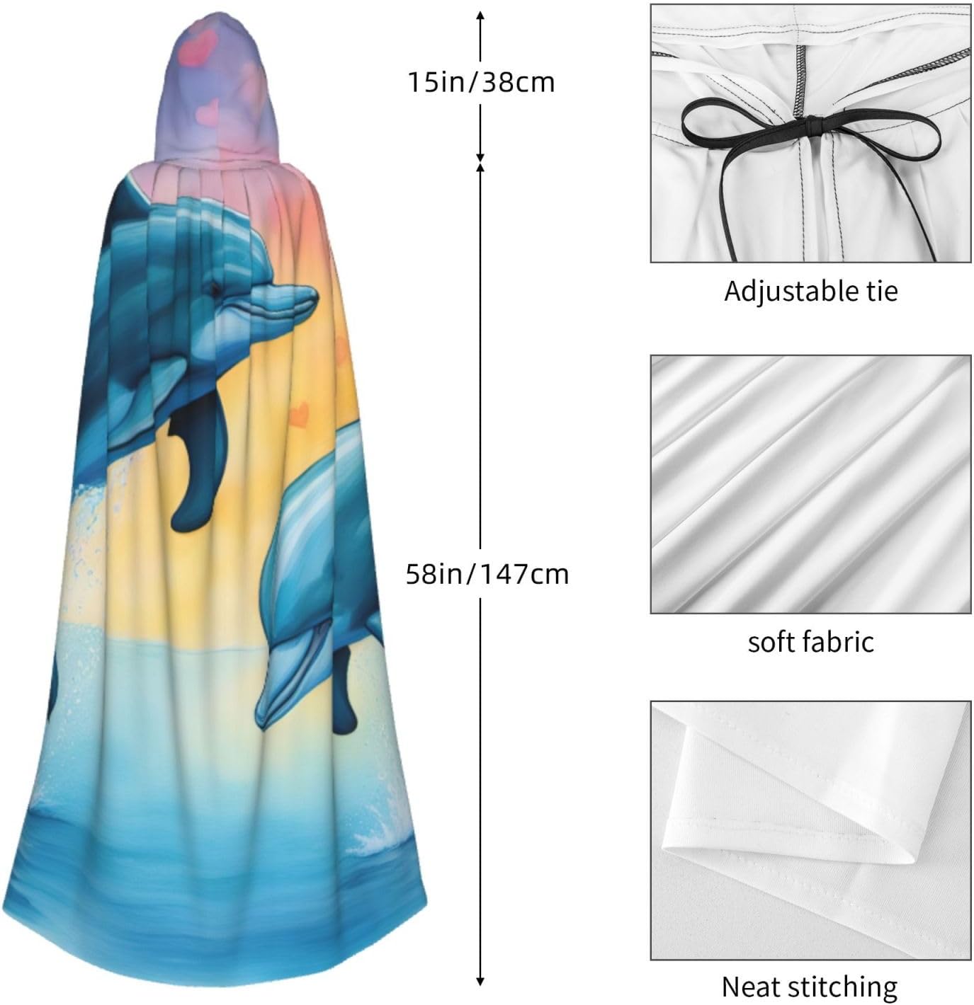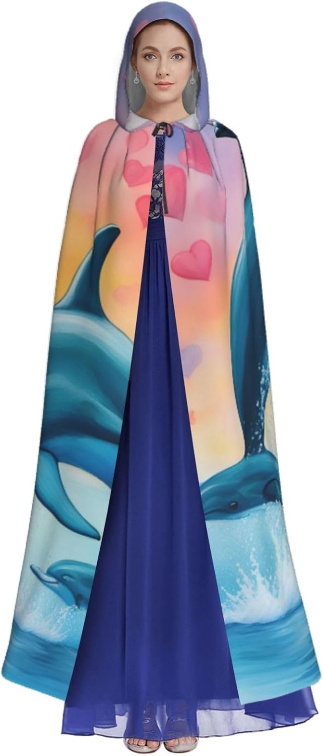 Il design senza cerniera, abbinato a un grande mantello con cappuccio e cravatta al collo, migliora il tuo mistero mantenendoti comodo con il suo tessuto non prurito. Con una lunghezza di 147 cm, larghezza di 154 cm e un'altezza del cappuccio di 38 cm, il nostro mantello con cappuccio con stampa delfini innamorati offre una copertura completa, assicurandoti di distinguerti in ogni occasione. Vari eventi come Halloween, cosplay, costumi da palcoscenico, feste a tema, balli, convegni di fumetti e molto altro ancora, il nostro mantello è versatile e conveniente. Facile da mantenere e di lunga durata, il nostro mantello con cappuccio con stampa delfini innamorati è lavabile in lavatrice e lavabile a mano. Con un design neutro, il nostro mantello è perfetto per uomini e donne.