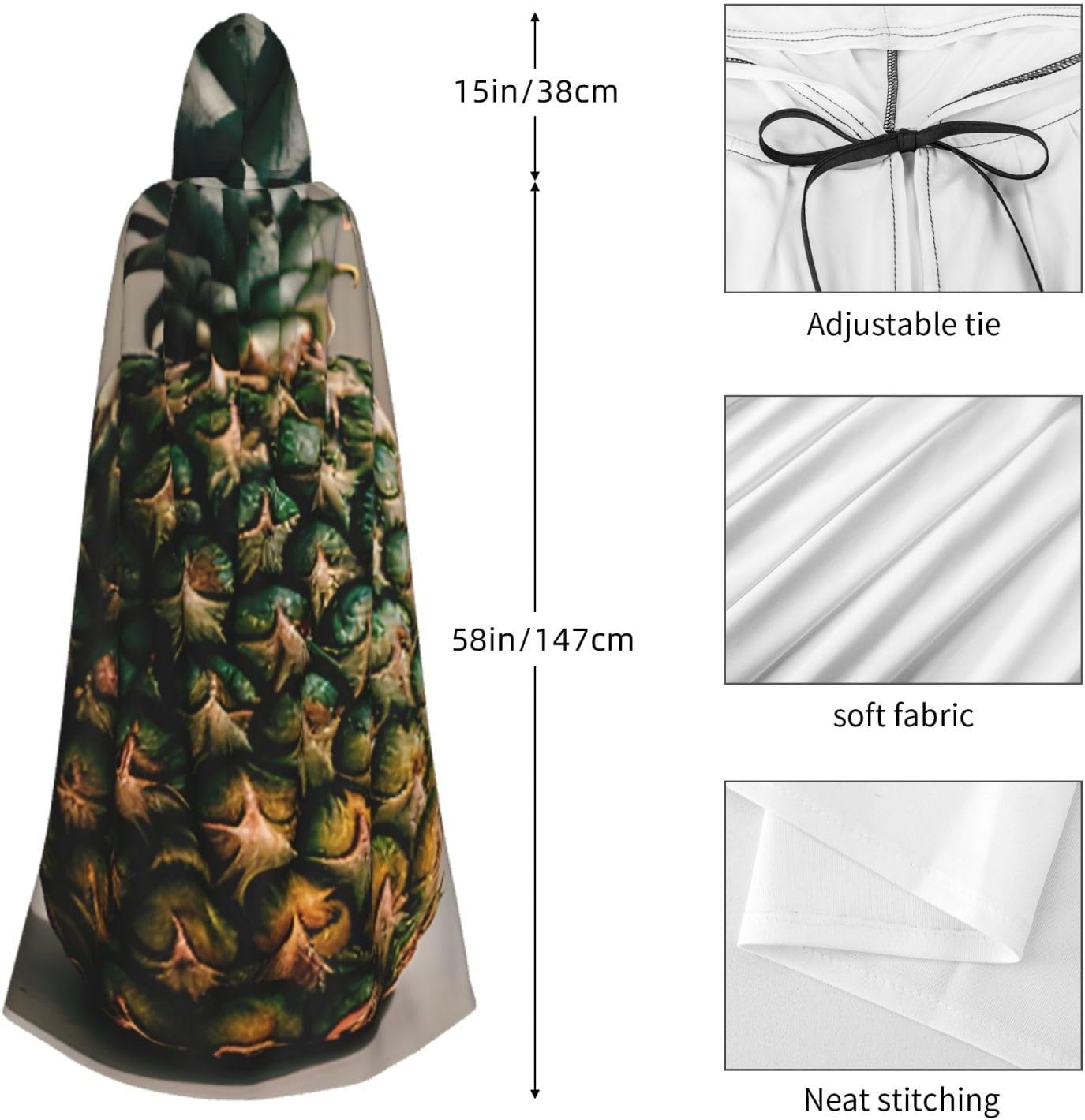 Il design senza cerniera, abbinato a un grande mantello con cappuccio e cravatta al collo, migliora il tuo mistero mantenendoti comodo con il suo tessuto non prurito. Con una lunghezza di 147 cm, larghezza di 154 cm e un'altezza del cappuccio di 38 cm, il nostro mantello con cappuccio con stampa di ananas offre una copertura completa, assicurandoti di distinguerti in ogni occasione. Vari eventi come Halloween, cosplay, costumi da palcoscenico, feste a tema, balli, convegni di fumetti e molto altro ancora, il nostro mantello è versatile e conveniente. Facile da mantenere e di lunga durata, il nostro mantello con cappuccio con stampa di ananas è lavabile in lavatrice e lavabile a mano. Con un design neutro, il nostro mantello è perfetto per uomini e donne.