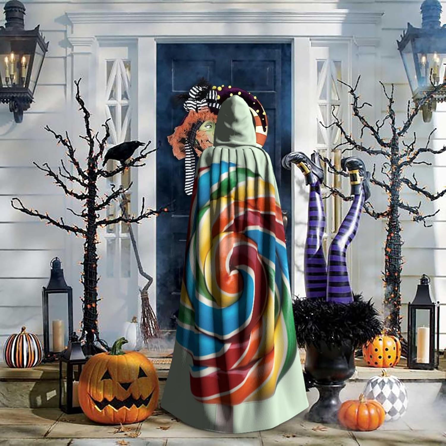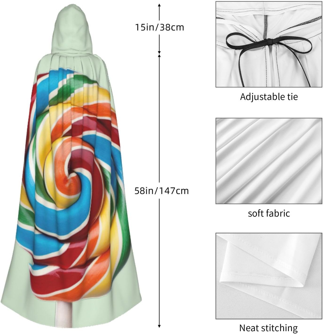 Il design senza cerniera, abbinato a un grande mantello con cappuccio e cravatta al collo, migliora il tuo mistero mantenendoti comodo con il suo tessuto non prurito. Con una lunghezza di 147 cm, larghezza di 154 cm e un'altezza del cappuccio di 38 cm, il nostro mantello con cappuccio con stampa lecca-lecca offre una copertura completa, assicurandoti di distinguerti in ogni occasione. Vari eventi come Halloween, cosplay, costumi da palcoscenico, feste a tema, balli, convegni di fumetti e molto altro ancora, il nostro mantello è versatile e conveniente. Facile da mantenere e di lunga durata, il nostro mantello con cappuccio con stampa lecca-lecca è lavabile in lavatrice e lavabile a mano. Con un design neutro, il nostro mantello è perfetto per uomini e donne.