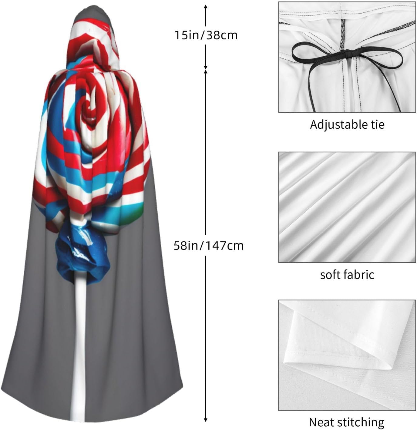 Il design senza cerniera, abbinato a un grande mantello con cappuccio e cravatta al collo, migliora il tuo mistero mantenendoti comodo con il suo tessuto non prurito. Con una lunghezza di 147 cm, larghezza di 154 cm e un'altezza del cappuccio di 38 cm, il nostro mantello con cappuccio con stampa lecca-lecca offre una copertura completa, assicurandoti di distinguerti in ogni occasione. Vari eventi come Halloween, cosplay, costumi da palcoscenico, feste a tema, balli, convegni di fumetti e molto altro ancora, il nostro mantello è versatile e conveniente. Facile da mantenere e di lunga durata, il nostro mantello con cappuccio con stampa lecca-lecca è lavabile in lavatrice e lavabile a mano. Con un design neutro, il nostro mantello è perfetto per uomini e donne.