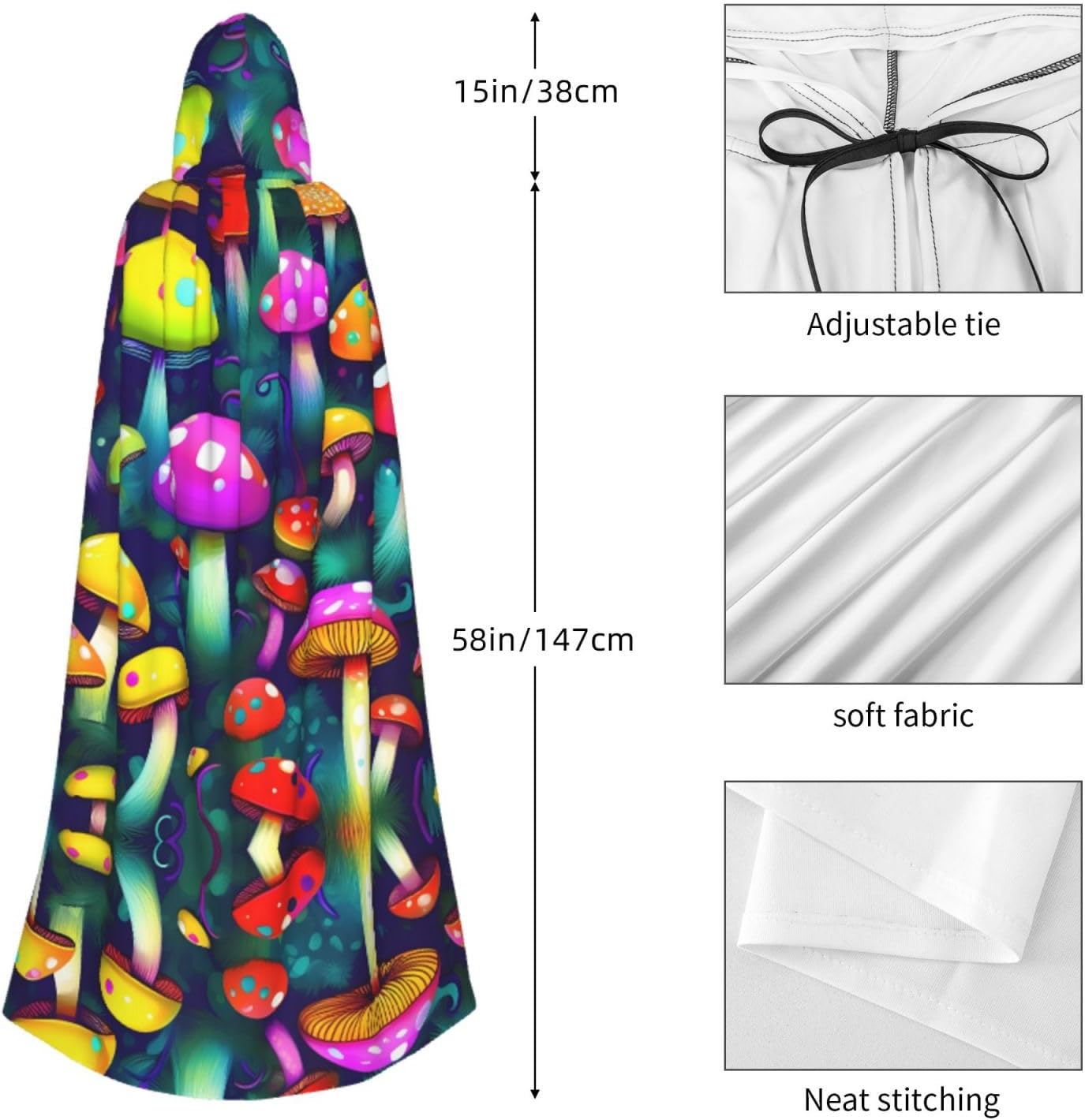 Il mantello con cappuccio per Halloween è realizzato con tessuto in poliestere morbido anche sulla pelle, prevenendo qualsiasi irritazione. Il mantello presenta un ampio cappuccio e uno stile annodato senza cerniere per un design sofisticato ed elegante. Con la sua dimensione universale, offre una copertura completa, adatta a tutti, assicurandoti di distinguerti tra la folla. Questo mantello con stampa artistica con funghi luminosi non è solo per Halloween; è abbastanza versatile per cosplay, spettacoli teatrali, balli in maschera, feste a tema e molto altro ancora.