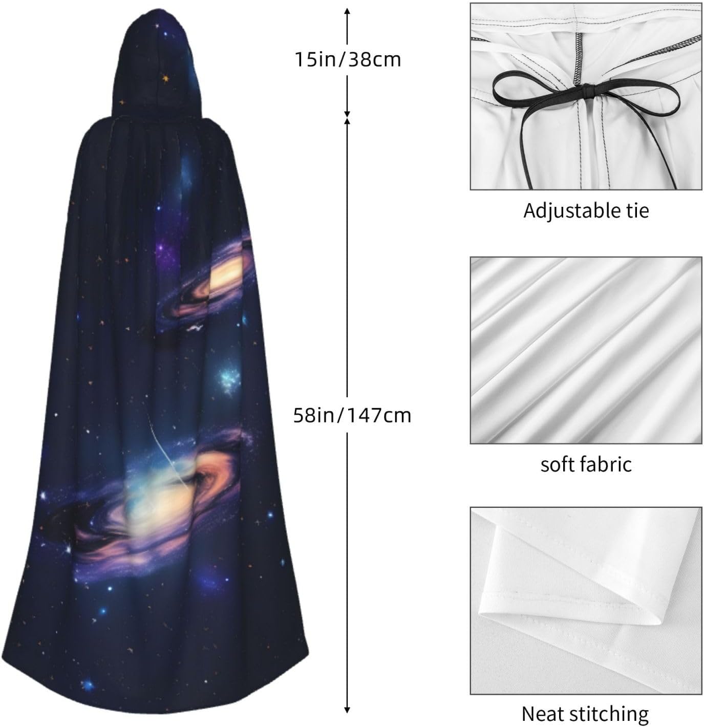 Il mantello con cappuccio per Halloween è realizzato con tessuto in poliestere morbido anche sulla pelle, prevenendo qualsiasi irritazione. Il mantello presenta un ampio cappuccio e uno stile annodato senza cerniere per un design sofisticato ed elegante. Con la sua dimensione universale, offre una copertura completa, adatta a tutti, assicurandoti di distinguerti tra la folla. Questo mantello con stampa galassia nell'universo non è solo per Halloween; è abbastanza versatile per cosplay, spettacoli teatrali, balli in maschera, feste a tema e molto altro ancora.