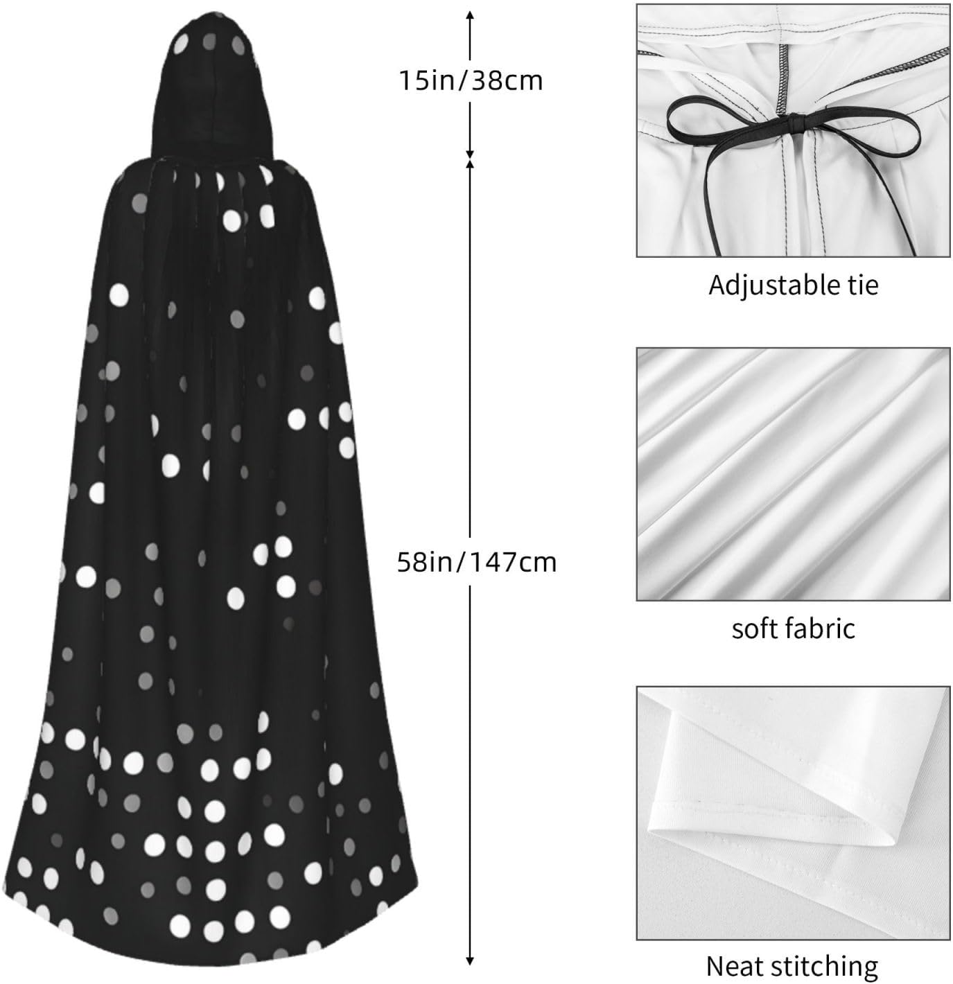 Il design senza cerniera, abbinato a un grande mantello con cappuccio e cravatta al collo, migliora il tuo mistero mantenendoti comodo con il suo tessuto non prurito. Con una lunghezza di 147 cm, larghezza di 154 cm e un'altezza del cappuccio di 38 cm, il nostro mantello nero con cappuccio con stampa a pois offre una copertura completa, assicurandoti di distinguerti in ogni occasione. Vari eventi come Halloween, cosplay, costumi da palcoscenico, feste a tema, balli, convegni di fumetti e molto altro ancora, il nostro mantello è versatile e conveniente. Facile da mantenere e di lunga durata, il nostro mantello nero con cappuccio con stampa a pois rotondi è lavabile in lavatrice e lavabile a mano. Con un design neutro, il nostro mantello è perfetto per uomini e donne.