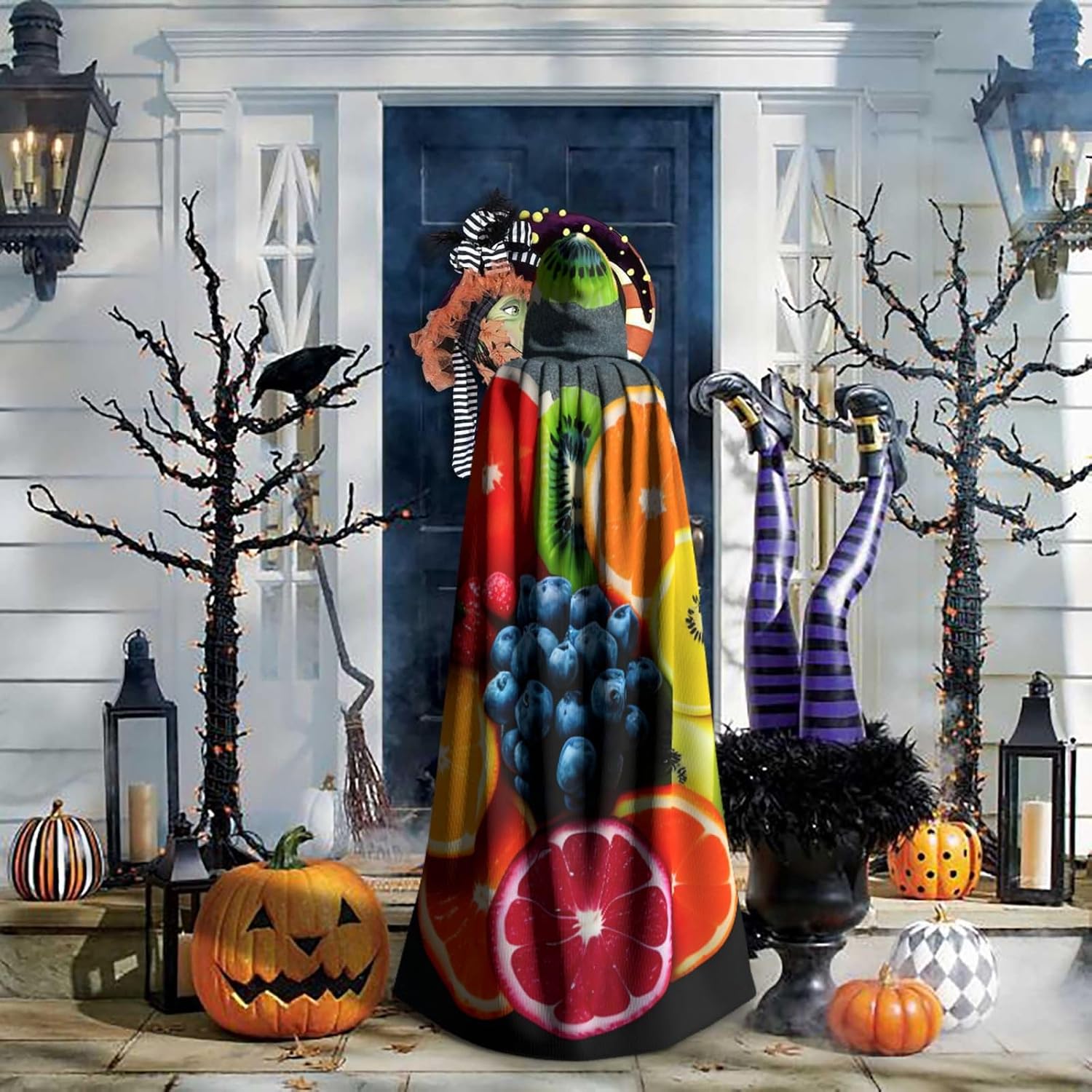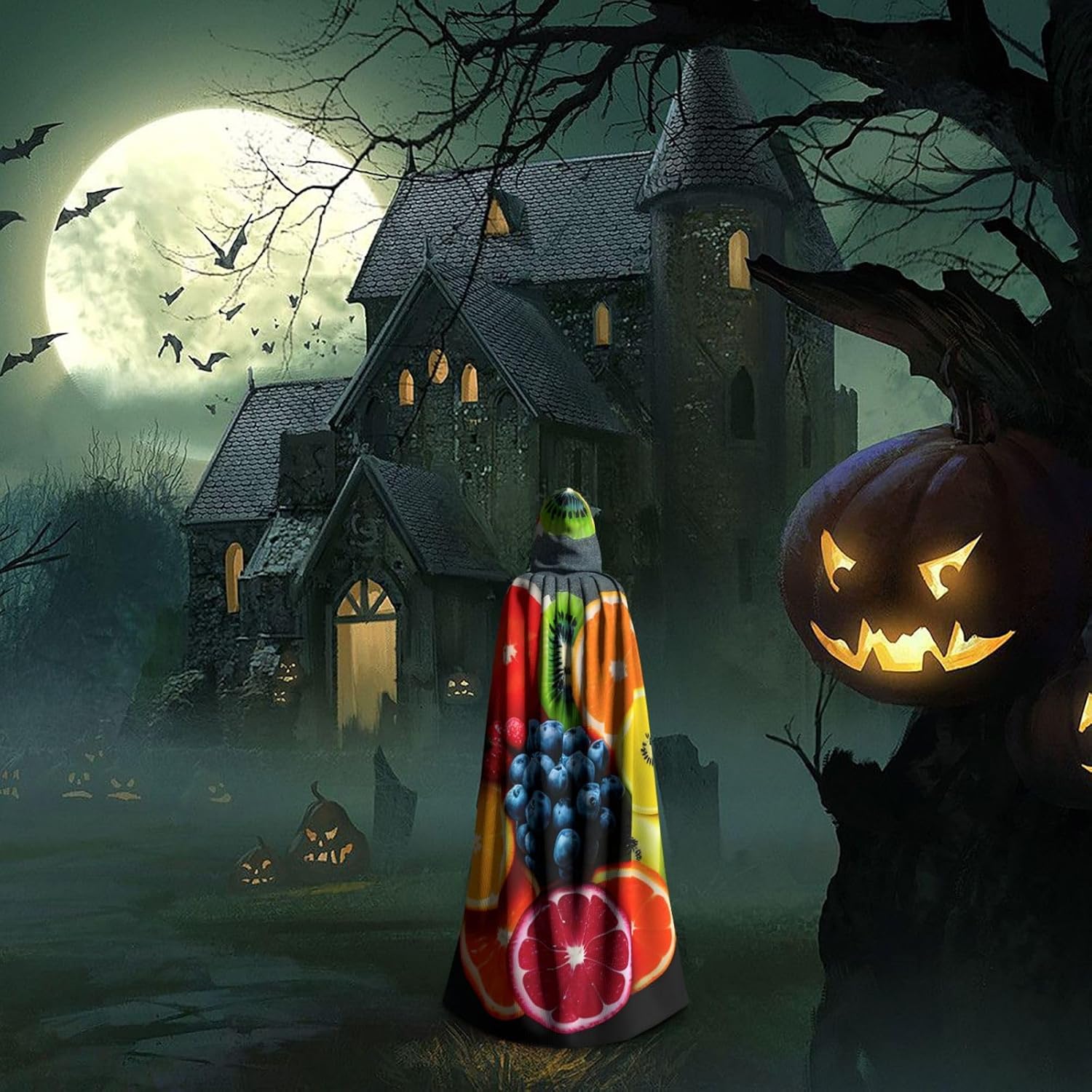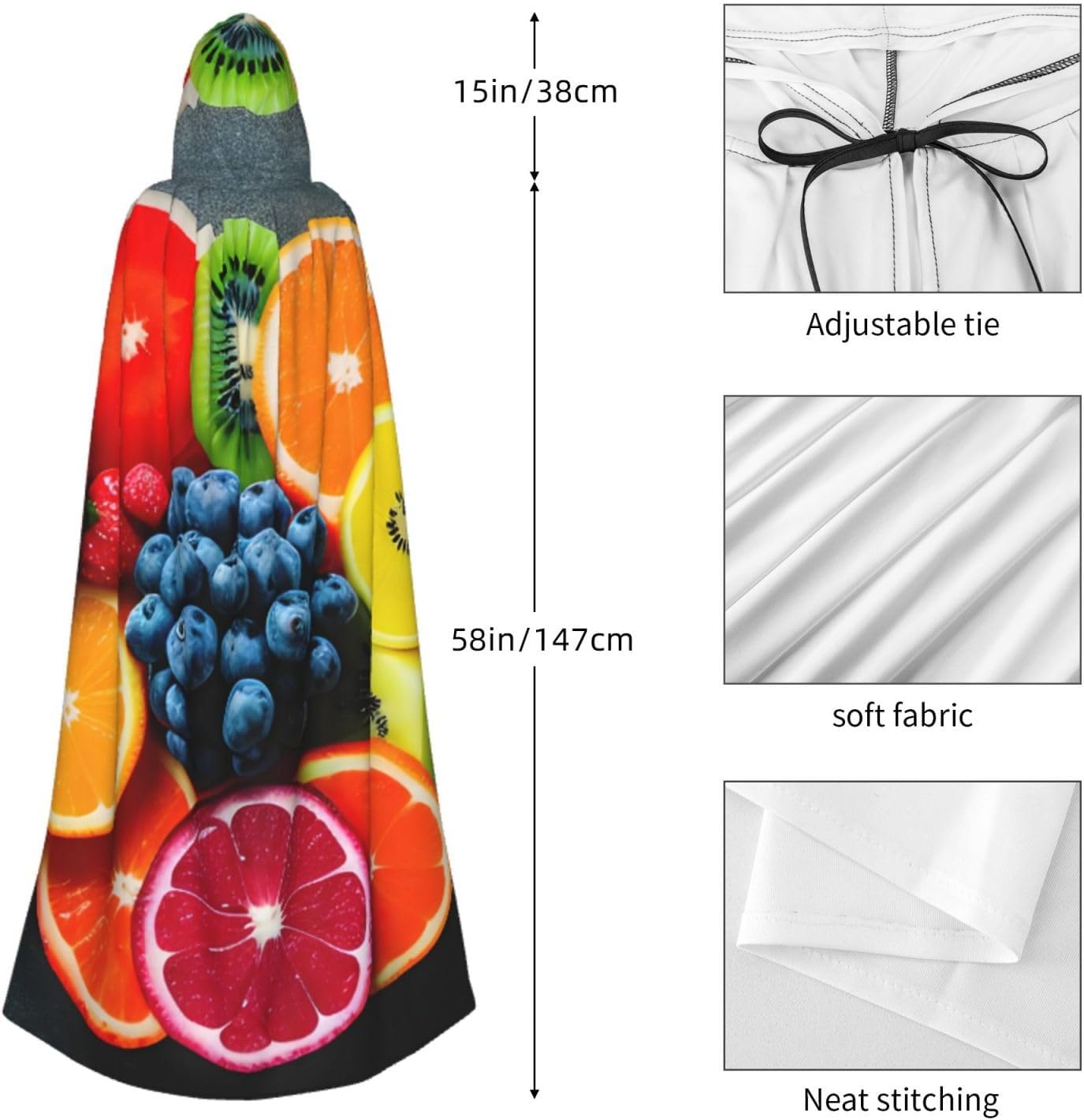 Ruba lo spettacolo a qualsiasi evento di Halloween o a tema con il nostro mantello con cappuccio. Realizzato con un tessuto confortevole, non pruriginoso, questo mantello con stampa arcobaleno di frutta è progettato per assicurarti di distinguerti tra la folla. Il mantello è facile da indossare e togliere, grazie alla cravatta e all'assenza di una cerniera. Con un design facile da pulire, può essere lavato in lavatrice o a mano per garantire che sia sempre pronto per il tuo prossimo evento. Prova la perfetta miscela di comfort, stile e versatilità con il nostro mantello con cappuccio.