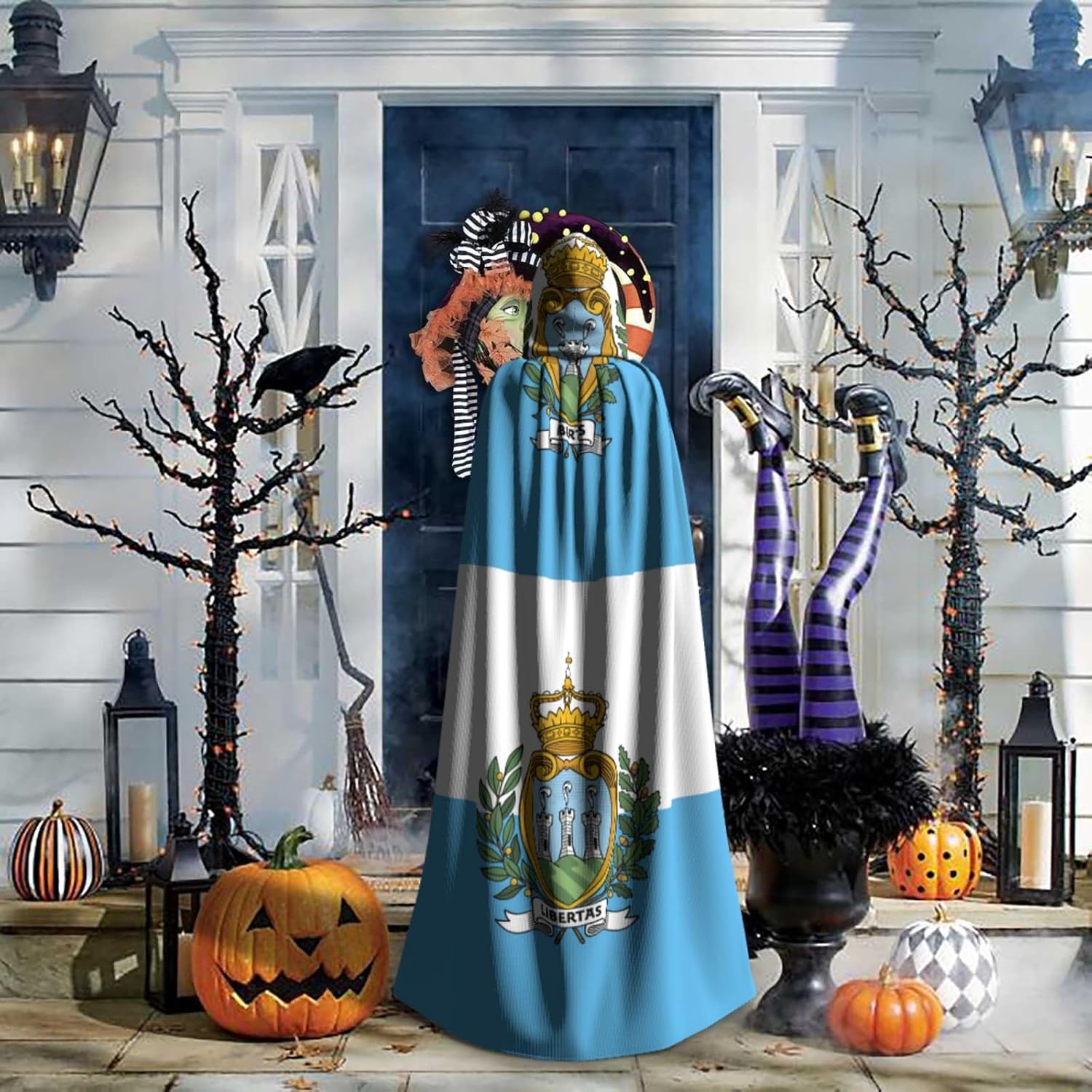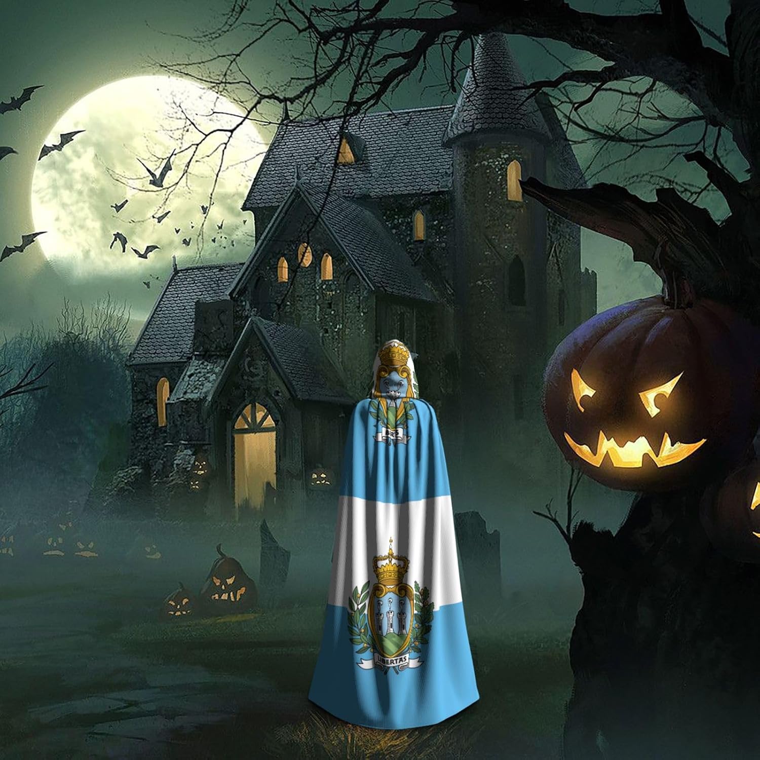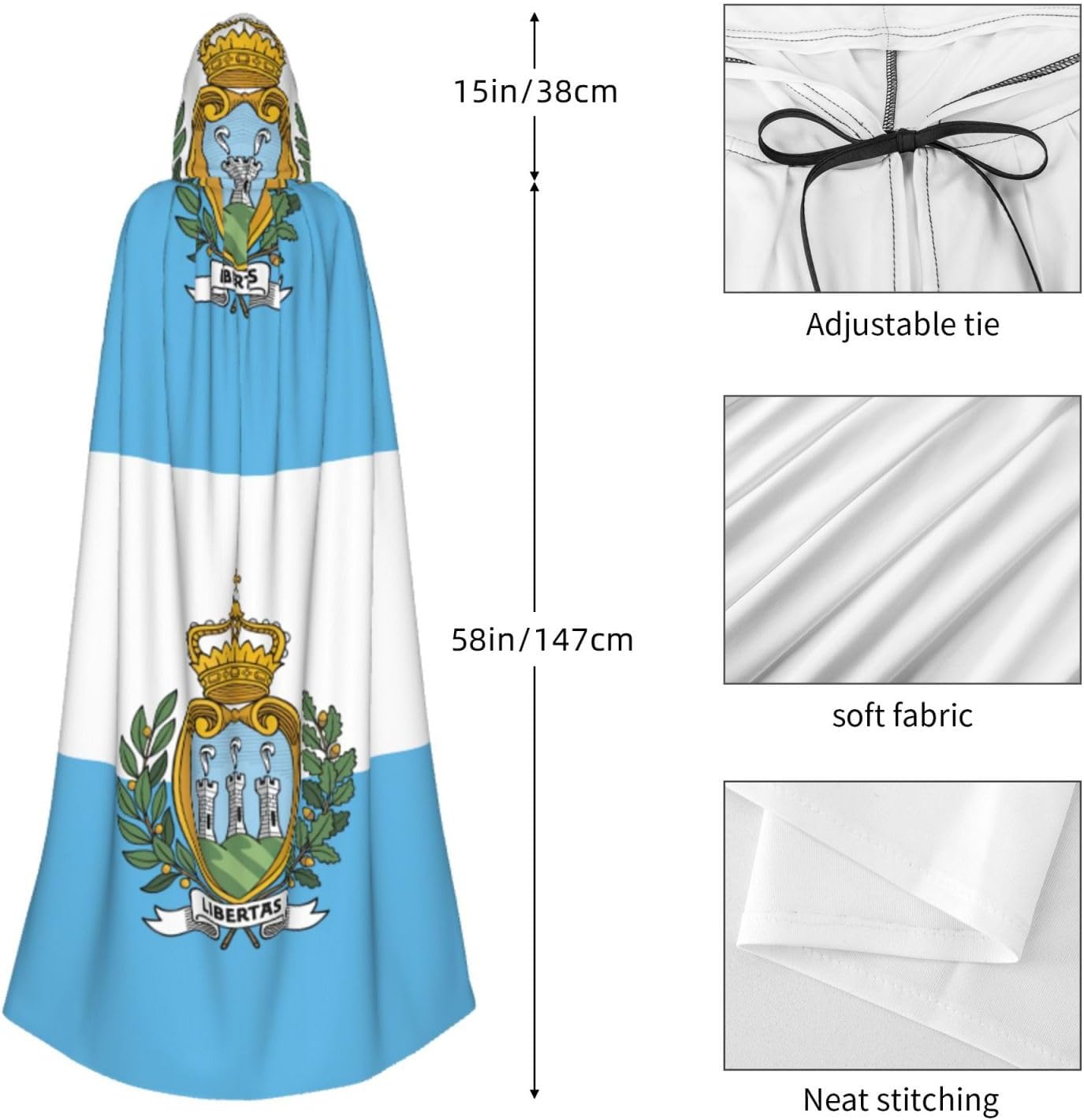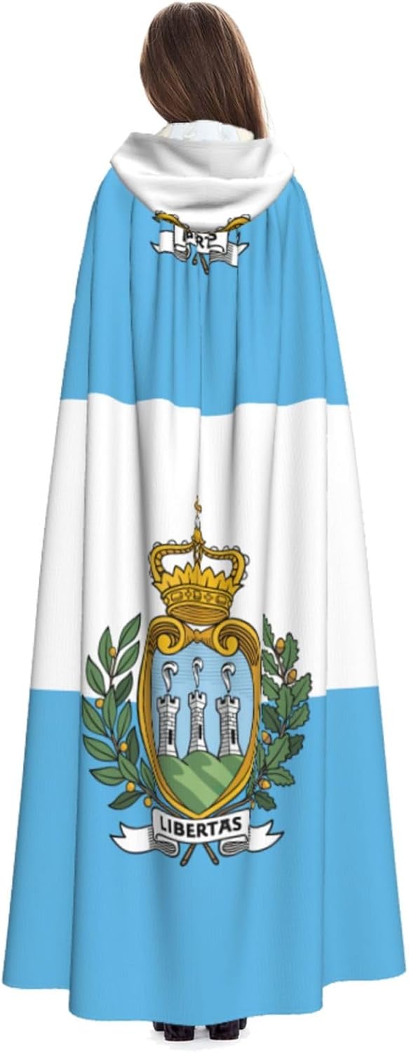 Il design senza cerniera, abbinato a un grande mantello con cappuccio e cravatta al collo, migliora il tuo mistero mantenendoti comodo con il suo tessuto non prurito. Con una lunghezza di 147 cm, larghezza di 154 cm e un'altezza del cappuccio di 38 cm, il nostro mantello con cappuccio con stampa bandiera di San Marino offre una copertura completa, assicurandoti di distinguerti in ogni occasione. Vari eventi come Halloween, cosplay, costumi da palcoscenico, feste a tema, balli, convegni di fumetti e molto altro ancora, il nostro mantello è versatile e conveniente. Facile da mantenere e di lunga durata, il nostro mantello con cappuccio con stampa bandiera di San Marino è lavabile in lavatrice e lavabile a mano. Con un design neutro, il nostro mantello è perfetto per uomini e donne.