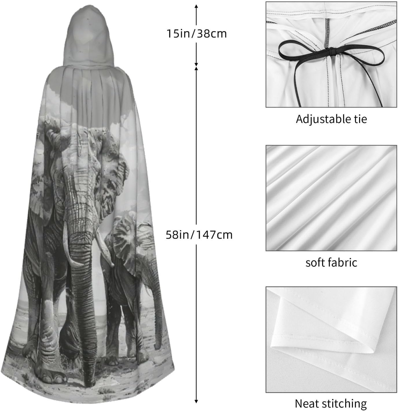 Ruba lo spettacolo a qualsiasi evento di Halloween o a tema con il nostro mantello con cappuccio. Realizzato con un tessuto confortevole, non pruriginoso, questo vecchio mantello con stampa di elefanti e giovani elefanti è progettato per assicurarti di distinguerti tra la folla. Il mantello è facile da indossare e togliere, grazie alla cravatta e all'assenza di una cerniera. Con un design facile da pulire, può essere lavato in lavatrice o a mano per garantire che sia sempre pronto per il tuo prossimo evento. Prova la perfetta miscela di comfort, stile e versatilità con il nostro mantello con cappuccio.