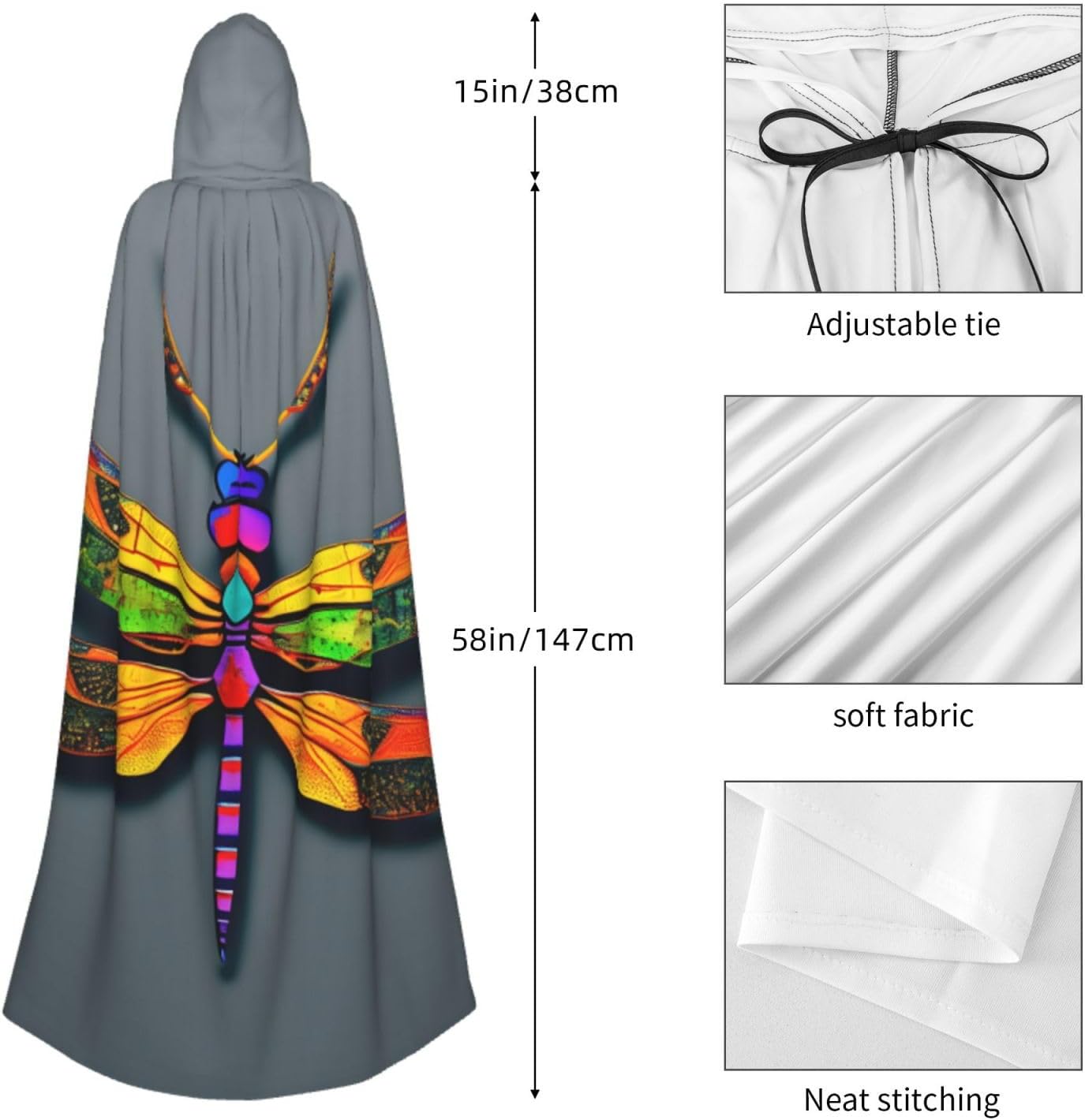 Ruba lo spettacolo a qualsiasi evento di Halloween o a tema con il nostro mantello con cappuccio. Realizzato con un tessuto confortevole, non prurito, questo simpatico mantello con stampa libellula è progettato per assicurarti di distinguerti tra la folla. Il mantello è facile da indossare e togliere, grazie alla cravatta e all'assenza di una cerniera. Con un design facile da pulire, può essere lavato in lavatrice o a mano per garantire che sia sempre pronto per il tuo prossimo evento. Prova la perfetta miscela di comfort, stile e versatilità con il nostro mantello con cappuccio.