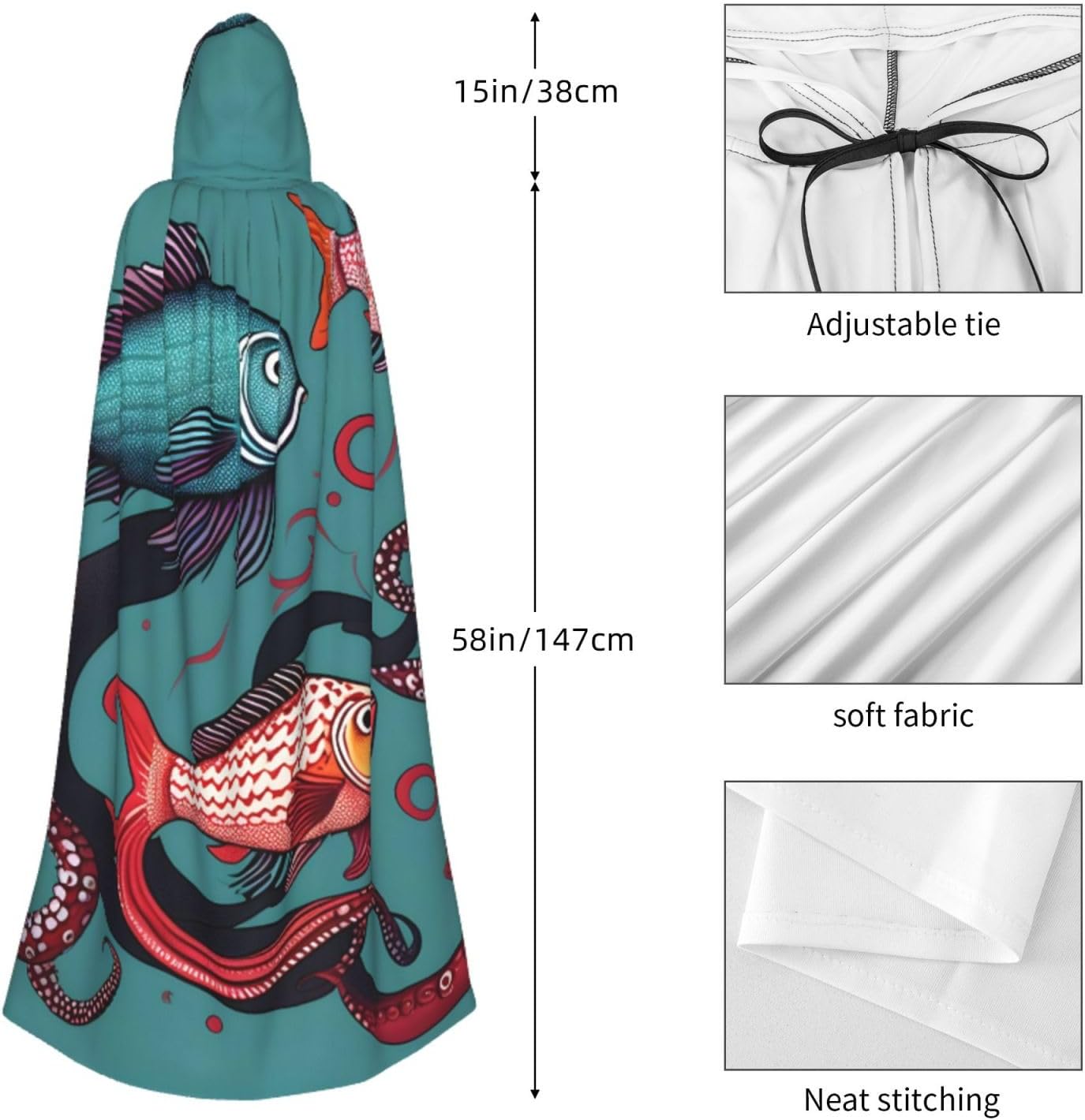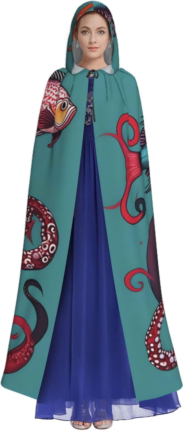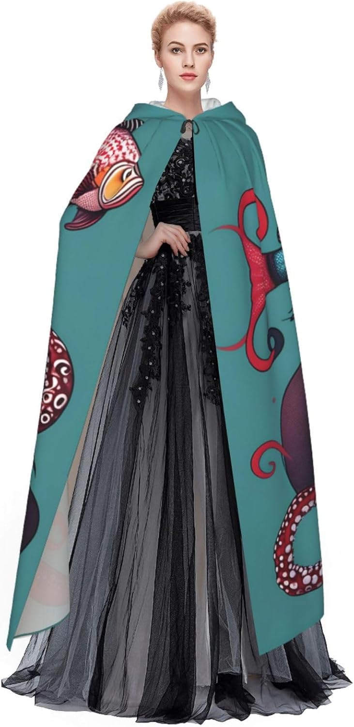 Ruba lo spettacolo a qualsiasi evento di Halloween o a tema con il nostro mantello con cappuccio. Realizzato con un tessuto confortevole, non pruriginoso, questo mantello con stampa di pesce e polpo è progettato per assicurarti di distinguerti tra la folla. Il mantello è facile da indossare e togliere, grazie alla cravatta e all'assenza di una cerniera. Con un design facile da pulire, può essere lavato in lavatrice o a mano per garantire che sia sempre pronto per il tuo prossimo evento. Prova la perfetta miscela di comfort, stile e versatilità con il nostro mantello con cappuccio.