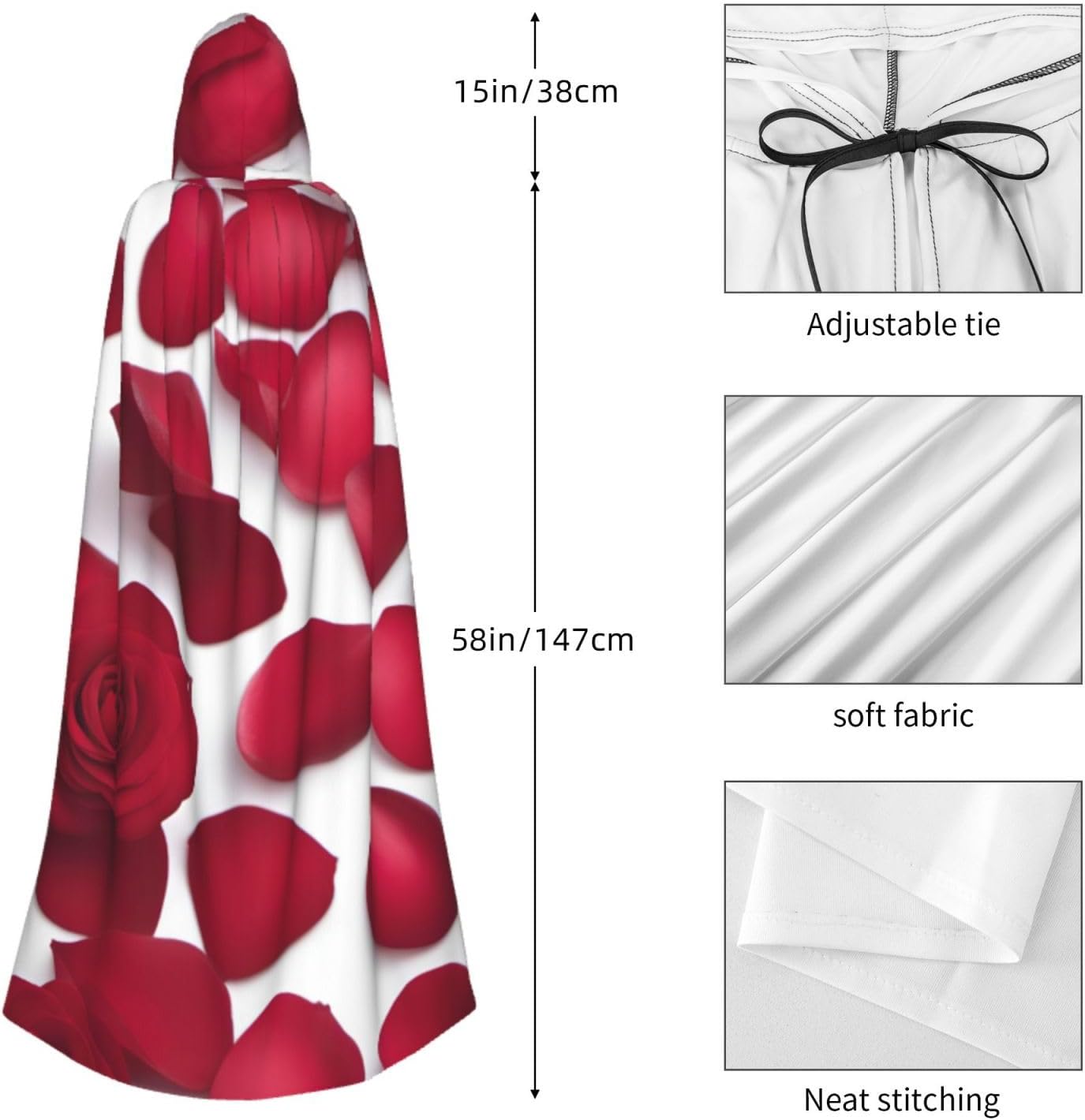 Il design senza cerniera, abbinato a un grande mantello con cappuccio e cravatta al collo, migliora il tuo mistero mantenendoti comodo con il suo tessuto non prurito. Con una lunghezza di 147 cm, larghezza di 154 cm e un'altezza del cappuccio di 38 cm, il nostro mantello con cappuccio con stampa di petali di rosa rossa offre una copertura completa, assicurandoti di distinguerti in ogni occasione. Vari eventi come Halloween, cosplay, costumi da palcoscenico, feste a tema, balli, convegni di fumetti e molto altro ancora, il nostro mantello è versatile e conveniente. Facile da mantenere e di lunga durata, il nostro mantello con cappuccio con stampa di petali di rosa rossa è lavabile in lavatrice e lavabile a mano. Con un design neutro, il nostro mantello è perfetto per uomini e donne.