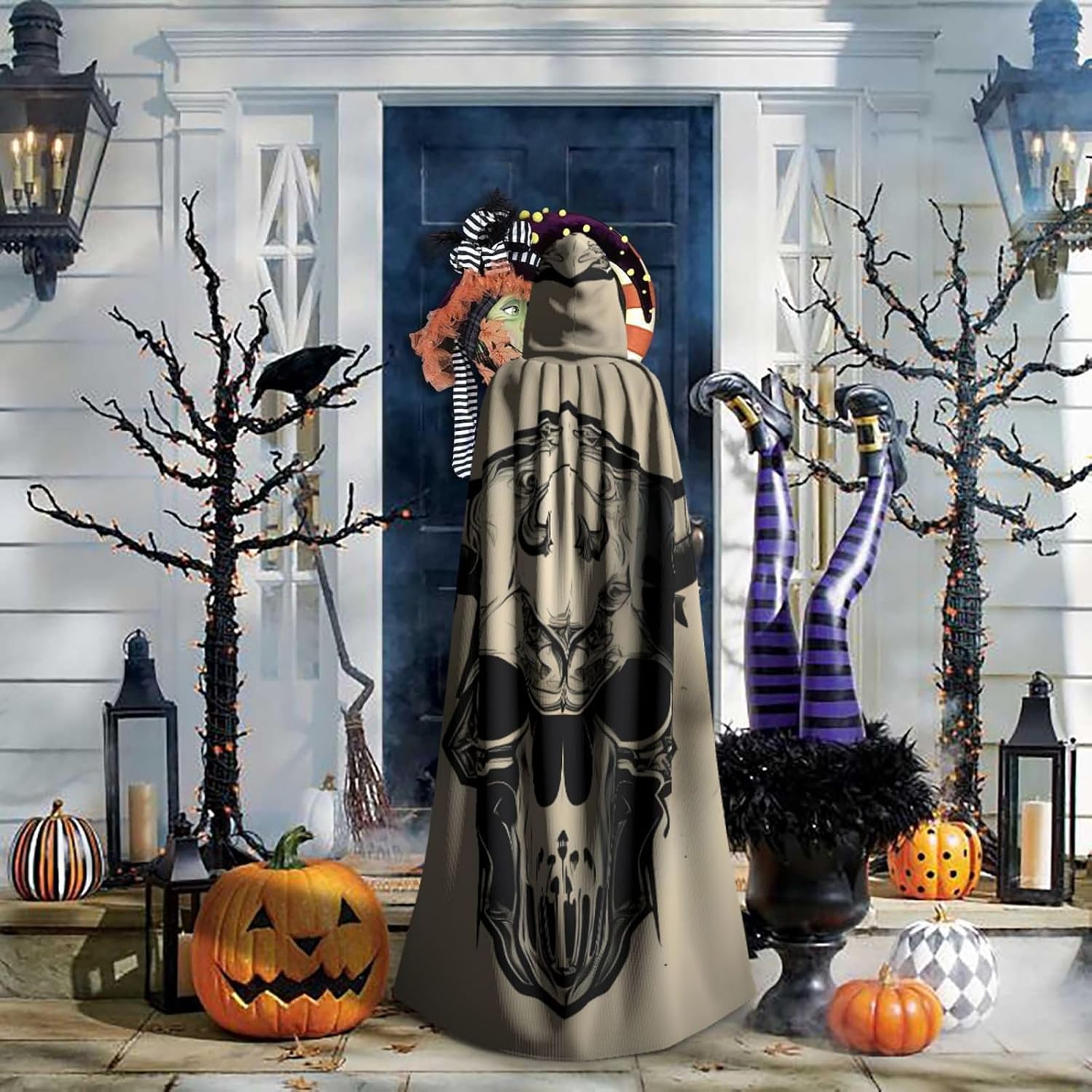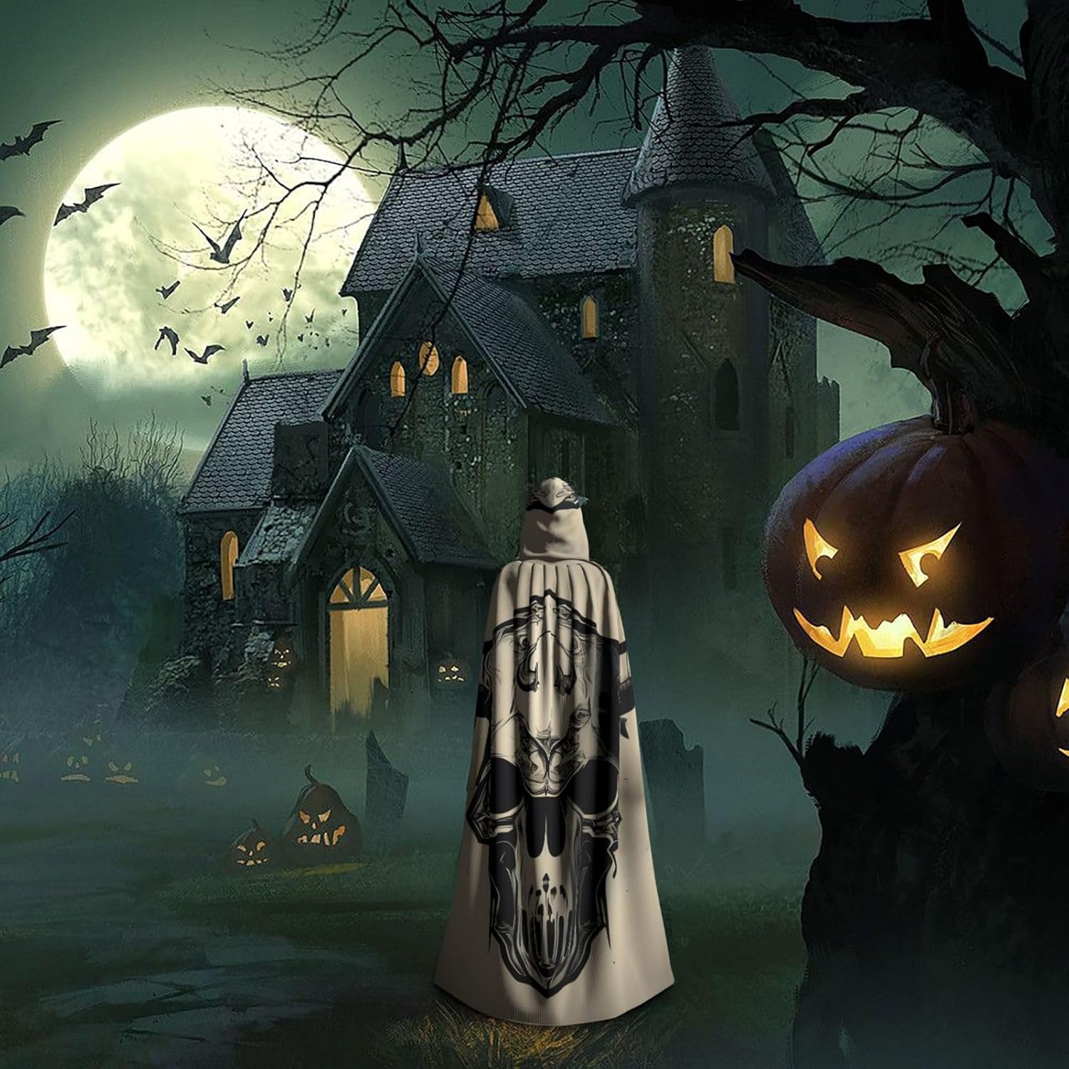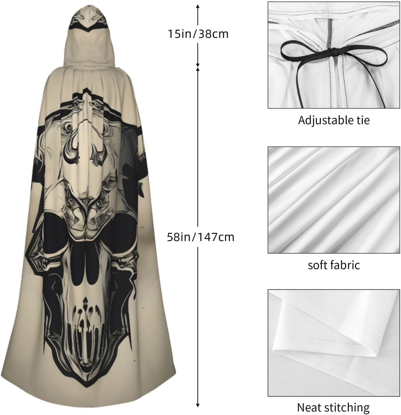 Ruba lo spettacolo a qualsiasi evento di Halloween o a tema con il nostro mantello con cappuccio. Realizzato con un tessuto confortevole, non prurito, questo mantello con stampa a teschio di toro è progettato per assicurarti di distinguerti tra la folla. Il mantello è facile da indossare e togliere, grazie alla cravatta e all'assenza di una cerniera. Con un design facile da pulire, può essere lavato in lavatrice o a mano per garantire che sia sempre pronto per il tuo prossimo evento. Prova la perfetta miscela di comfort, stile e versatilità con il nostro mantello con cappuccio.