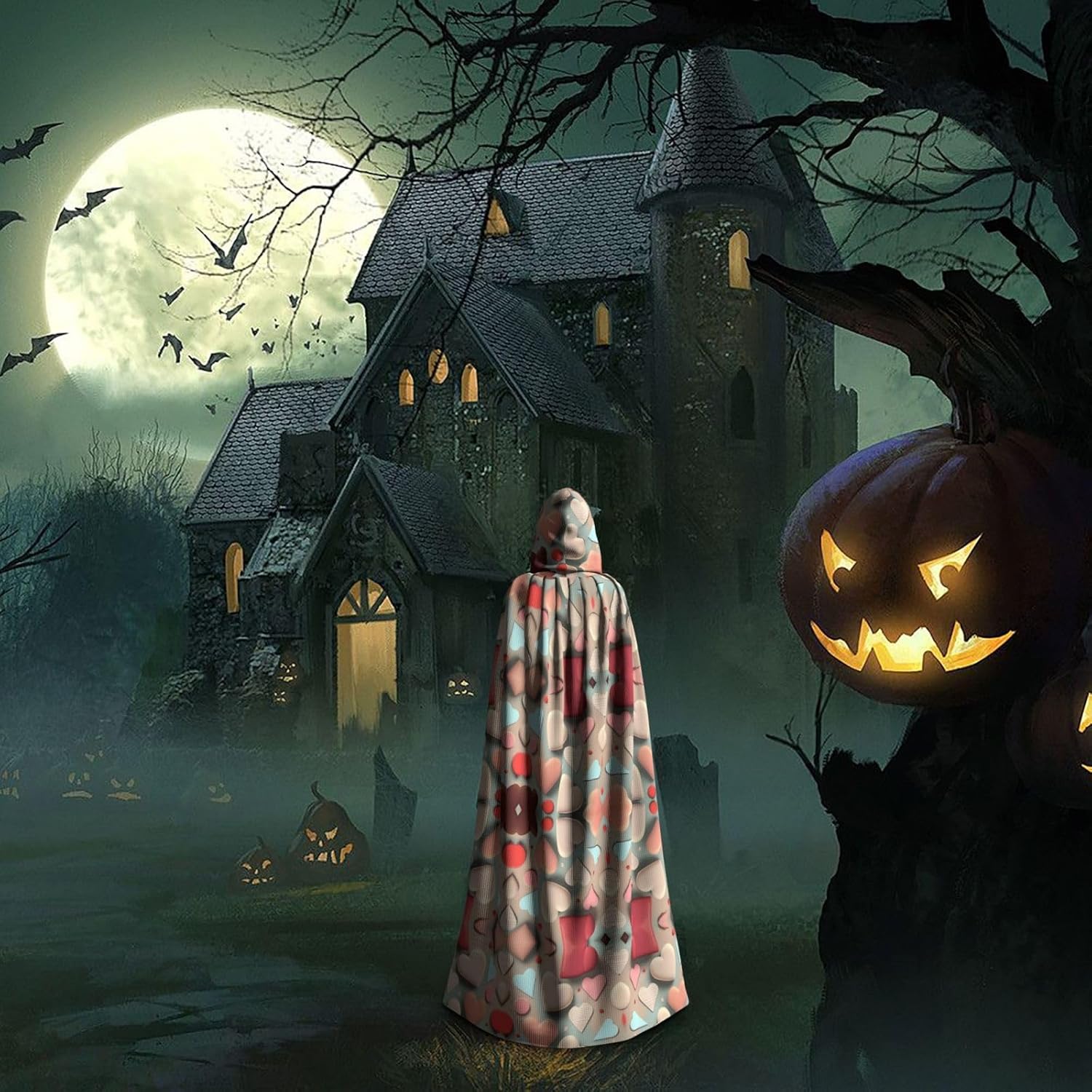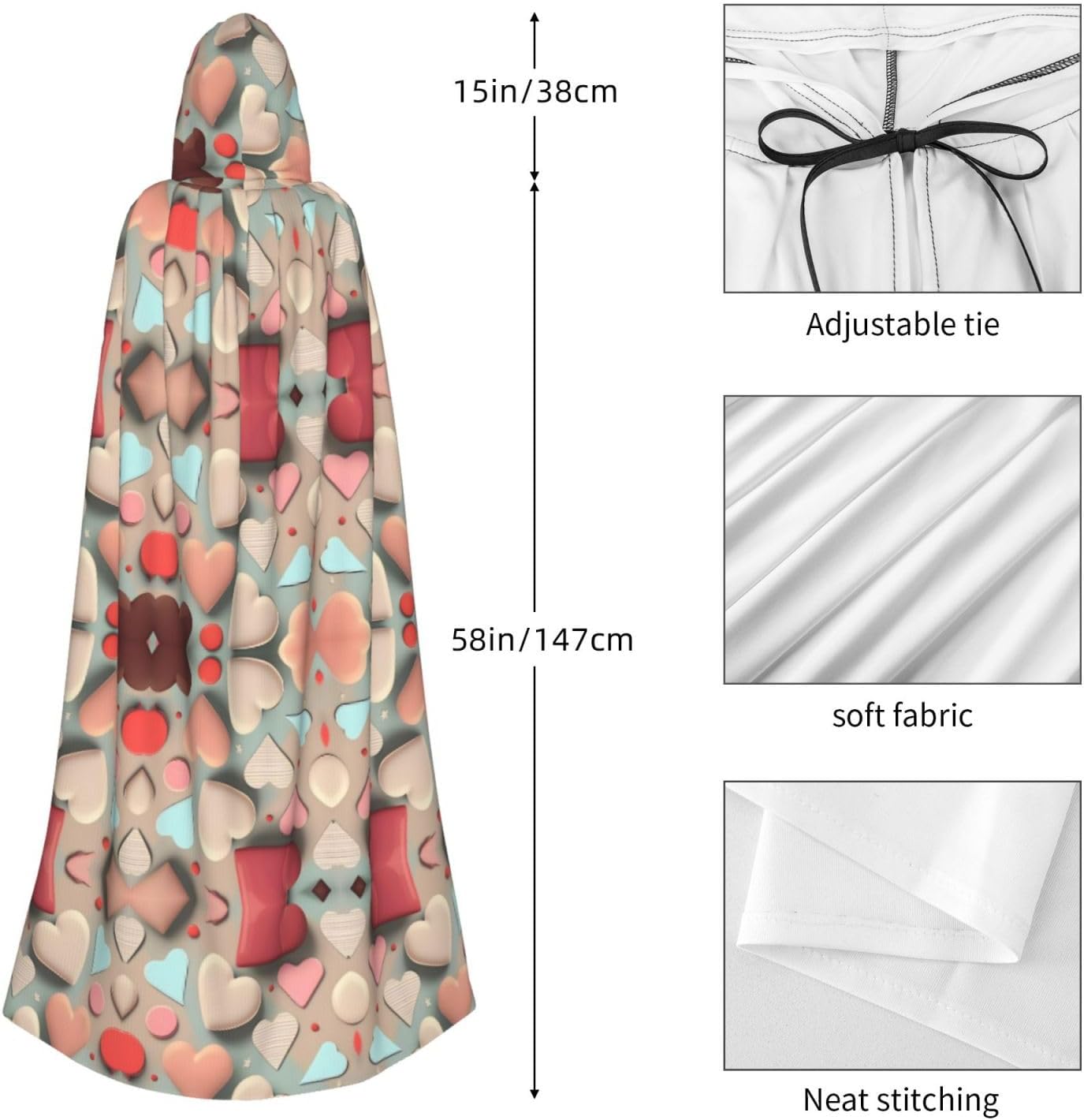 Materiale e design con motivo amore: il tessuto è realizzato in 100% fibra di poliestere (poliestere) tessuto di alta qualità, morbido e confortevole. Il design con cappuccio non è solo elegante e bello, ma fornisce anche calore extra alla testa e al collo. \r Caratteristiche del prodotto: il poncho oversize con cappuccio è un poncho con cappuccio senza lacci, senza cerniera, comodo realizzato in tessuto lungo, resistente e non prurito. \r Dimensioni del prodotto: il cappello misura 38,1 cm di altezza, 147,3 cm di lunghezza, 154 cm di larghezza. \r Adatto per occasioni: feste di Natale, feste di Halloween, feste in costume, celebrazioni pagane. Ideale per travestimenti, cosplay, costumi da scena, streghe, vampiri, royalty, scelta regalo perfetta per amici o familiari. \r Persone applicabili: adulti, unisex.