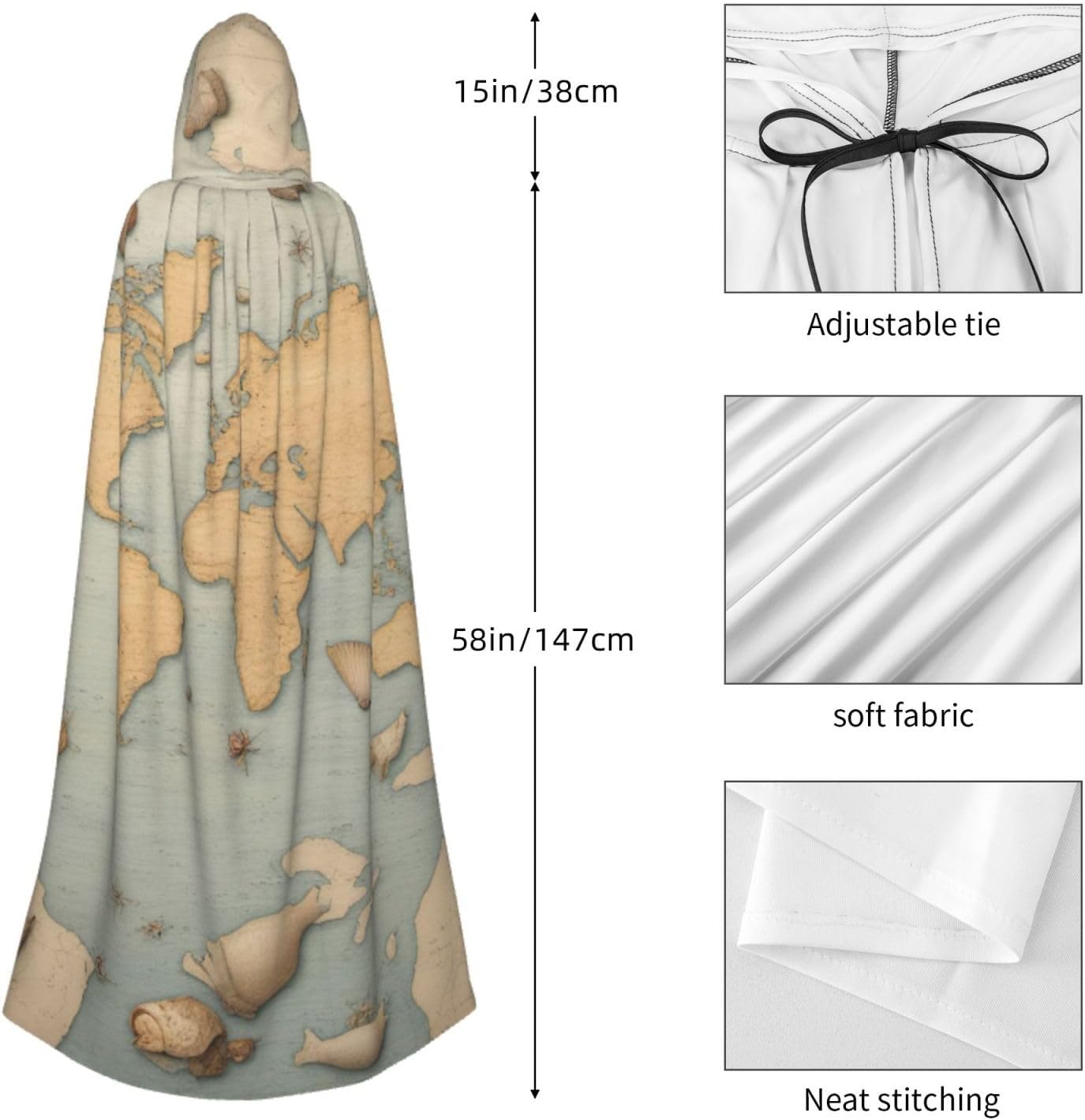 Il design senza cerniera, abbinato a un grande mantello con cappuccio e cravatta al collo, migliora il tuo mistero mantenendoti comodo con il suo tessuto non prurito. Con una lunghezza di 147 cm, larghezza di 154 cm e un'altezza del cappuccio di 38 cm, il nostro mantello con cappuccio con stampa a conchiglia offre una copertura completa, assicurandoti di distinguerti in ogni occasione. Vari eventi come Halloween, cosplay, costumi da palcoscenico, feste a tema, balli, convegni di fumetti e molto altro ancora, il nostro mantello è versatile e conveniente. Facile da mantenere e di lunga durata, il nostro mantello con cappuccio con stampa di conchiglie marine è lavabile in lavatrice e lavabile a mano. Con un design neutro, il nostro mantello è perfetto per uomini e donne.