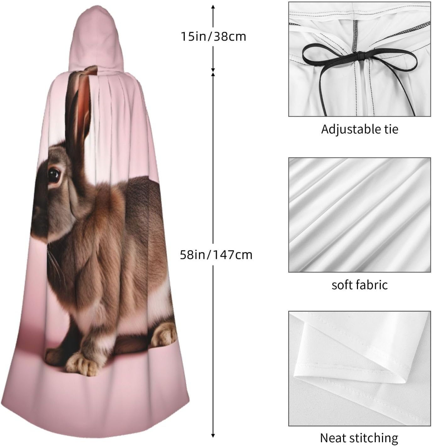 Il design senza cerniera, abbinato a un grande mantello con cappuccio e cravatta al collo, migliora il tuo mistero mantenendoti comodo con il suo tessuto non prurito. Con una lunghezza di 147 cm, larghezza di 154 cm e un'altezza del cappuccio di 38 cm, il nostro simpatico mantello con cappuccio con stampa di conigli offre una copertura completa, assicurandoti di distinguerti in ogni occasione. Vari eventi come Halloween, cosplay, costumi da palcoscenico, feste a tema, balli, convegni di fumetti e molto altro ancora, il nostro mantello è versatile e conveniente. Facile da mantenere e di lunga durata, il nostro simpatico mantello con cappuccio con stampa di conigli è lavabile in lavatrice e lavabile a mano. Con un design neutro, il nostro mantello è perfetto per uomini e donne.