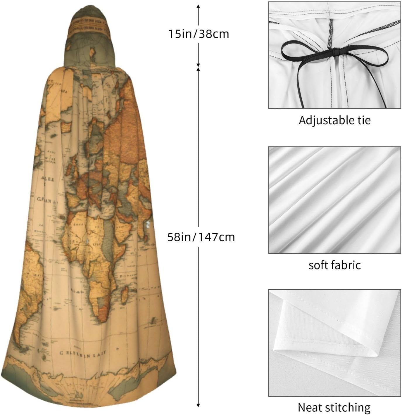 Il design senza cerniera, abbinato a un grande mantello con cappuccio e cravatta al collo, migliora il tuo mistero mantenendoti comodo con il suo tessuto non prurito. Con una lunghezza di 147 cm, larghezza di 154 cm e un'altezza del cappuccio di 38 cm, il nostro mantello con cappuccio con stampa mappa del mondo offre una copertura completa, assicurandoti di distinguerti in ogni occasione. Vari eventi come Halloween, cosplay, costumi da palcoscenico, feste a tema, balli, convegni di fumetti e molto altro ancora, il nostro mantello è versatile e conveniente. Facile da mantenere e di lunga durata, il nostro mantello con cappuccio con stampa mappa del mondo è lavabile in lavatrice e lavabile a mano. Con un design neutro, il nostro mantello è perfetto per uomini e donne.