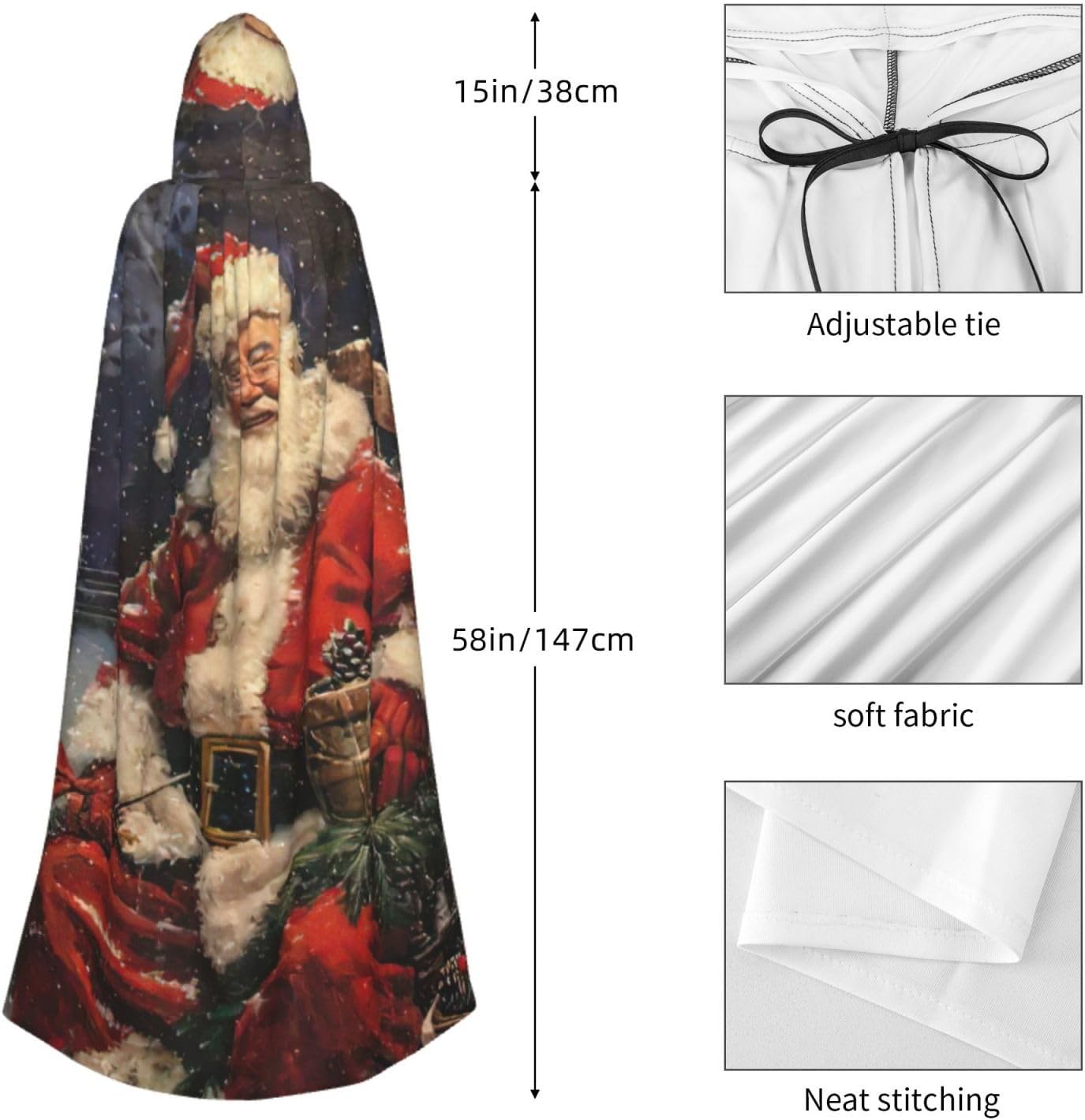 Il design senza cerniera, abbinato a un grande mantello con cappuccio e cravatta al collo, migliora il tuo mistero mantenendoti comodo con il suo tessuto non prurito. Con una lunghezza di 147 cm, larghezza di 154 cm e un'altezza del cappuccio di 38 cm, il nostro mantello con cappuccio con stampa Merry Christmas offre una copertura completa, assicurandoti di distinguerti in ogni occasione. Vari eventi come Halloween, cosplay, costumi da palcoscenico, feste a tema, balli, convegni di fumetti e molto altro ancora, il nostro mantello è versatile e conveniente. Facile da mantenere e di lunga durata, il nostro mantello con cappuccio con stampa Merry Christmas è lavabile in lavatrice e lavabile a mano. Con un design neutro, il nostro mantello è perfetto per uomini e donne.