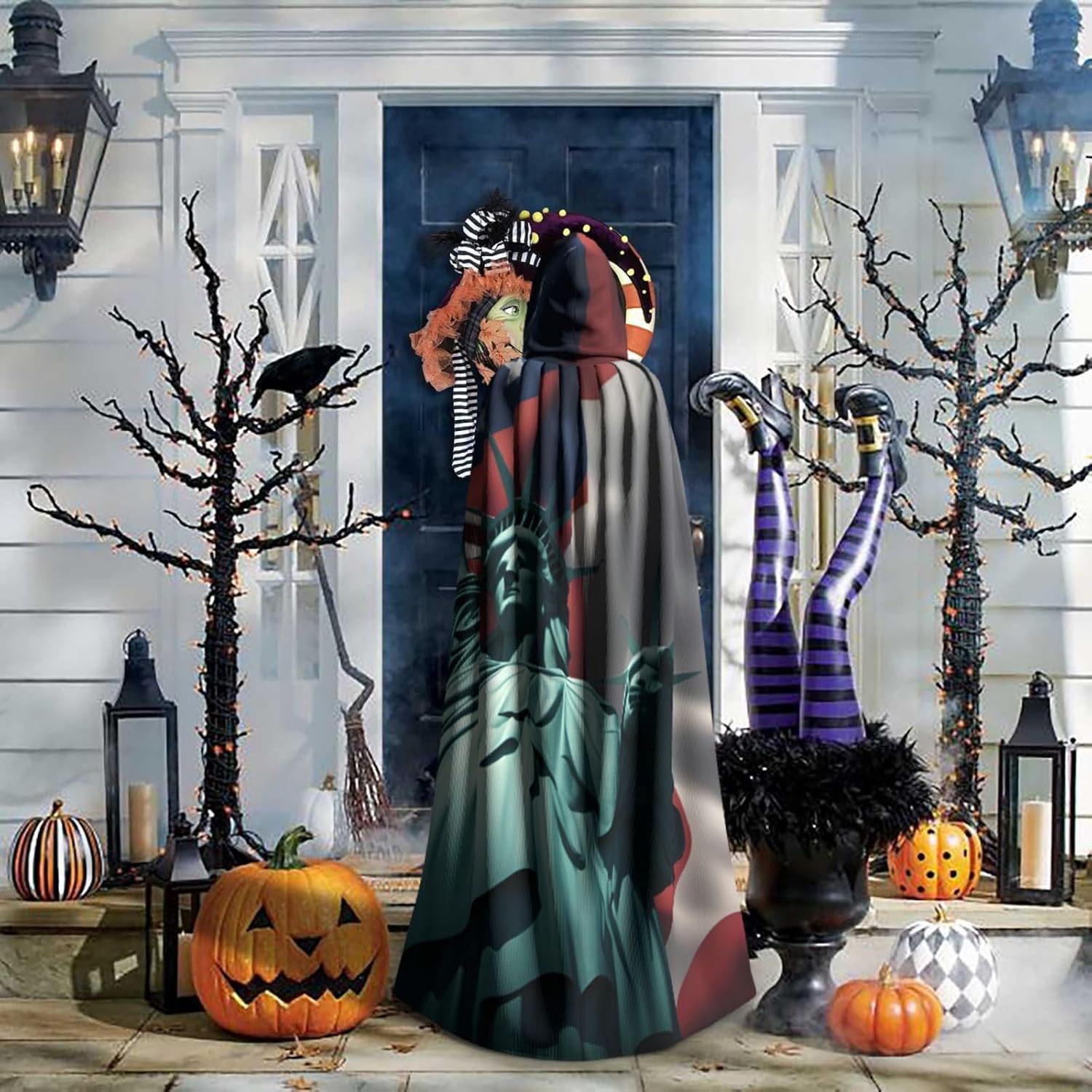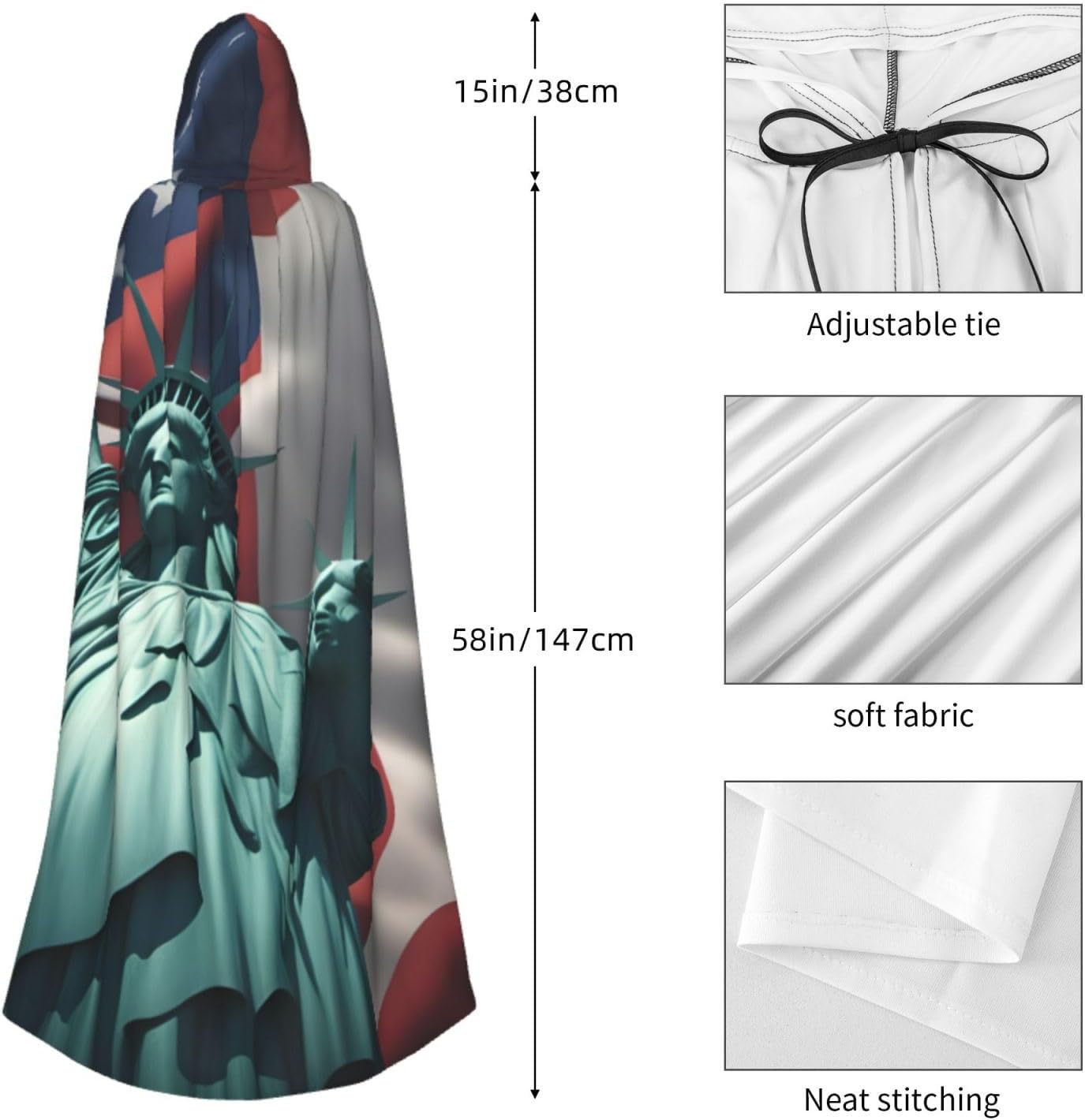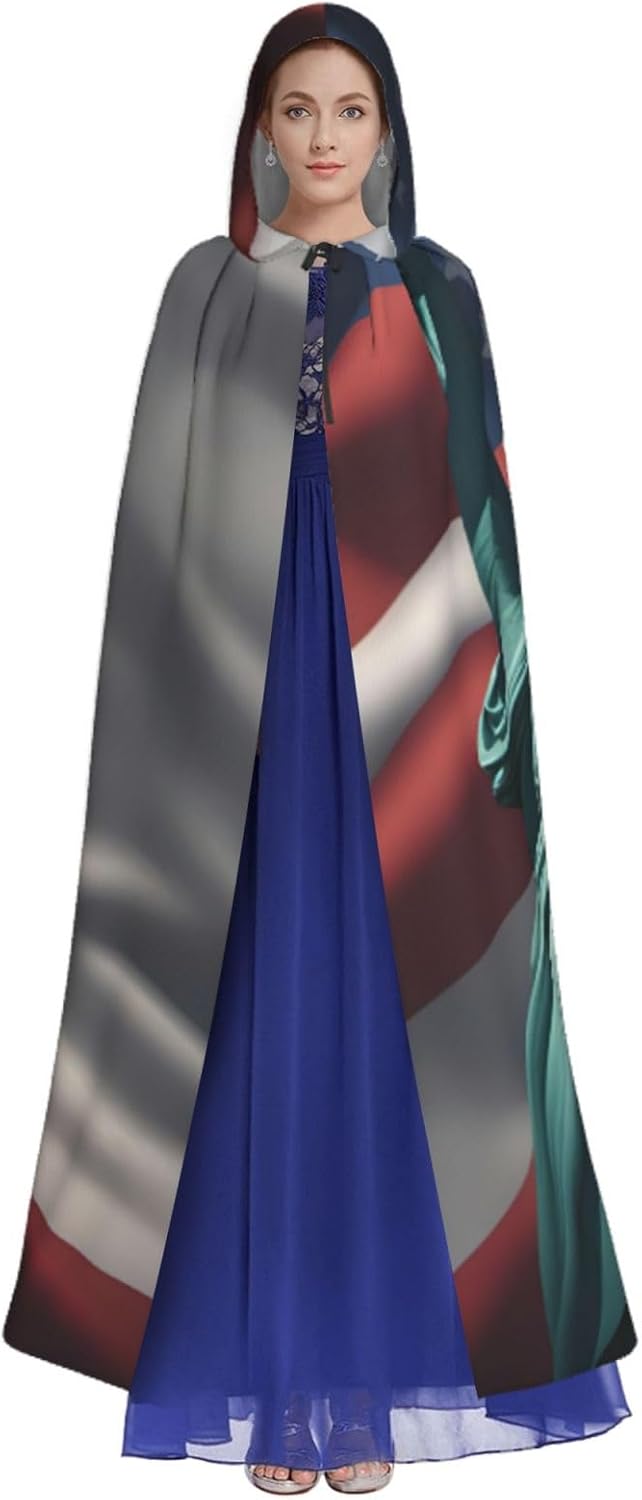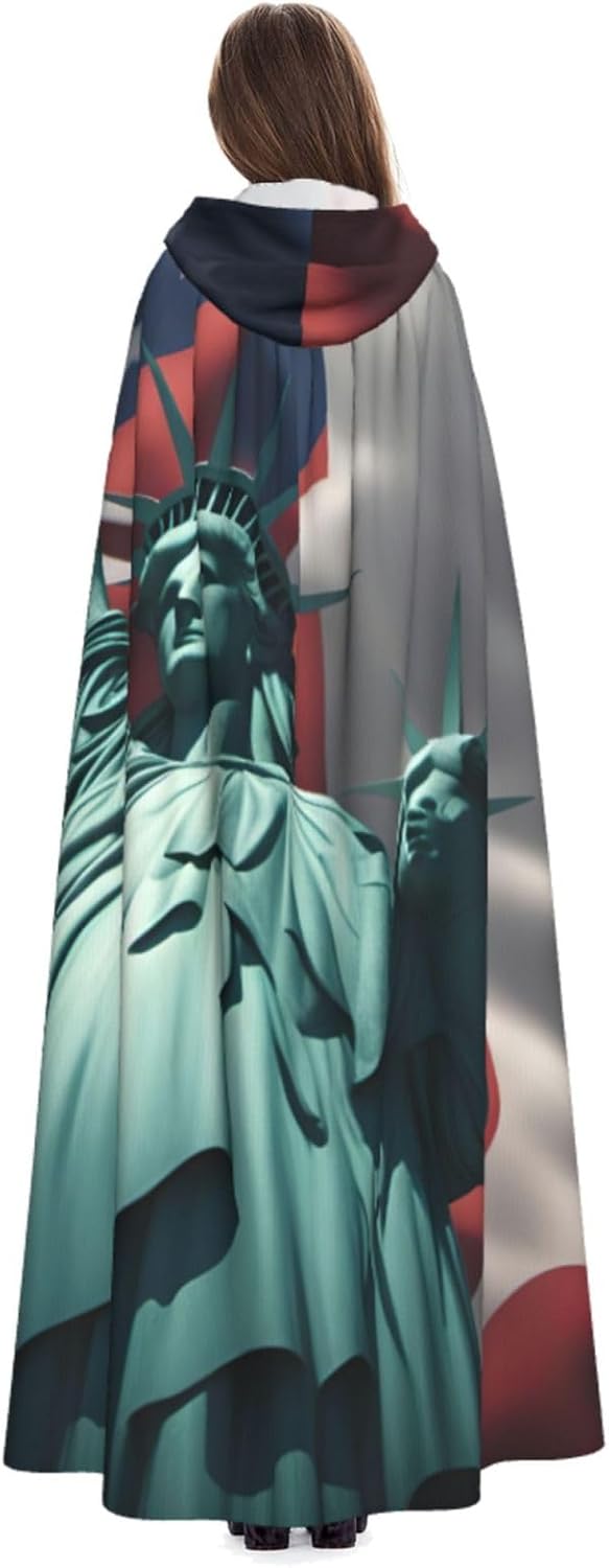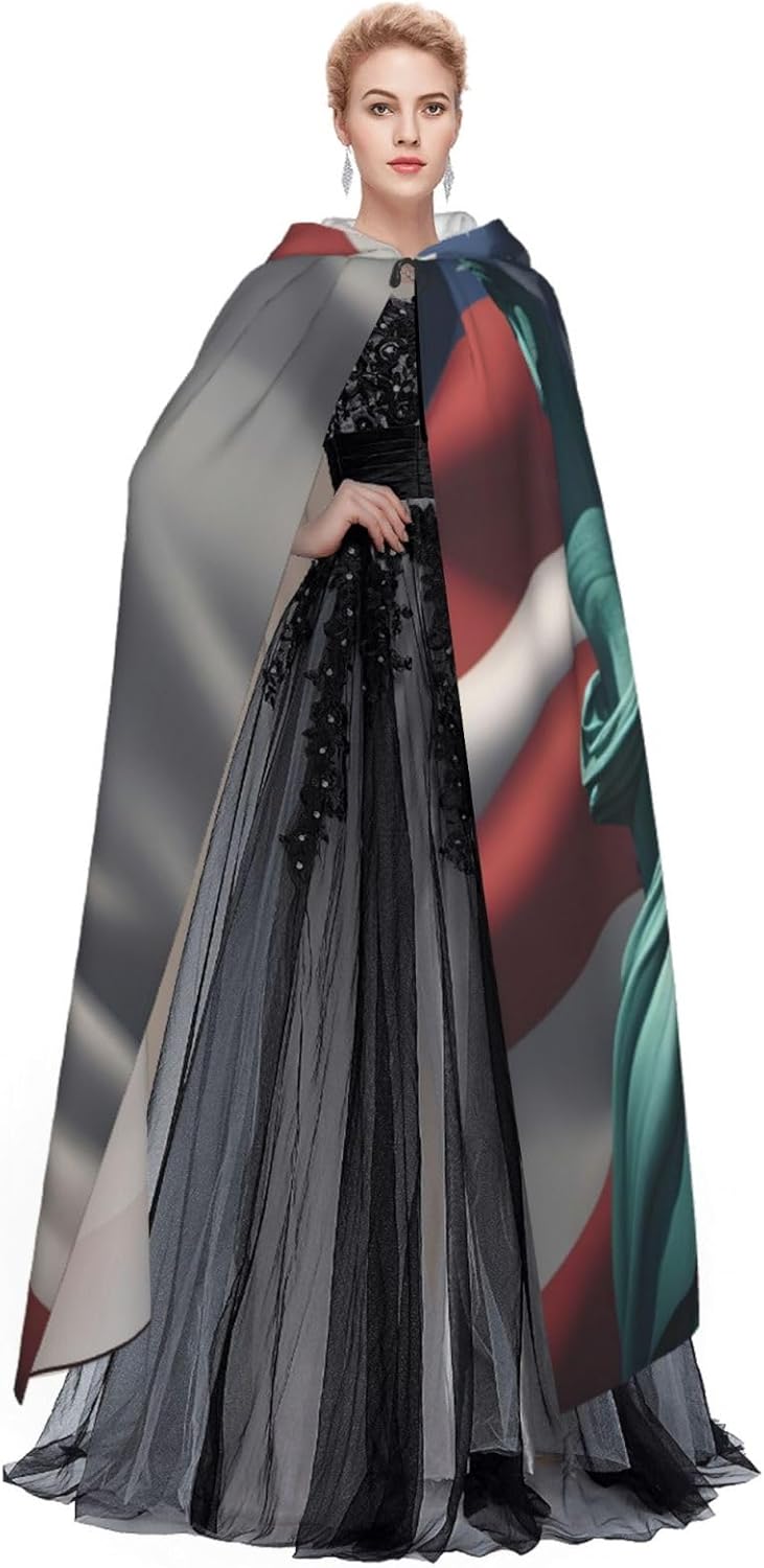 Il design senza cerniera, abbinato a un grande mantello con cappuccio e cravatta al collo, migliora il tuo mistero mantenendoti comodo con il suo tessuto non prurito. Con una lunghezza di 147 cm, larghezza di 154 cm e un'altezza del cappuccio di 38 cm, il nostro mantello con cappuccio con stampa a bandiera della libertà offre una copertura completa, assicurandoti di distinguerti in ogni occasione. Vari eventi come Halloween, cosplay, costumi da palcoscenico, feste a tema, balli, convegni di fumetti e molto altro ancora, il nostro mantello è versatile e conveniente. Facile da mantenere e di lunga durata, il nostro mantello con cappuccio con stampa statua della libertà è lavabile in lavatrice e lavabile a mano. Con un design neutro, il nostro mantello è perfetto per uomini e donne.