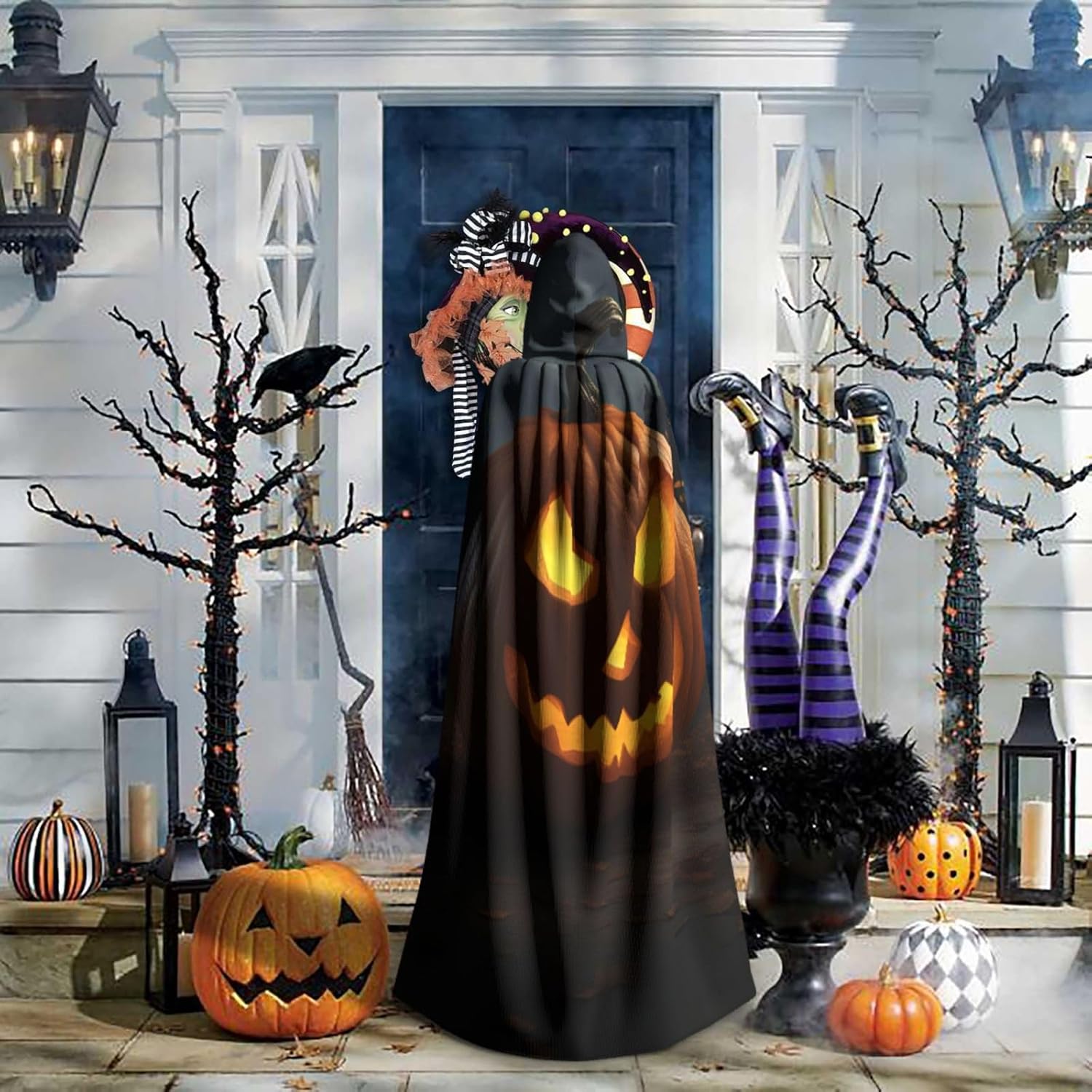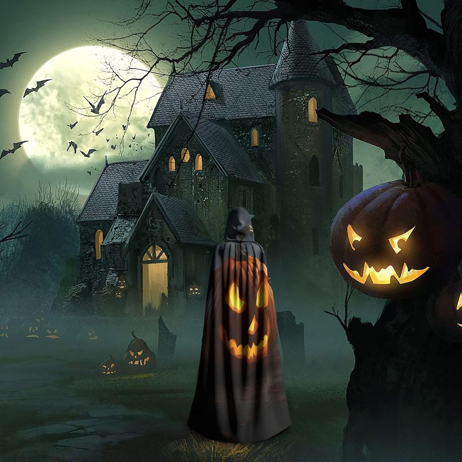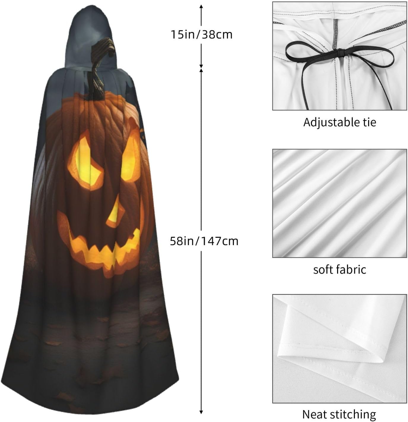 Il design senza cerniera, abbinato a un grande mantello con cappuccio e cravatta al collo, migliora il tuo mistero mantenendoti comodo con il suo tessuto non prurito. Con una lunghezza di 147 cm, larghezza di 154 cm e un'altezza del cappuccio di 38 cm, il nostro mantello con cappuccio con stampa zucca di Halloween offre una copertura completa, assicurandoti di distinguerti in ogni occasione. Vari eventi come Halloween, cosplay, costumi da palcoscenico, feste a tema, balli, convegni di fumetti e molto altro ancora, il nostro mantello è versatile e conveniente. Facile da mantenere e di lunga durata, il nostro mantello con cappuccio con stampa zucca di Halloween è lavabile in lavatrice e lavabile a mano. Con un design neutro, il nostro mantello è perfetto per uomini e donne.