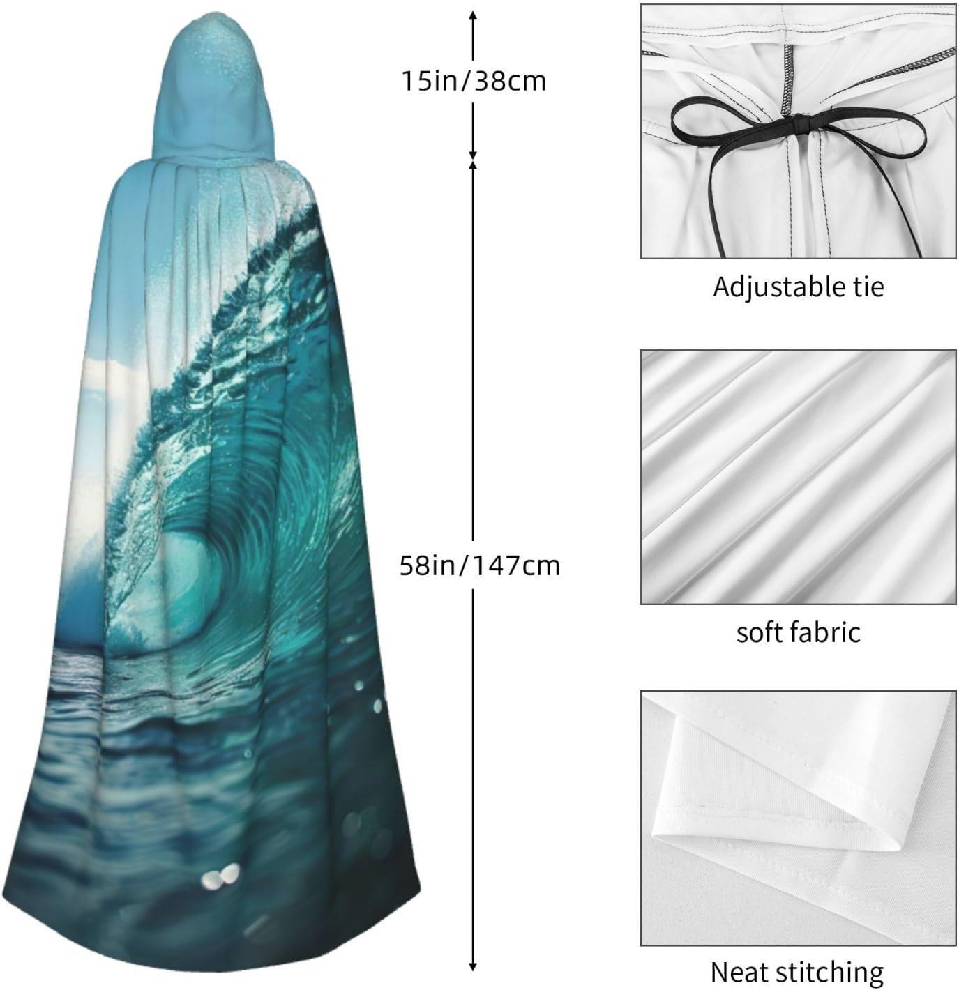 Il design senza cerniera, abbinato a un grande mantello con cappuccio e cravatta al collo, migliora il tuo mistero mantenendoti comodo con il suo tessuto non prurito. Con una lunghezza di 147 cm, larghezza di 154 cm e un'altezza del cappuccio di 38 cm, il nostro mantello con cappuccio con stampa a onde verde oceano offre una copertura completa, assicurandoti di distinguerti in ogni occasione. Vari eventi come Halloween, cosplay, costumi da palcoscenico, feste a tema, balli, convegni di fumetti e molto altro ancora, il nostro mantello è versatile e conveniente. Facile da mantenere e di lunga durata, il nostro mantello con cappuccio con stampa a onde verde oceano è lavabile in lavatrice e lavabile a mano. Con un design neutro, il nostro mantello è perfetto per uomini e donne.