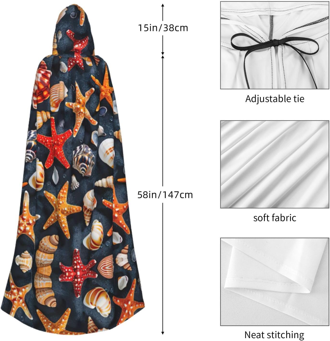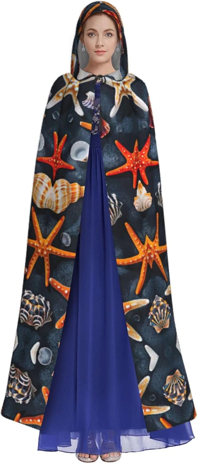 Il design senza cerniera, abbinato a un grande mantello con cappuccio e cravatta al collo, migliora il tuo mistero mantenendoti comodo con il suo tessuto non prurito. Con una lunghezza di 147 cm, larghezza di 154 cm e un'altezza del cappuccio di 38 cm, il nostro mantello con cappuccio con stampa a stelle marine e conchiglie offre una copertura completa, assicurandoti di distinguerti in ogni occasione. Vari eventi come Halloween, cosplay, costumi da palcoscenico, feste a tema, balli, convegni di fumetti e molto altro ancora, il nostro mantello è versatile e conveniente. Facile da mantenere e di lunga durata, il nostro mantello con cappuccio con stampa di stelle marine e conchiglie è lavabile in lavatrice e lavabile a mano. Con un design neutro, il nostro mantello è perfetto per uomini e donne.