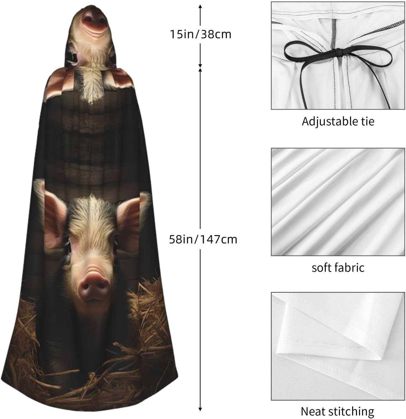 Il design senza cerniera, abbinato a un grande mantello con cappuccio e cravatta al collo, migliora il tuo mistero mantenendoti comodo con il suo tessuto non prurito. Con una lunghezza di 147 cm, una larghezza di 154 cm e un'altezza del cappuccio di 38 cm, il nostro mantello con cappuccio con stampa animale della fattoria offre una copertura completa, assicurandoti di distinguerti in ogni occasione. Vari eventi come Halloween, cosplay, costumi da palcoscenico, feste a tema, balli, convegni di fumetti e molto altro ancora, il nostro mantello è versatile e conveniente. Facile da mantenere e di lunga durata, il nostro mantello con cappuccio con stampa animali da fattoria è lavabile in lavatrice e lavabile a mano. Con un design neutro, il nostro mantello è perfetto per uomini e donne.