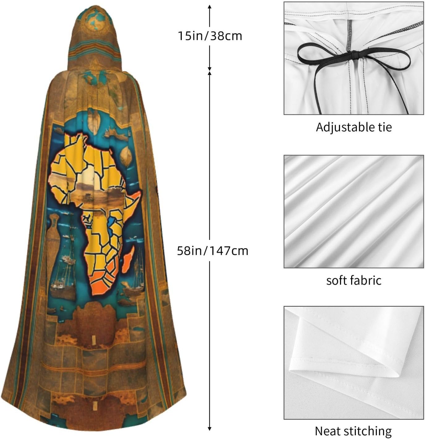 Il design senza cerniera, abbinato a un grande mantello con cappuccio e cravatta al collo, migliora il tuo mistero mantenendoti comodo con il suo tessuto non prurito. Con una lunghezza di 147 cm, larghezza di 154 cm e un'altezza del cappuccio di 38 cm, il nostro mantello con cappuccio con stampa astratta con mappa del mondo offre una copertura completa, assicurandoti di distinguerti in ogni occasione. Vari eventi come Halloween, cosplay, costumi da palcoscenico, feste a tema, balli, convegni di fumetti e molto altro ancora, il nostro mantello è versatile e conveniente. Facile da mantenere e di lunga durata, il nostro mantello con cappuccio con stampa astratta con mappa del mondo è lavabile in lavatrice e lavabile a mano. Con un design neutro, il nostro mantello è perfetto per uomini e donne.
