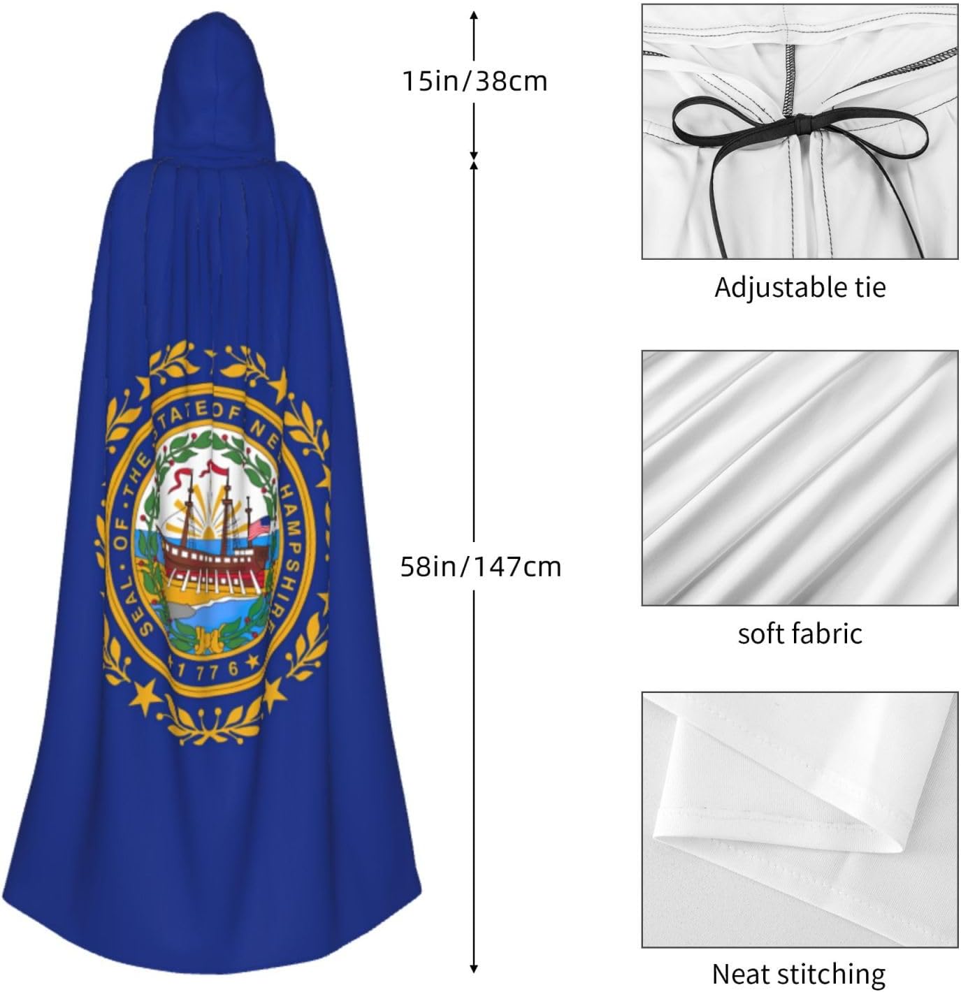 Il design senza cerniera, abbinato a un grande mantello con cappuccio e cravatta al collo, migliora il tuo mistero mantenendoti comodo con il suo tessuto non prurito. Con una lunghezza di 147 cm, larghezza di 154 cm e un'altezza del cappuccio di 38 cm, il nostro mantello con cappuccio con stampa bandiera del New Hampshire offre una copertura completa, assicurandoti di distinguerti in ogni occasione. Vari eventi come Halloween, cosplay, costumi da palcoscenico, feste a tema, balli, convegni di fumetti e molto altro ancora, il nostro mantello è versatile e conveniente. Facile da mantenere e di lunga durata, il nostro mantello con cappuccio con stampa bandiera dello stato del New Hampshire è lavabile in lavatrice e lavabile a mano. Con un design neutro, il nostro mantello è perfetto per uomini e donne.
